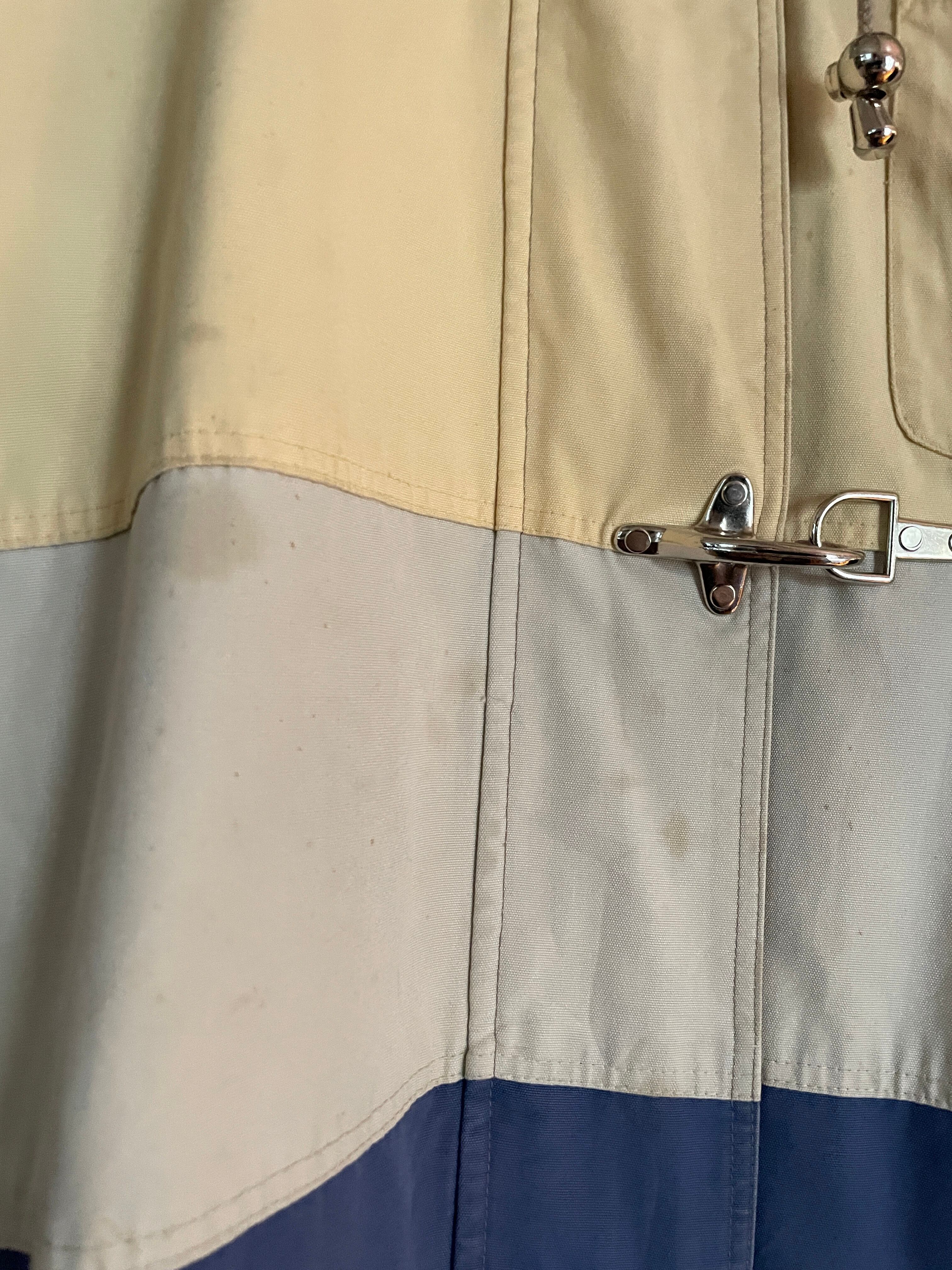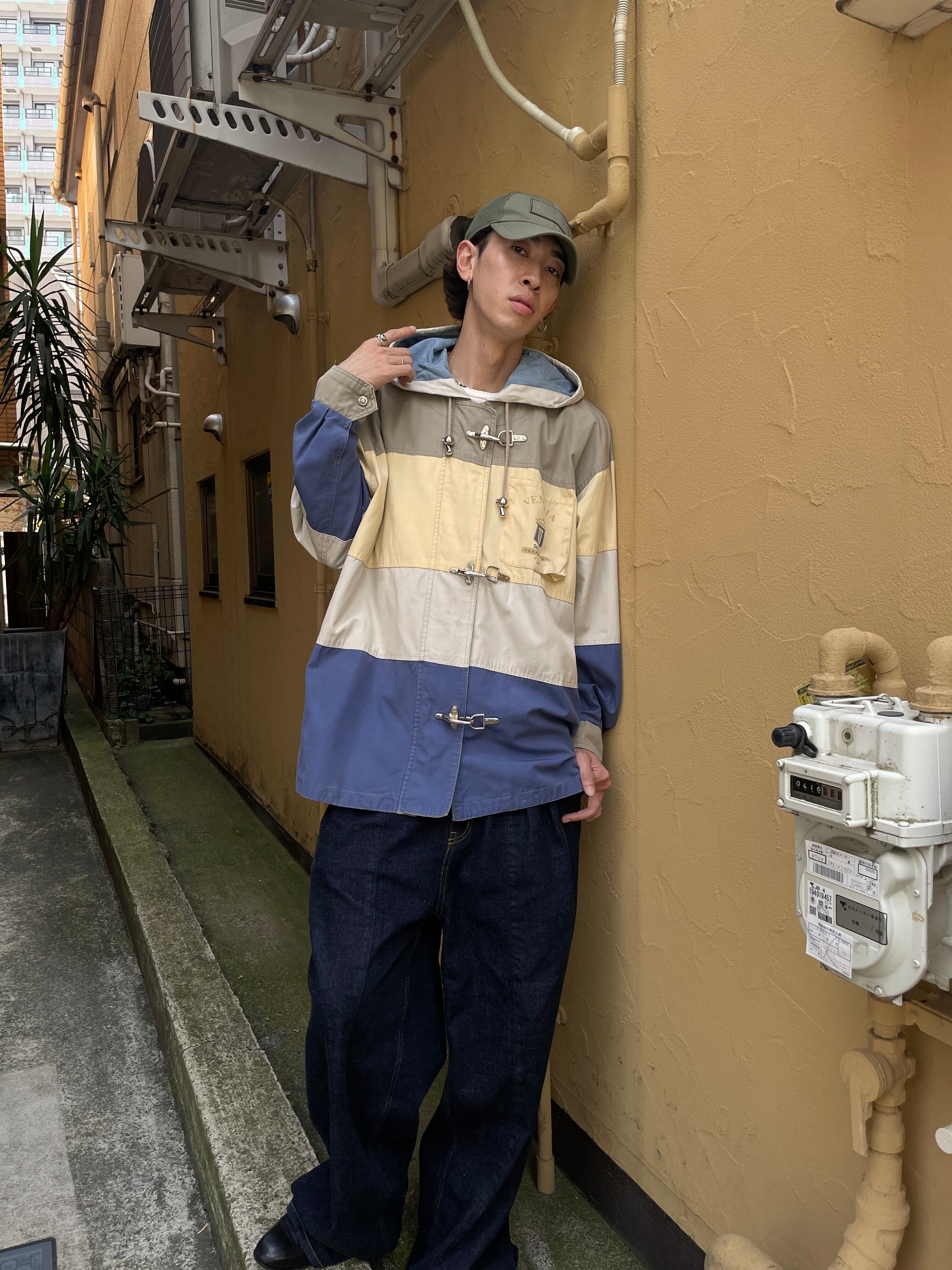 渋さのあるマルチカラーデザインがお洒落な、ファイアーマンジャケット。バック、胸ポケットには、イタリアのヴィネツィアラインのプリント。しっかりとしたファイアーマンフックがグッドです。前合わせが二重になっているのもポイントが高いです。まさにこれからの季節一軍入りしそうなジャケットです。