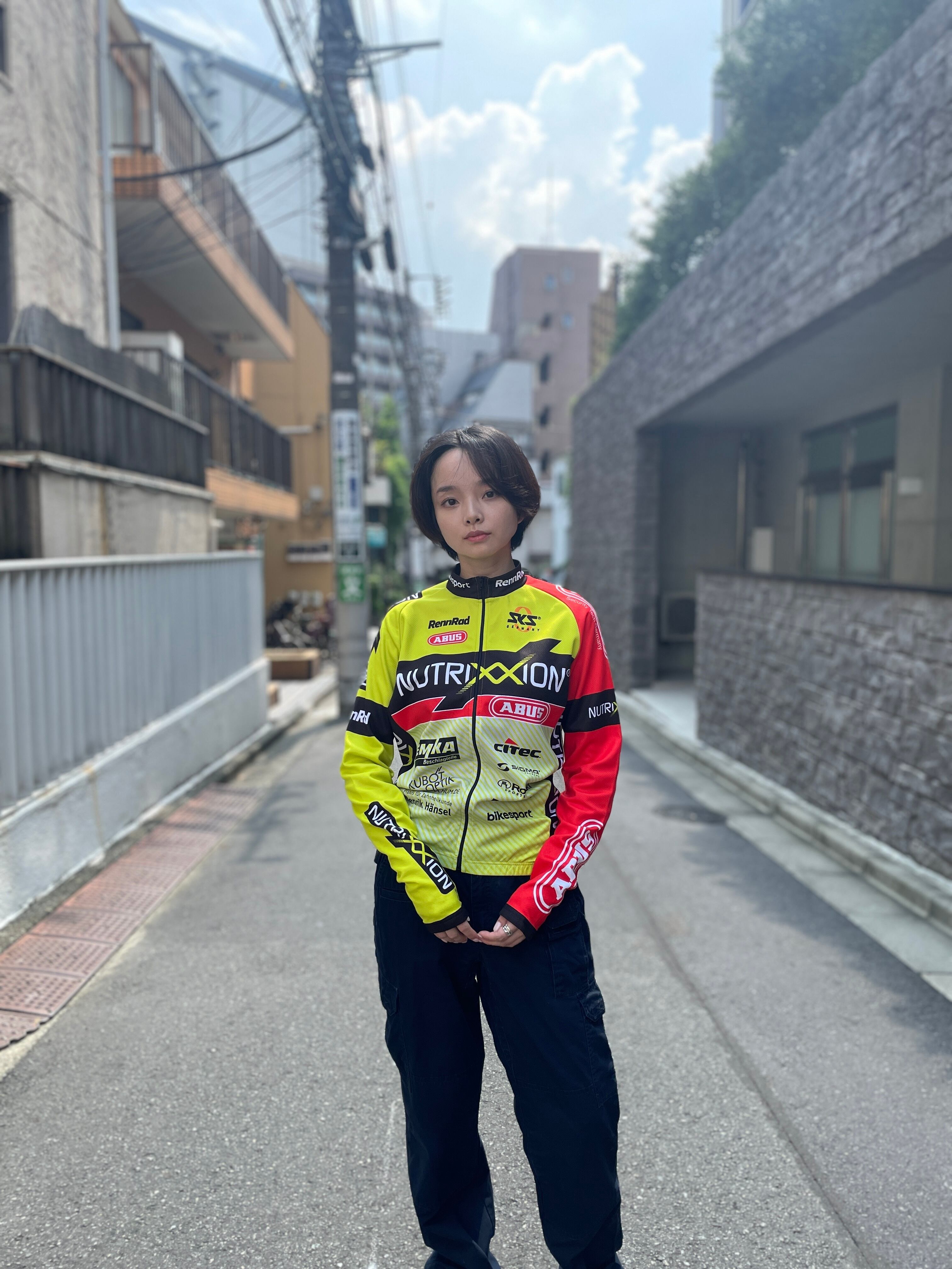 ドイツのサイクリングショップ”NUTRIXXION"とスポンサープリントが全体的にデザインされた、サイクリングジャージ。明るい蛍光イエローボディ。両袖で色が違うのがグッド。フルジップタイプで、伸びの良い素材感です。一枚でももちろん、秋冬にはインナーの差し色としても活躍してくれそうです。