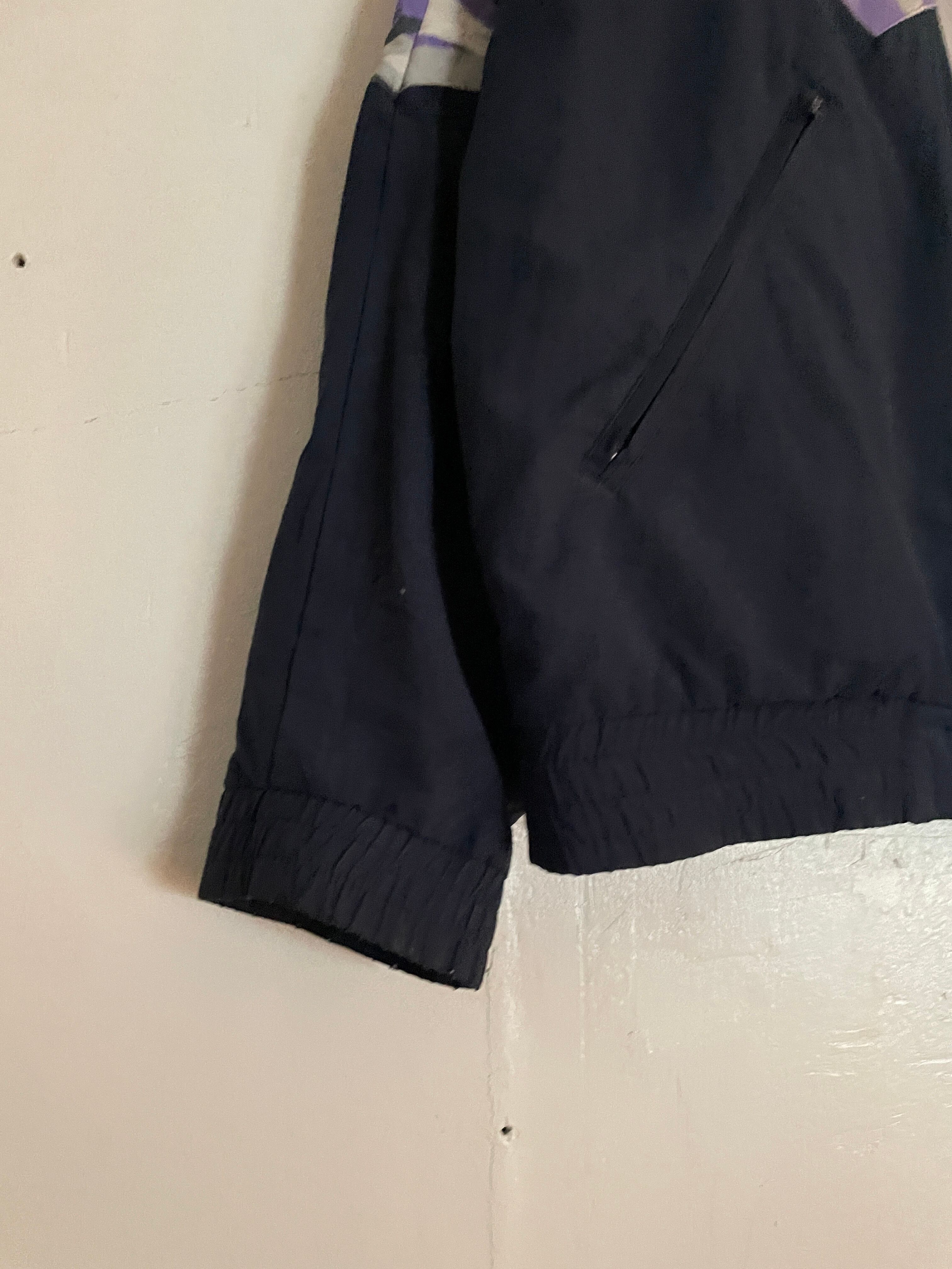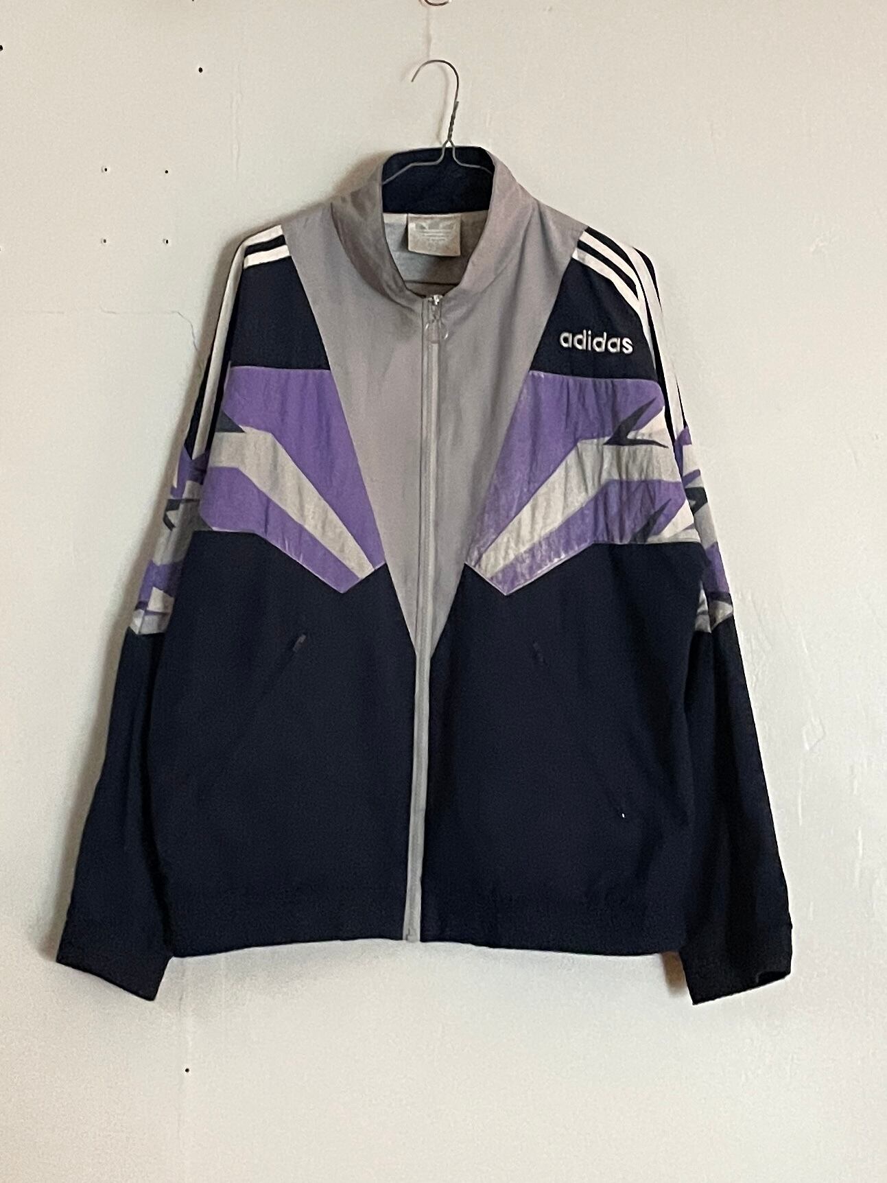 グレー、ネイビーボディーに、別府で取り付けられたような柄デザインが魅力的な、アディダスのポリエステルトラックジャケット。フロント部分から袖にかけての、ややスレたデザインがグッドです。ジップもアクセっぽくて可愛らしいです。スポーティ過ぎず、良いバランス感のある一着です。男女共におすすめできる良いサイズ感。秋冬には主役になってくれそうなアイテムです。