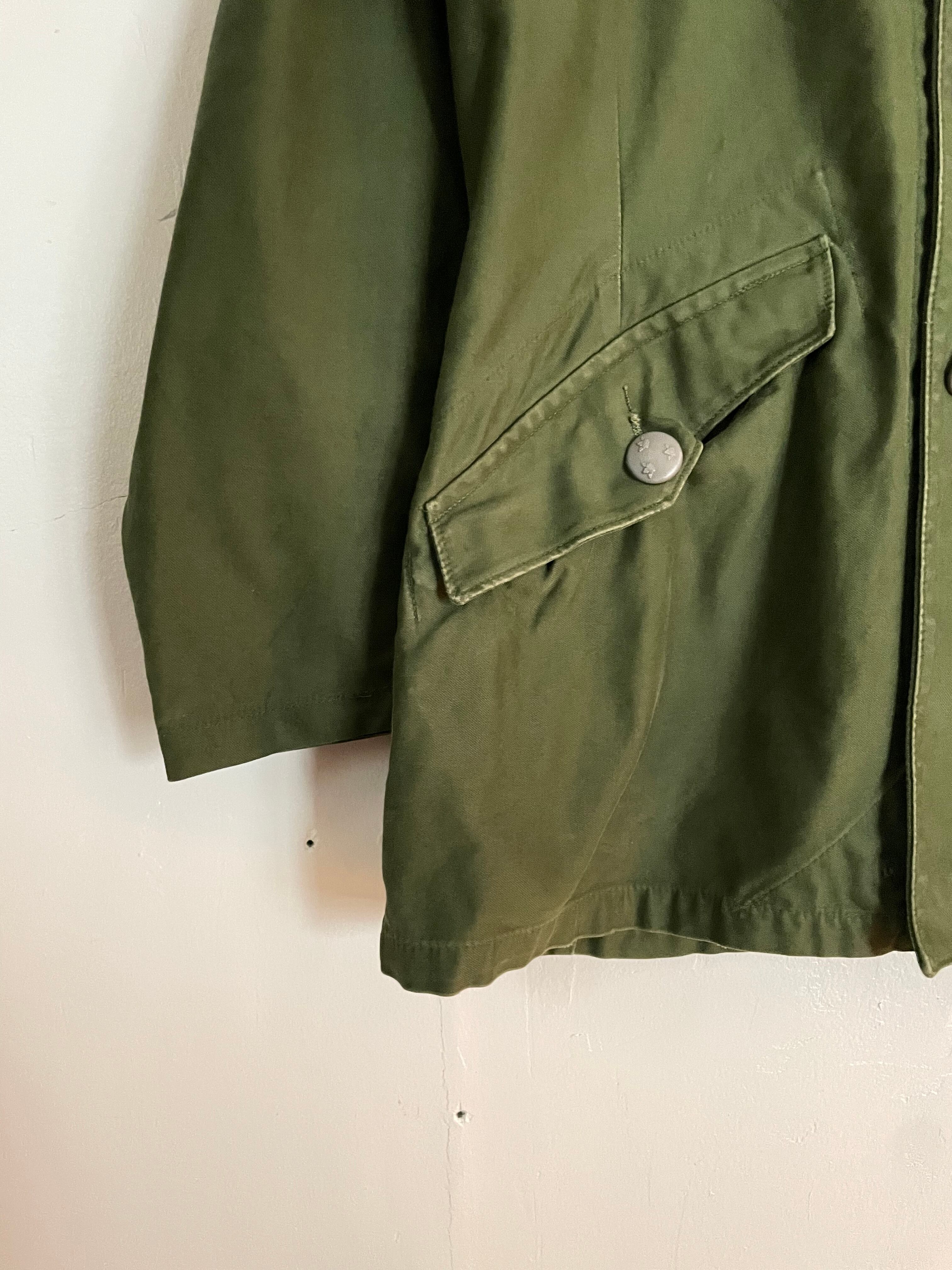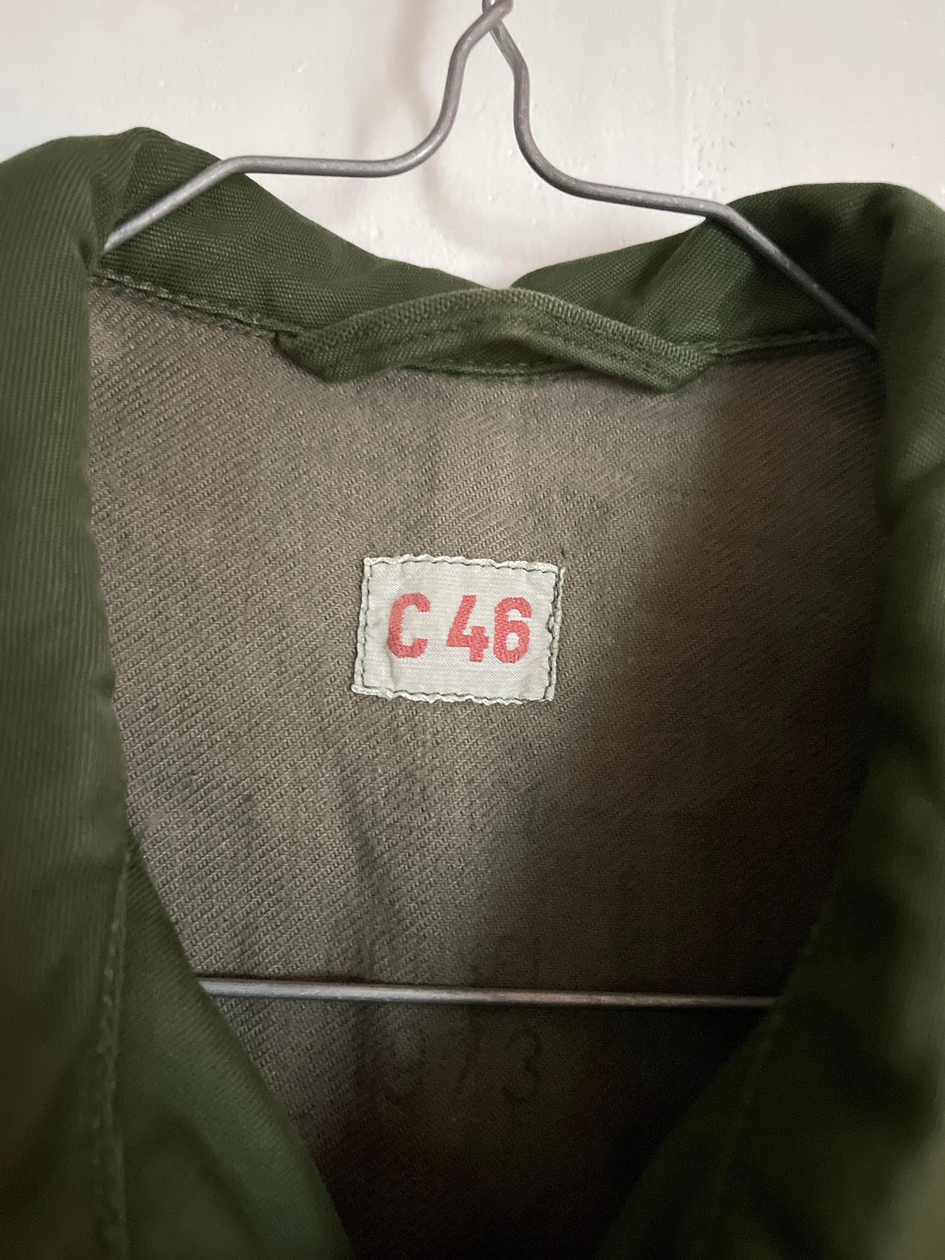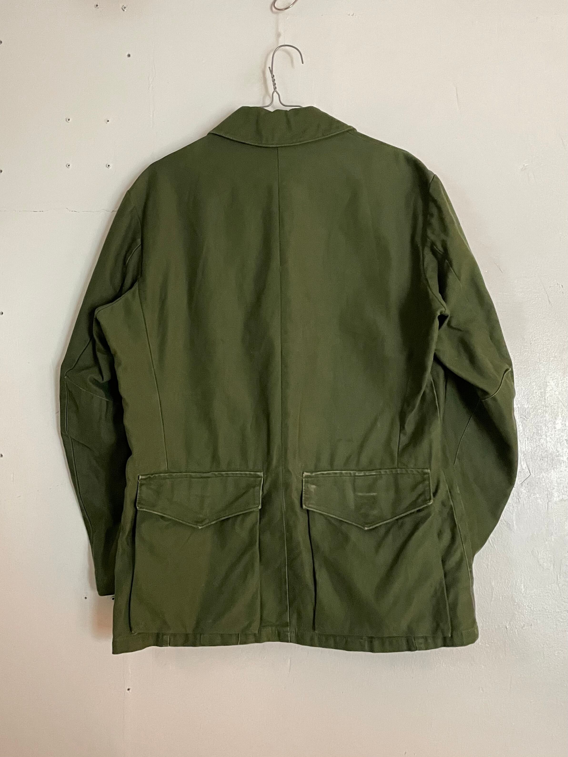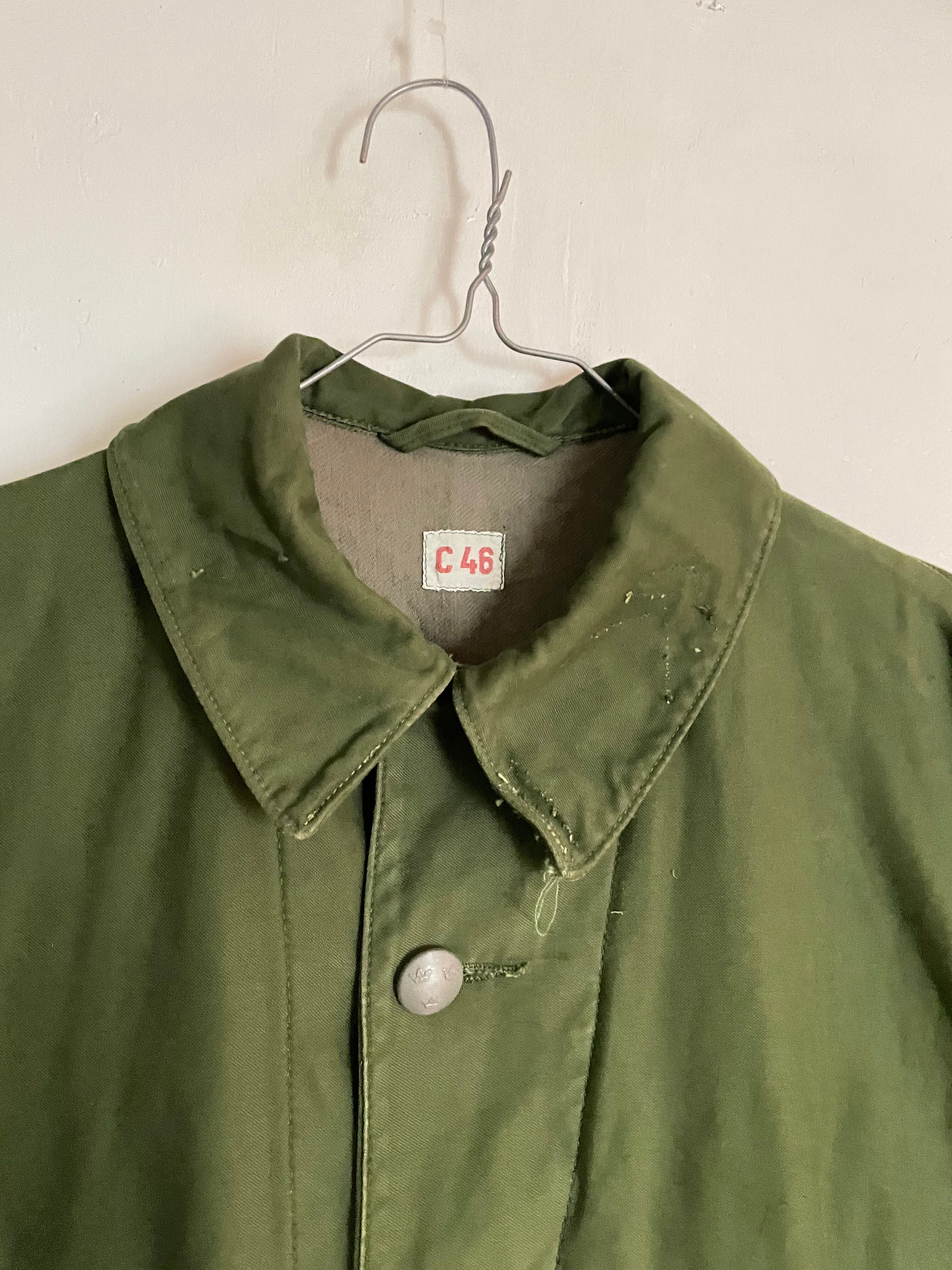 スウェーデン軍のM-59フィールドジャケット。1959年に正式採用、80年代頃まで製造されていました。こちらは1973年のもの。カーキのボディにグレーのボタン、全体的にすっきりとしたシルエットは、ユーロミリタリーならではです。特徴的なのはバックにポケットが2つ付いていること。機能性もしっかりと考慮された作りになっています。襟に多少のダメージがありますが気になりません。