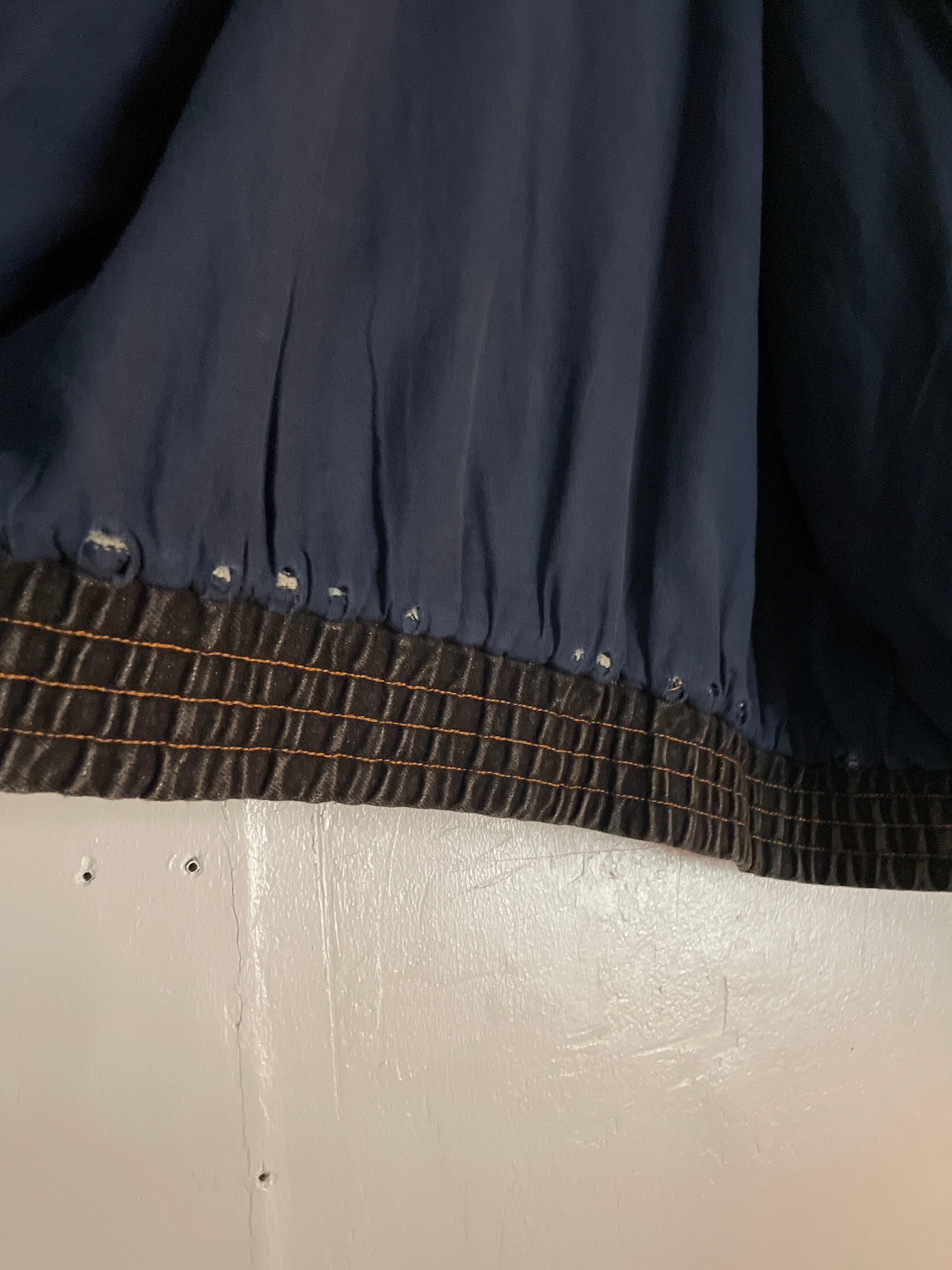 ブルーのデニム生地をベースに、大胆な切替えデザインがお洒落なジャケット。袖縫い目の無い、ドルマンスリーブ仕様です。ハイネックに作られた襟の先端部分には合成皮革が使われています。中綿入りでボリュームのあるシルエット、丈が長過ぎないのもポイントです。裏地裾部分にダメージが見られます。