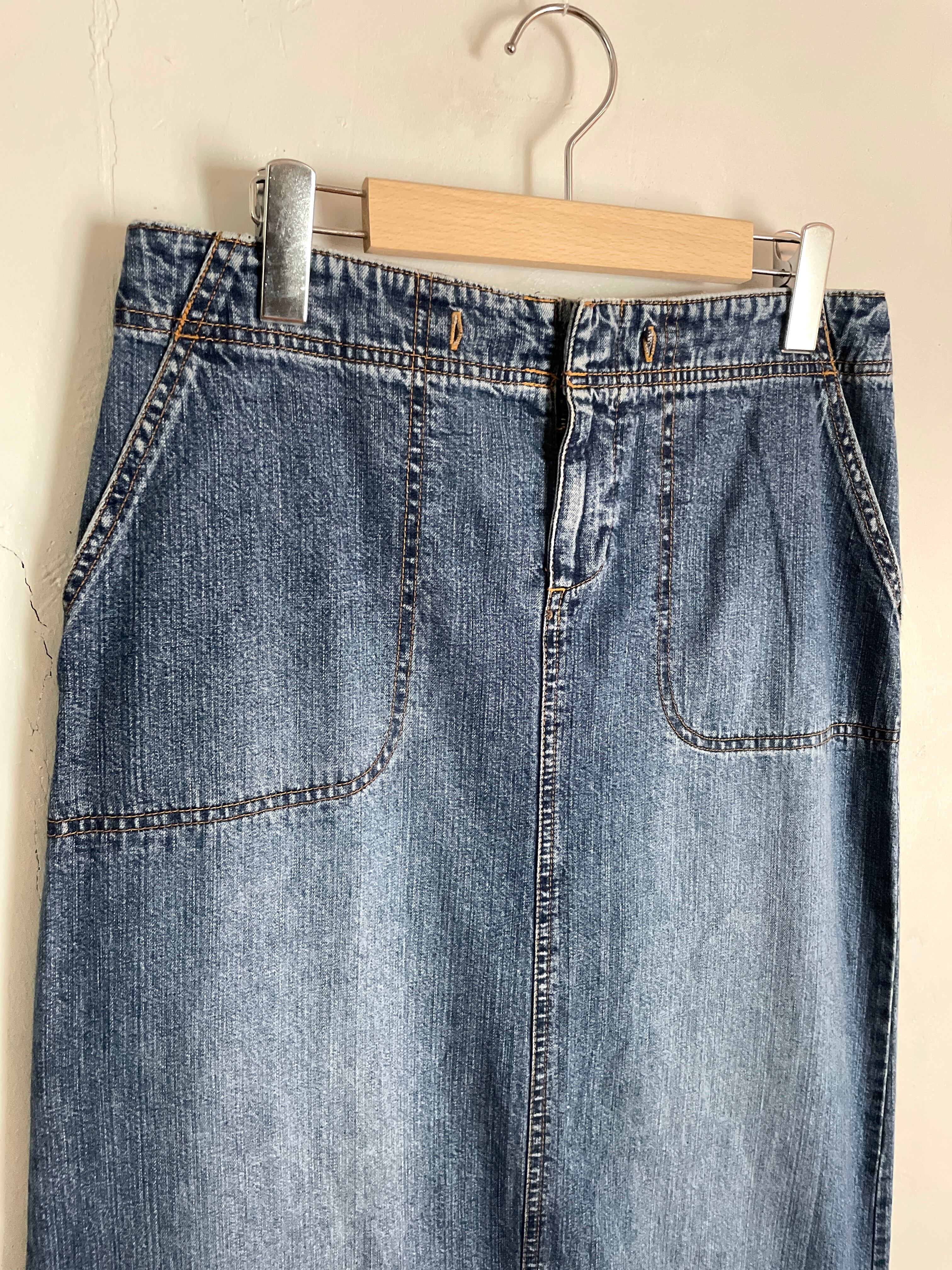 ロング丈でシンプルなデザインのデニムスカートはオールドネイビーのもの。前後2つずつのポケット付きで、後ろ中心には長めのスリットが入った便利な仕様です。前開きには短めのジップ付き。どんなアイテムとも相性の良い、派手さはありませんが持っていて損はないアイテムかと思います。ウエスト部分のドローコードが欠損しています。
