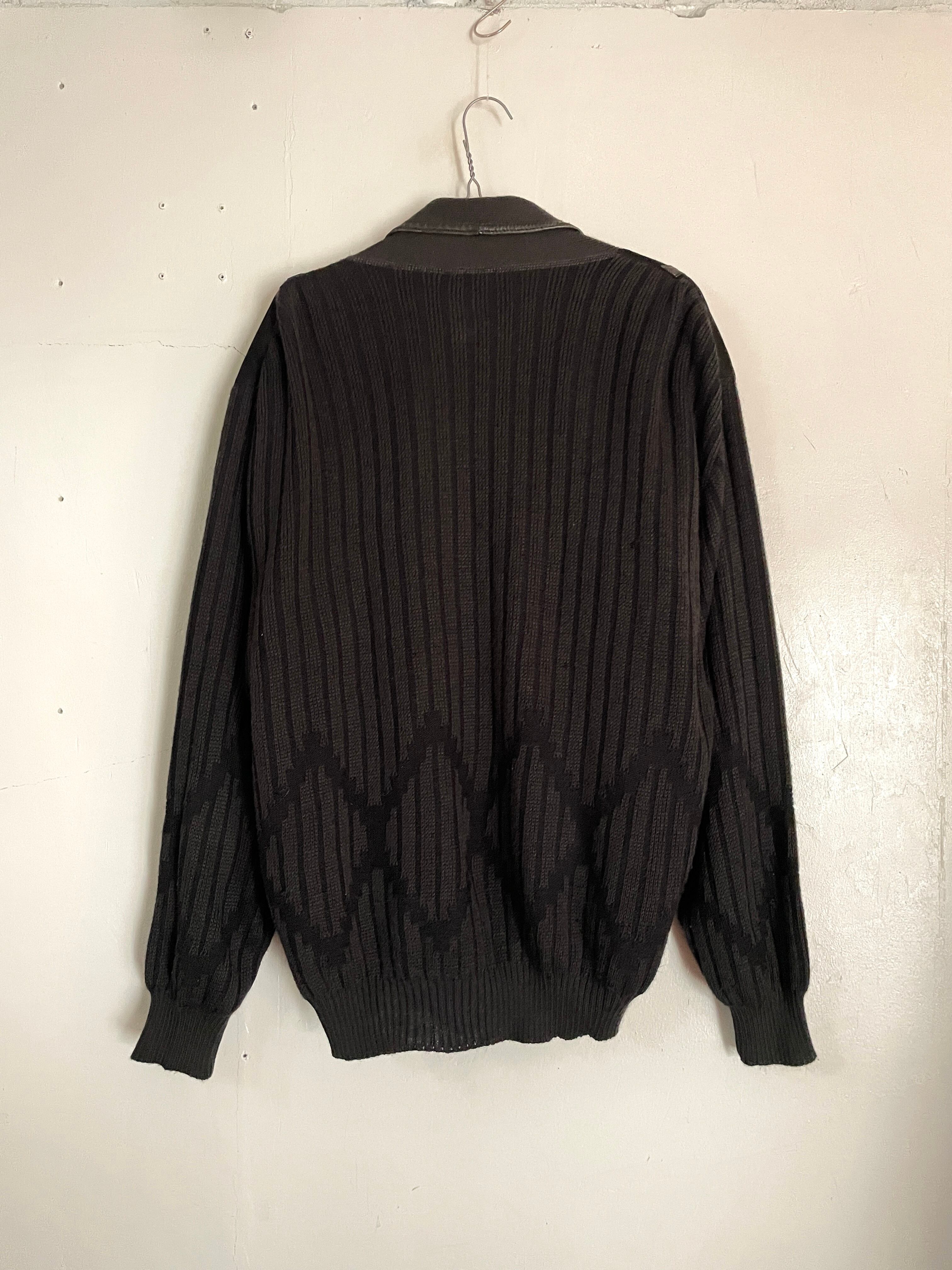 黒のニットをベースに、部分的にレザーが使われたデザインカーディガン。ショールカラーで綺麗めな雰囲気です。ニット部分もよく見ると、編みによって柄が部分的に入っています。前身頃には裏地が付いていて、片方にはポケット付き。全体的にゆったりとしたシルエット、イタリア製の1着です。