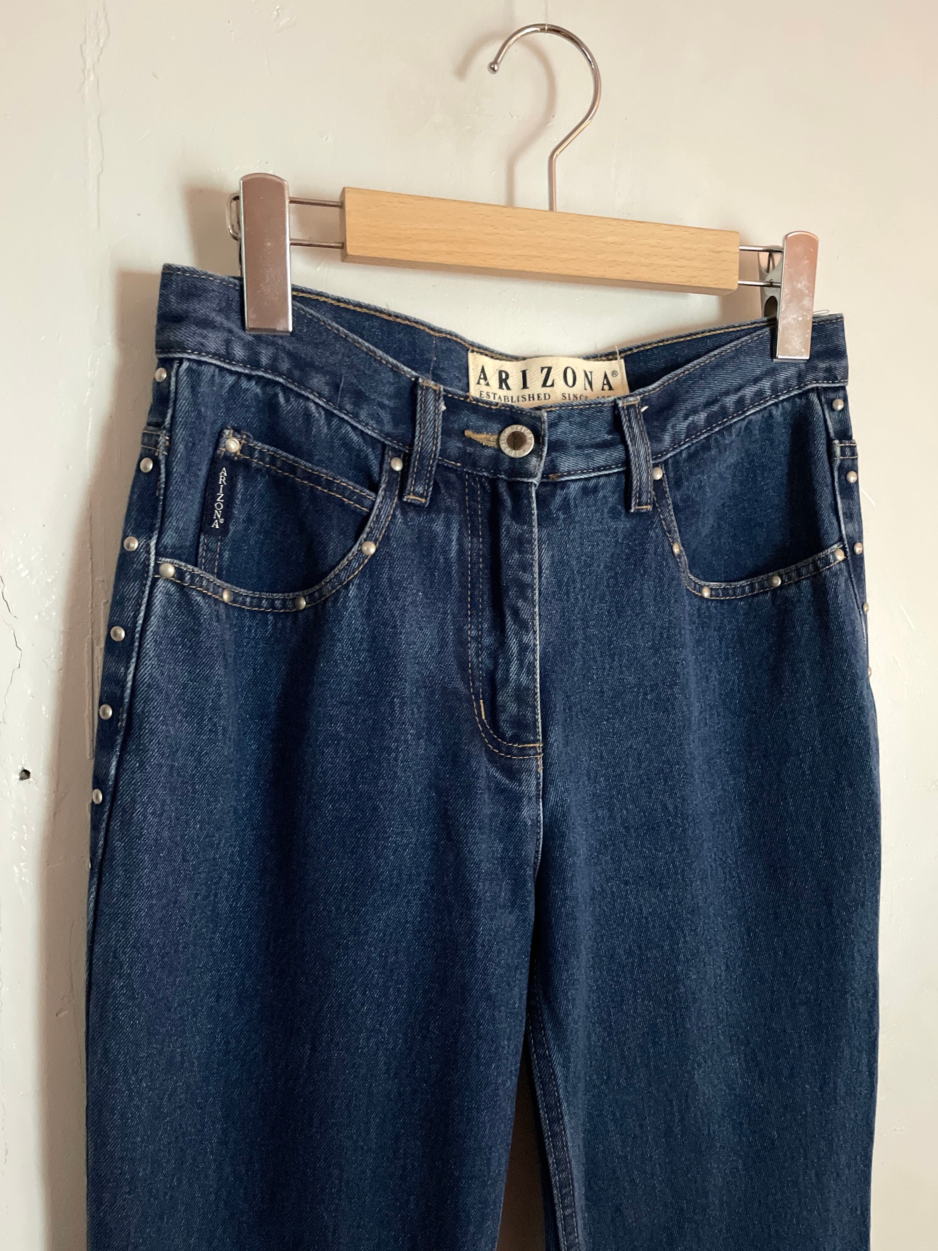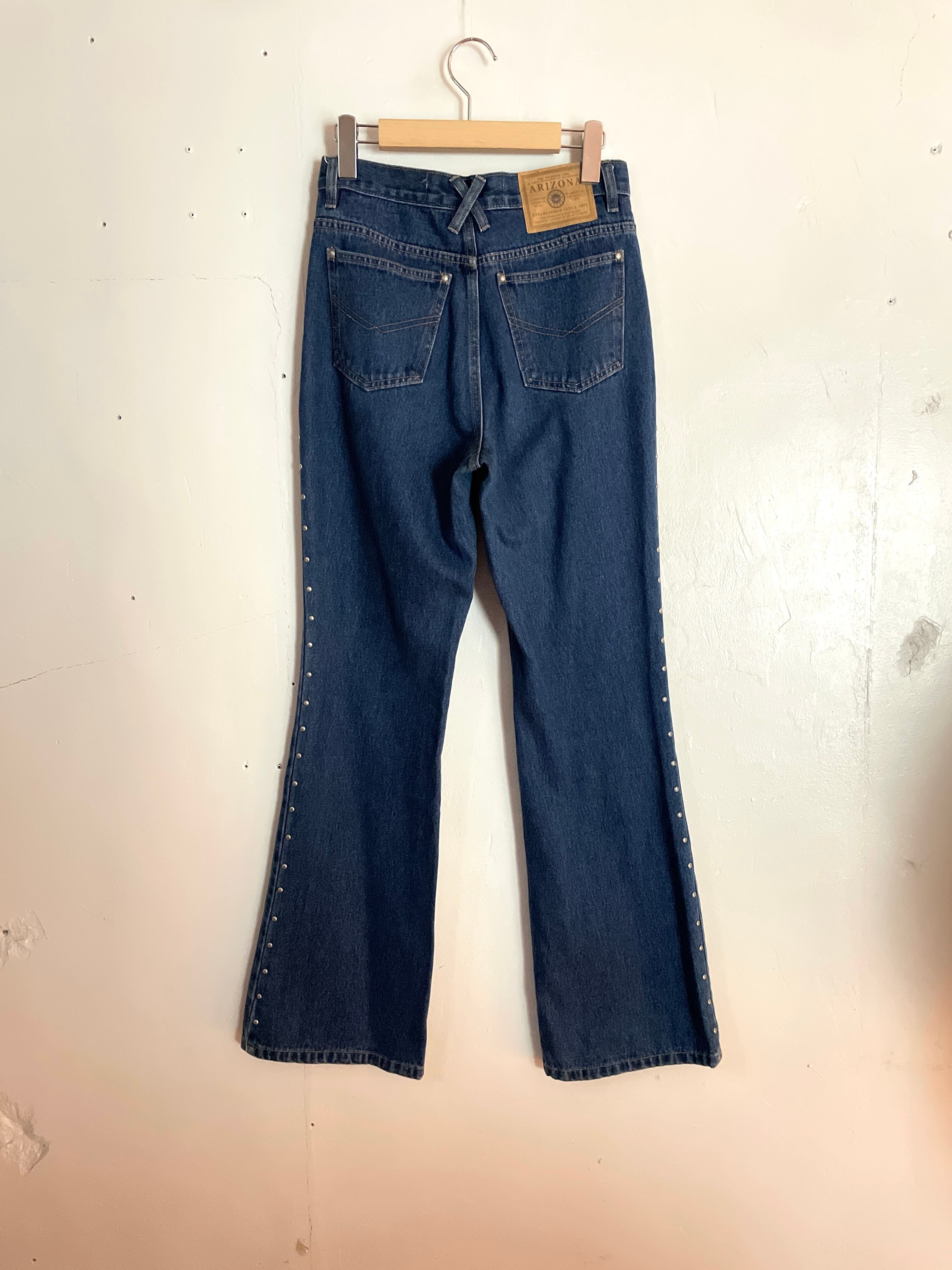 ポケット口と両脇に均等にスタッズが打ちつけられたフレアデニムパンツ。濃いめのブルーで、シルエットも非常に綺麗です。ウエストと丈感のバランスも良く、状態も良し。やり過ぎてなくて、それでも個性を出せる、秀逸なデザインのパンツです。