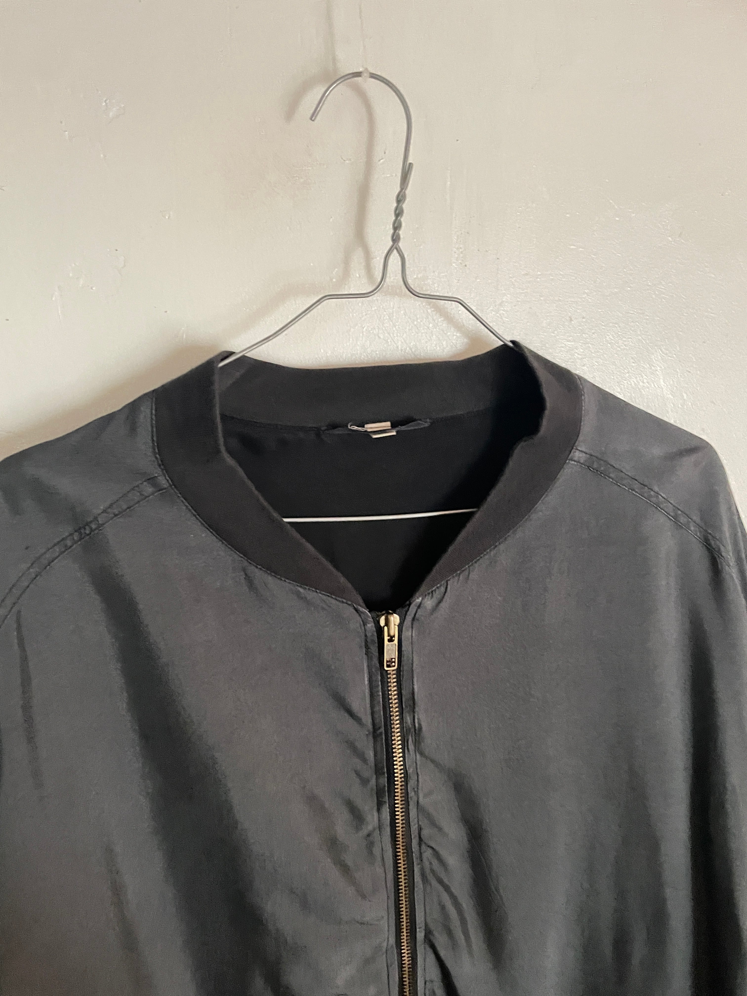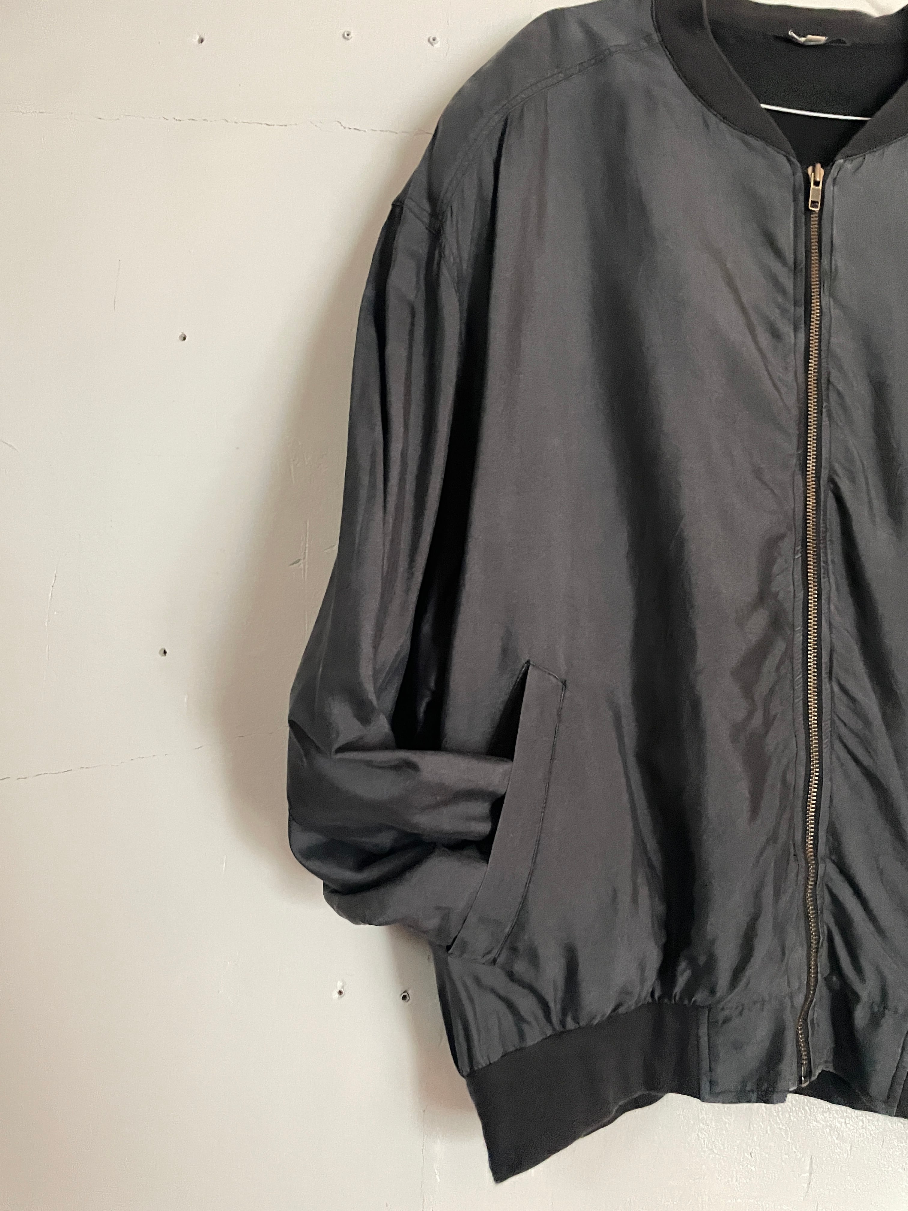 光沢のあるグレーボディーのシルクブルゾン。まさにこれからの季節に一番活躍してくれそうなアイテムです。癖がなく、サラッと羽織りやすい仕様。襟、袖口、裾はブラックでリブ仕様。ゆったり着られるビッグサイズなのも魅力的です。男女共におすすめしたい、秋アイテムです。