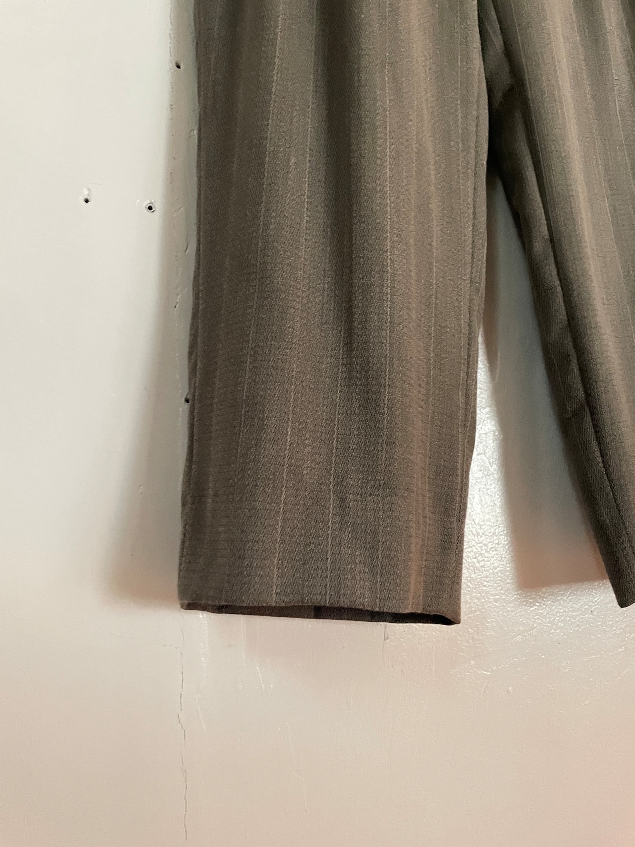 ベージュっぽいグレーカラーに、さりげないストライプデザインが施されたスラックス。渋さのある色味で、タックの入った綺麗なワイドストレートシルエット。主張の激し過ぎない、一本持っておくと確実に活躍してくれるアイテムです。