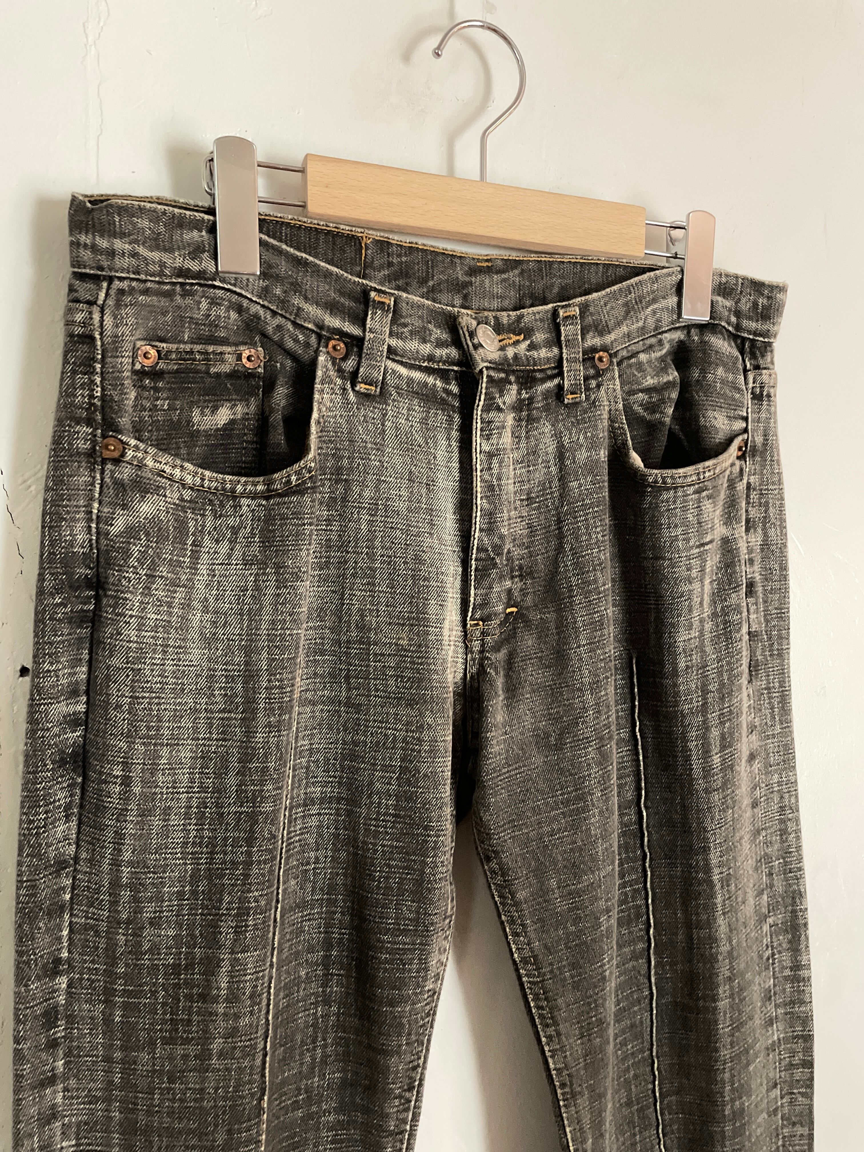 良い褪せ方をしたグレーカラーで、ステッチによってセンタープリーツが加えられたフレアデニムパンツ。程良くフレアした綺麗なシルエットです。様々なアイテムとの相性が良さそうな一本です。季節関係なくガシガシ履けるお洒落パンツです。