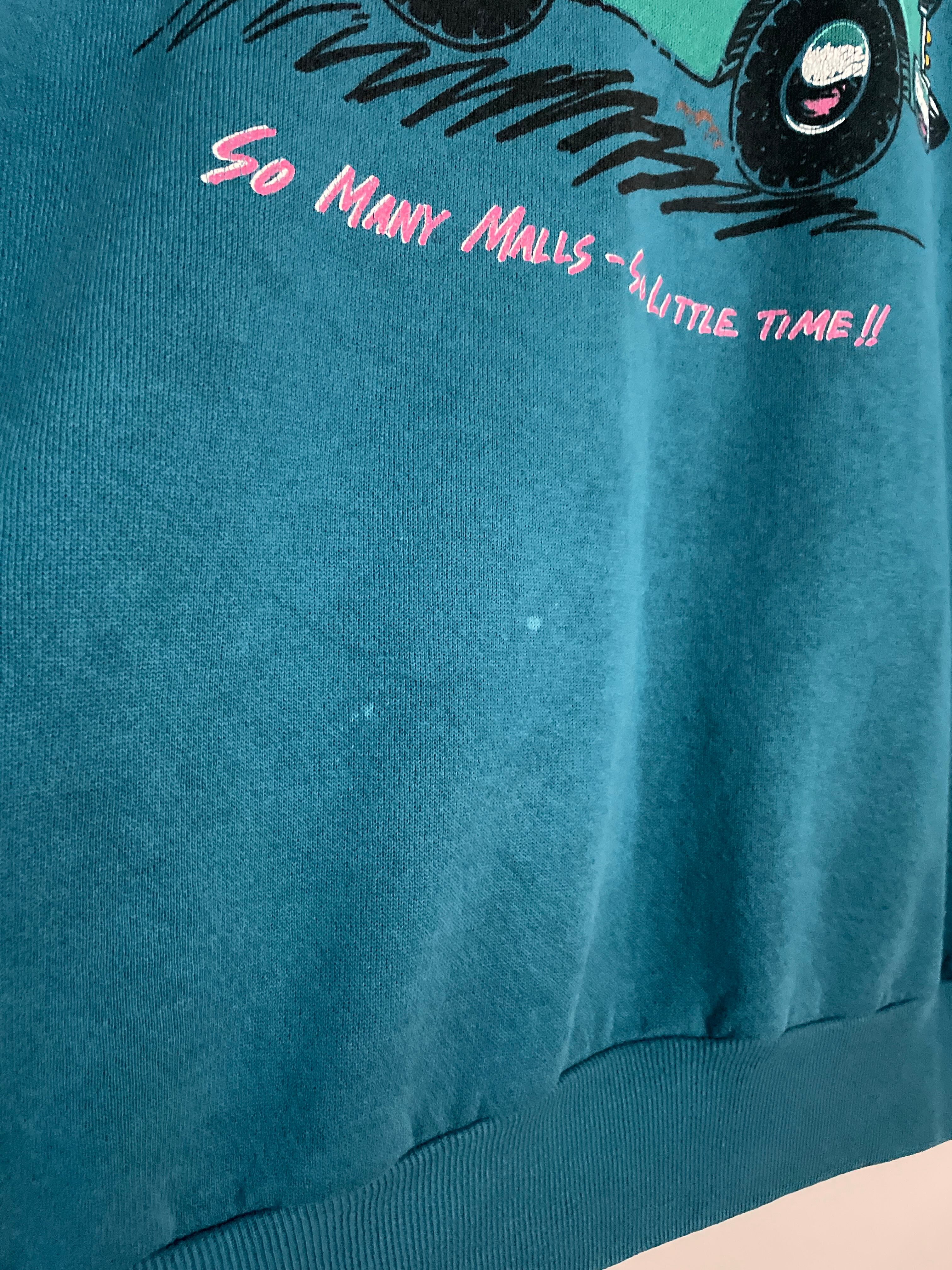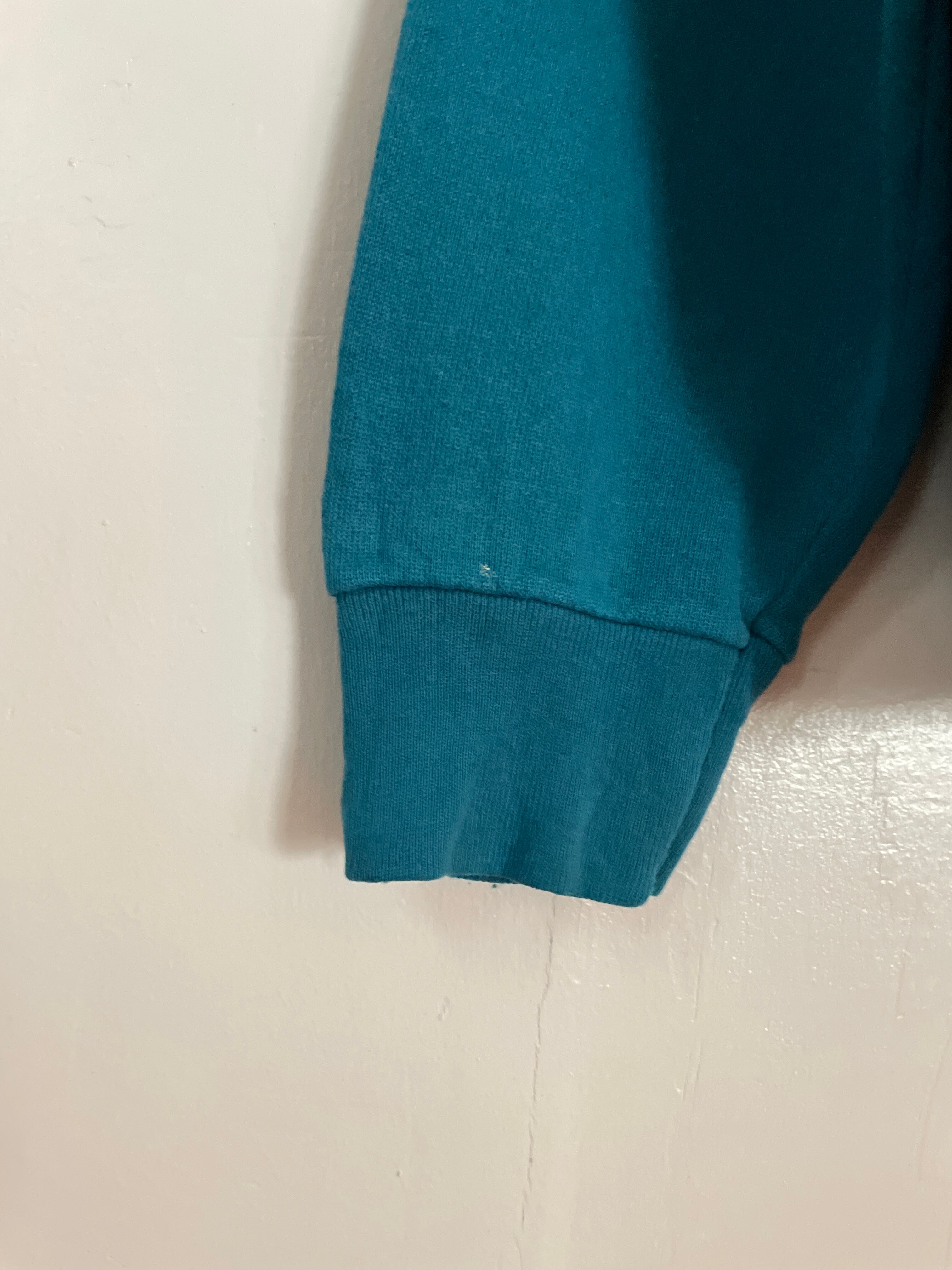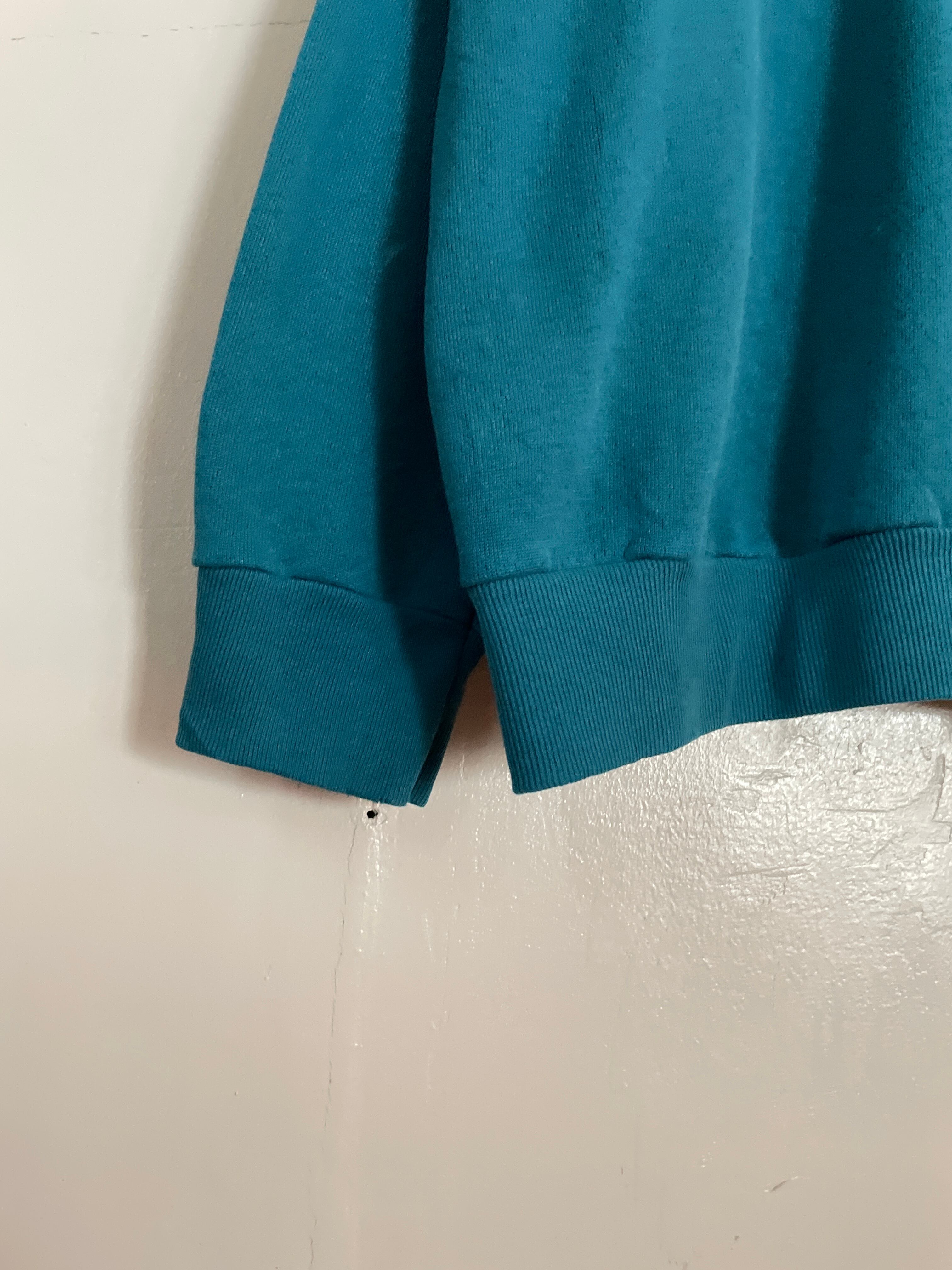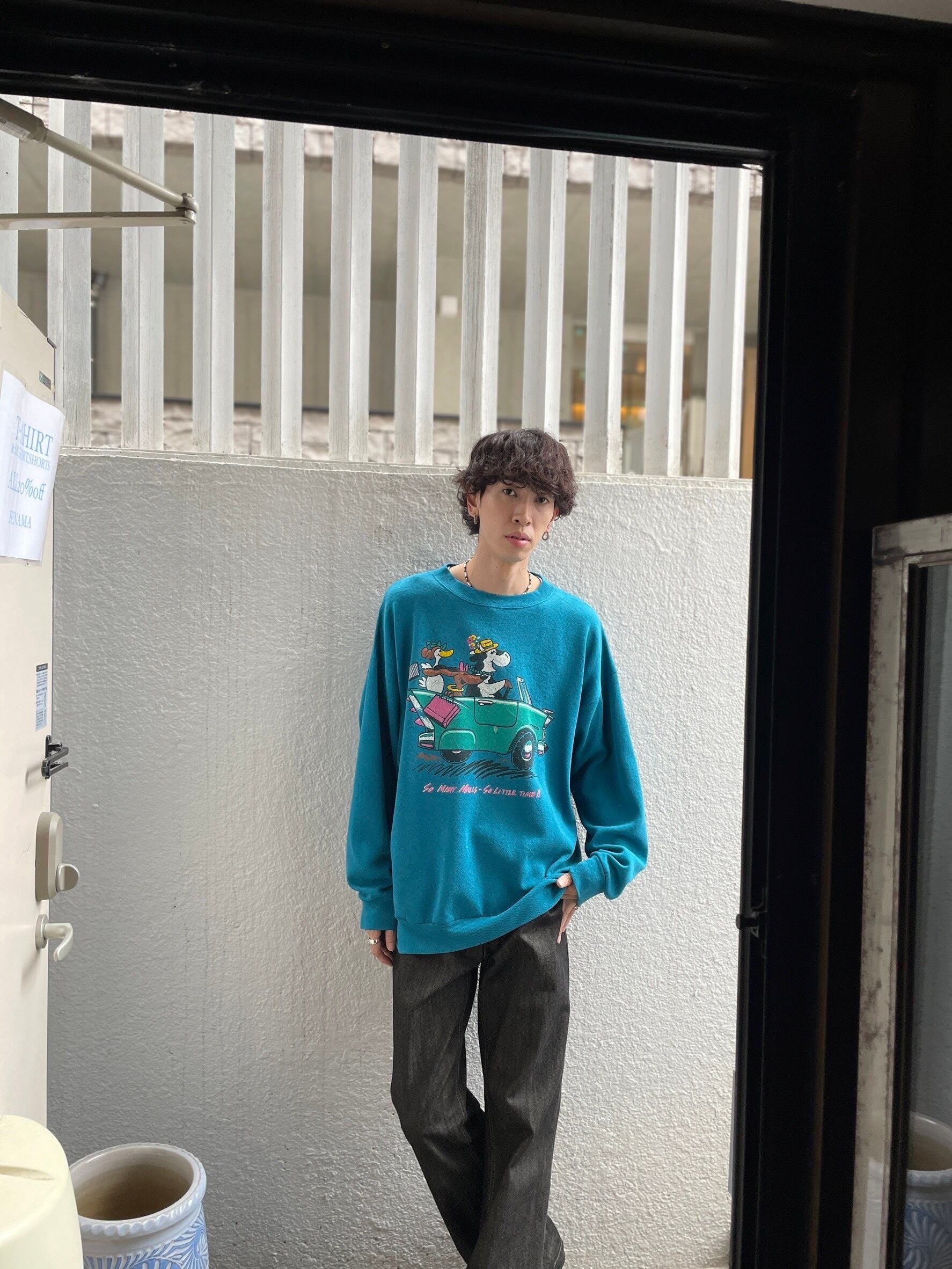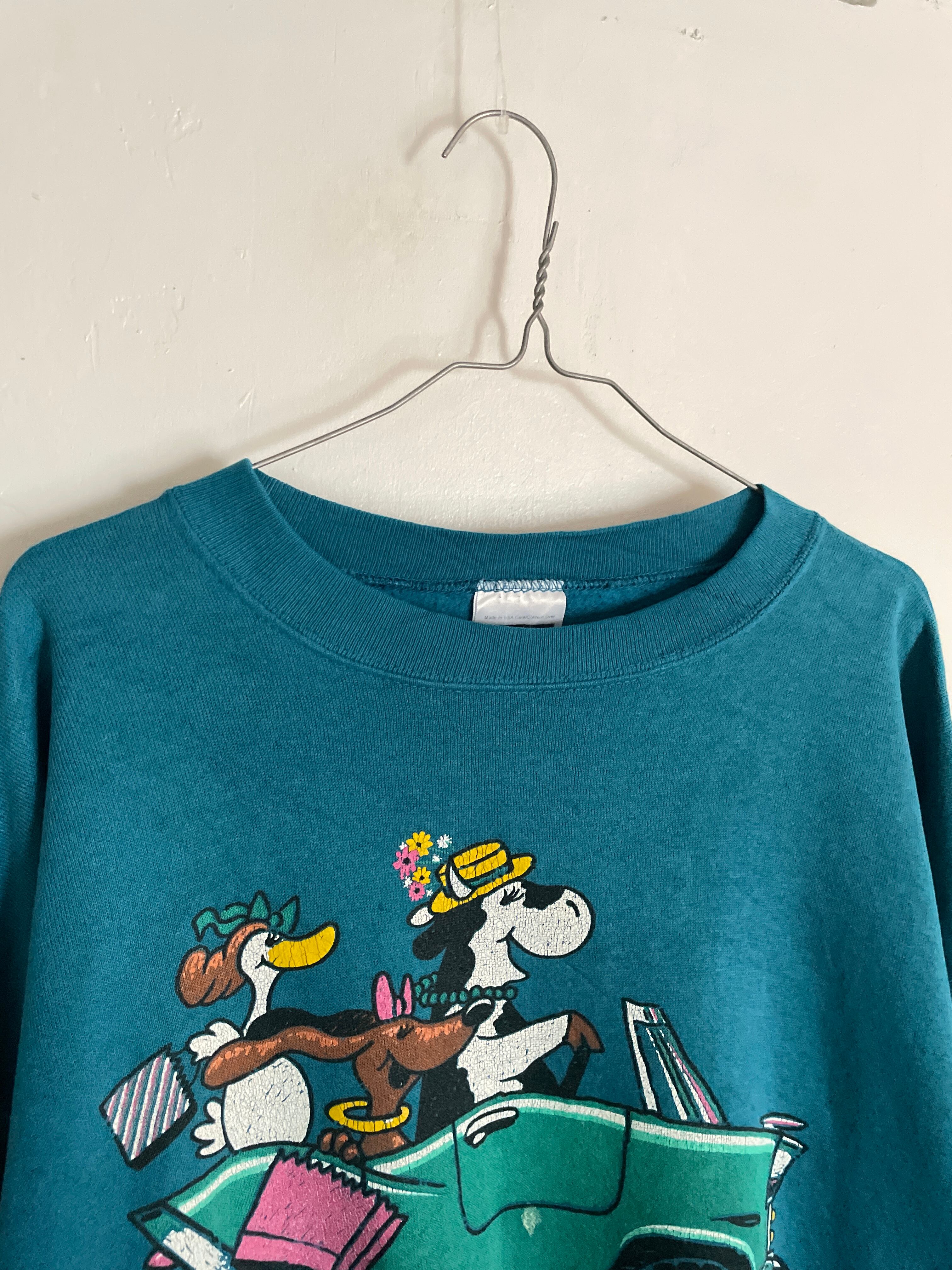 可愛らしい動物たちがコミカルに描かれたプリントスウェット。ボディカラーのエメラルドグリーンも鮮やかです。サイズ表記は2XLとゆったりしたシルエット。コーディネートに良い抜け感を与えてくれそうな一枚です。若干のシミが見られます。