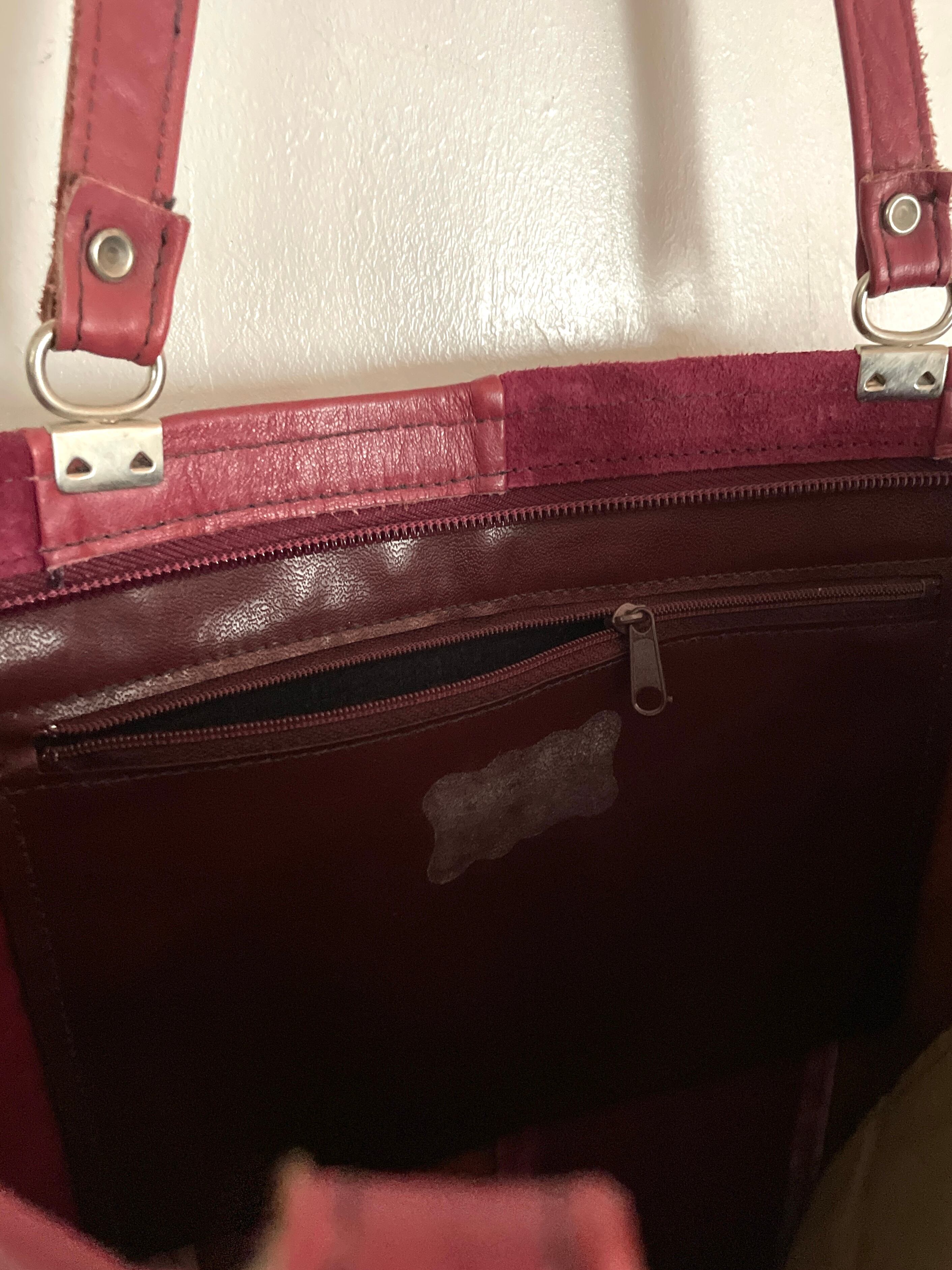 赤のガラスレザーとスエードレザーで切り替えられたトートバッグ。表面にジップポケット、内側にもジップポケットが付いています。深さがあり、マチはないものの結構な量が入りそうです。肩掛けにはちょうどいい持ち手の長さで、赤色がコーディネートにいいアクセントを与えてくれそうです。