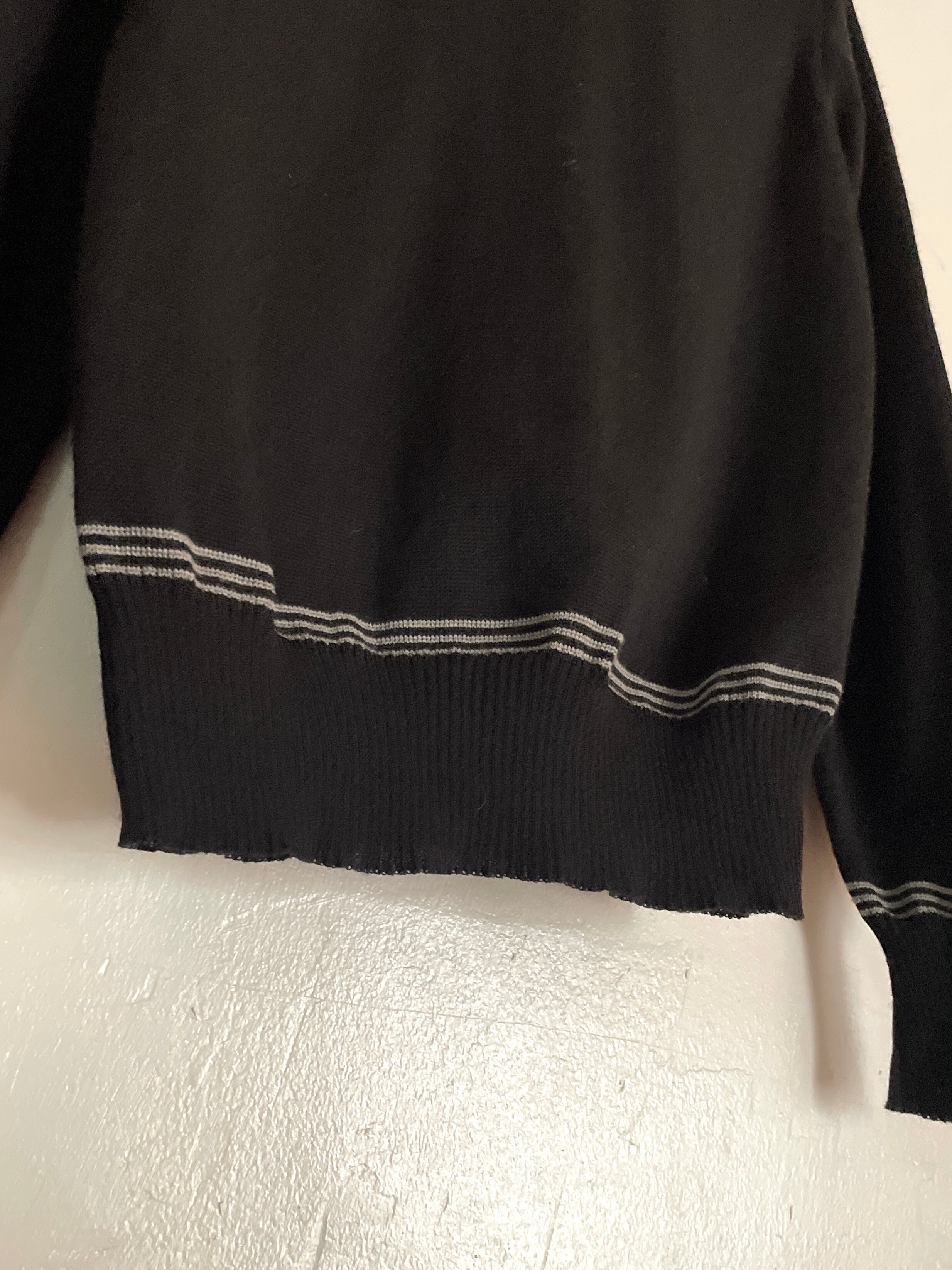 ブラックのウールニットをベースに、部分的にレザーが使われたフルジップニットジャケット。やや大きめの襟、タイトめな身幅とアーム、黒一色でまとめられたかっこいい一着です。袖口、裾のリブ幅がやや広めなデザイン。裾と袖口のボーダーもさりげなくて良いです。ニット、シャツ、アウター、それぞれの要素をうまいこと組み合わせたような秀逸なアイテムです。