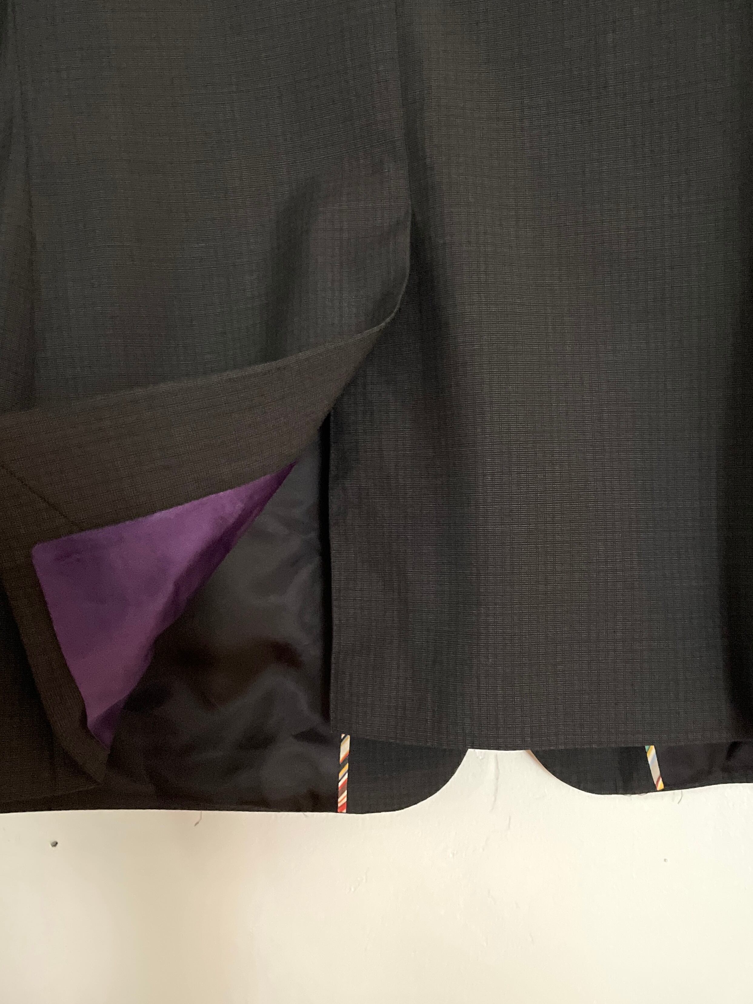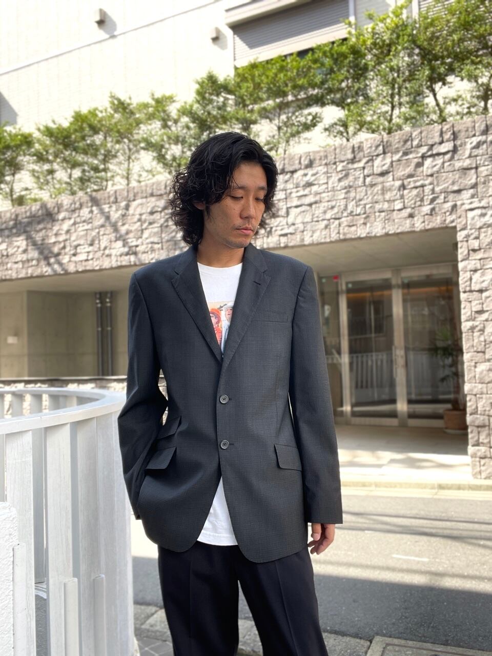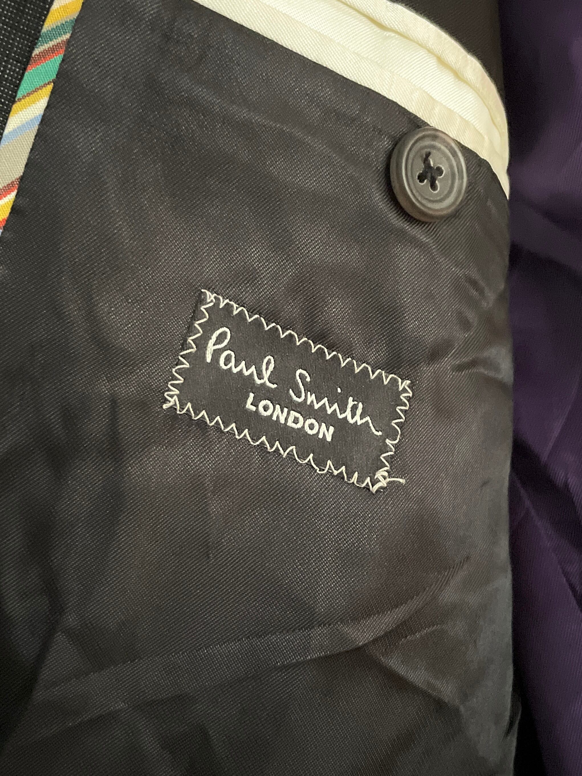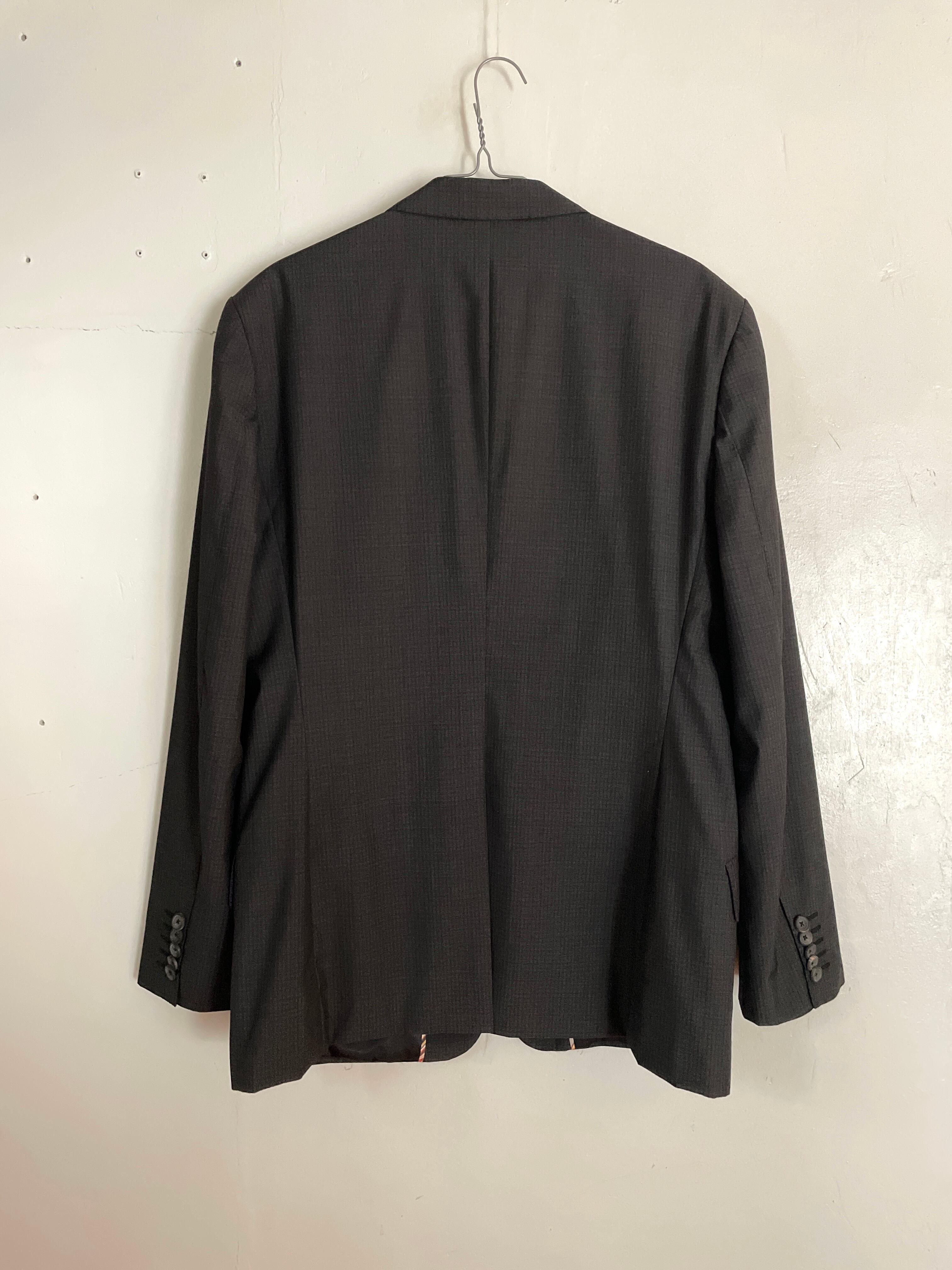 イギリスを代表するファッションブランド、ポール・スミスのテーラードジャケット。ボタンが一列のシングルタイプです。一見無地に見えますが、よくみると小さな格子状に素材が編まれ、チェック柄のようにも見えます。上質な素材、体に沿う丁寧なカッティングはさすがのハイクオリティ。着用回数の極めて少ない非常に良いコンディションの一着です。