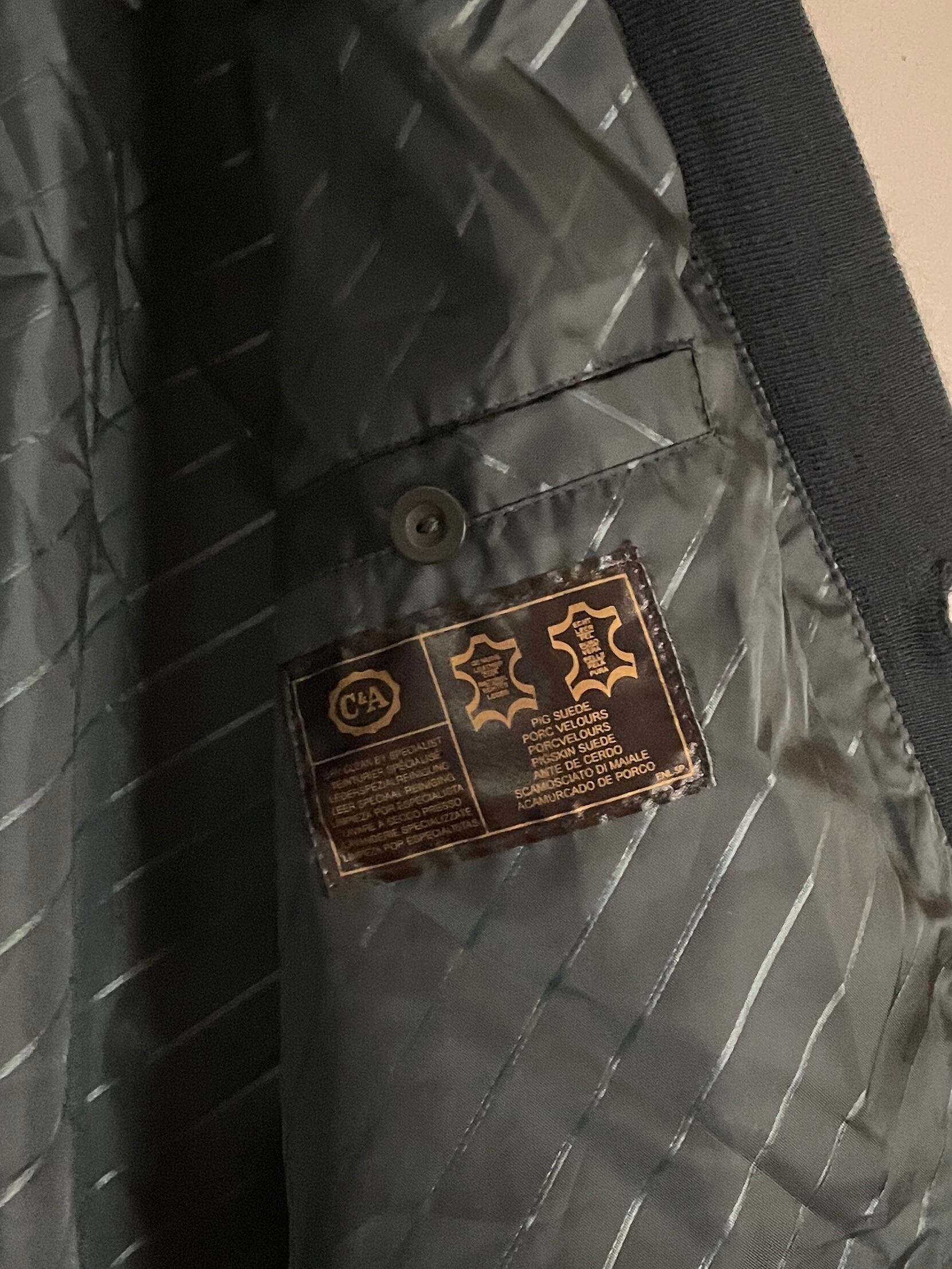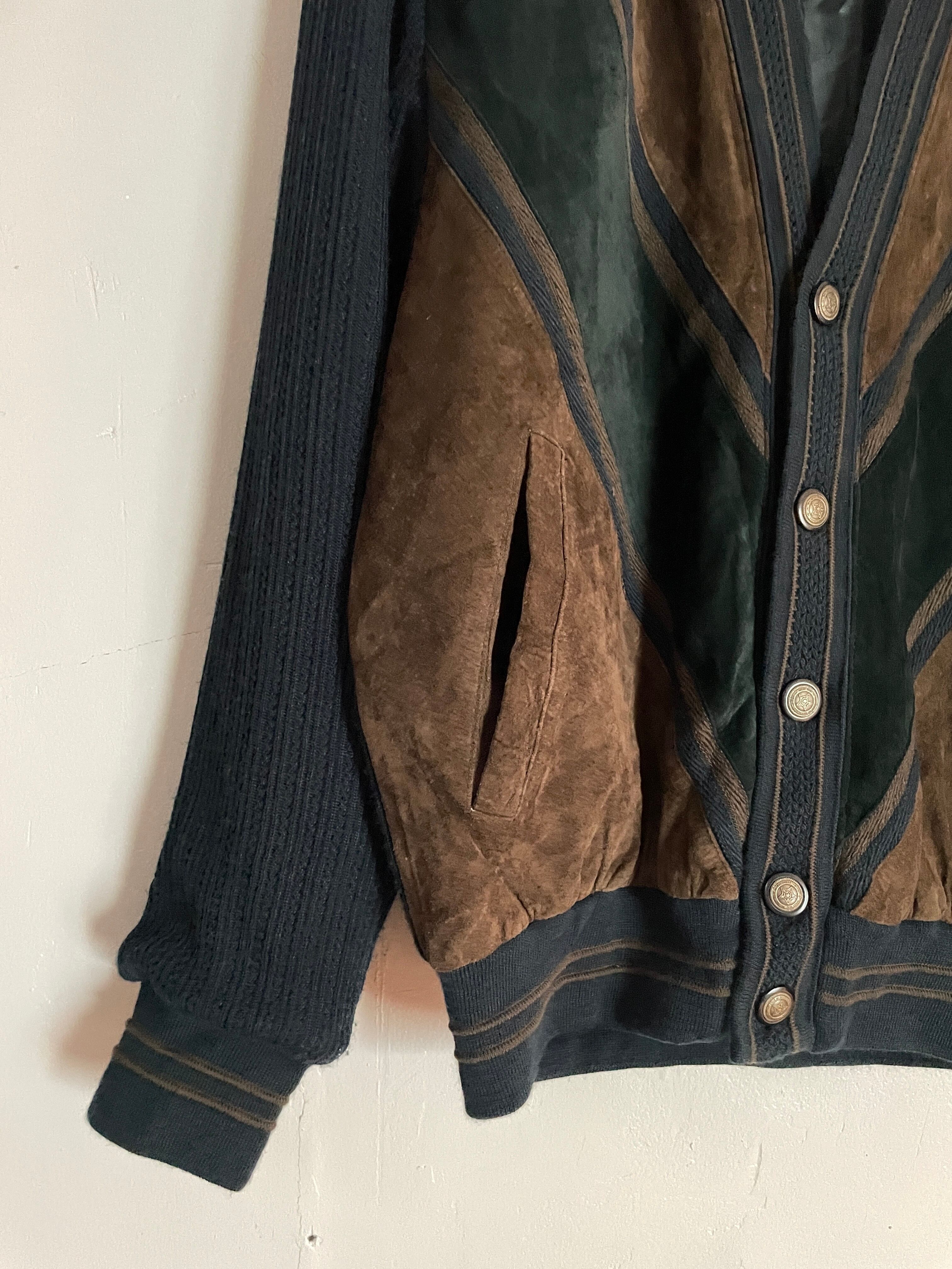 深みのあるグリーンのニット素材と、レザーで切替えられたデザインがお洒落なカーディガンジャケット。裏地付きで袖口、裾はリブ仕様、ポケットも付いています。一般的なニットのカーディガンにアウターとしての要素をプラスした非常に使い勝手の良い一着です。表記サイズはSですが、小さ過ぎない程よいサイズ感です。