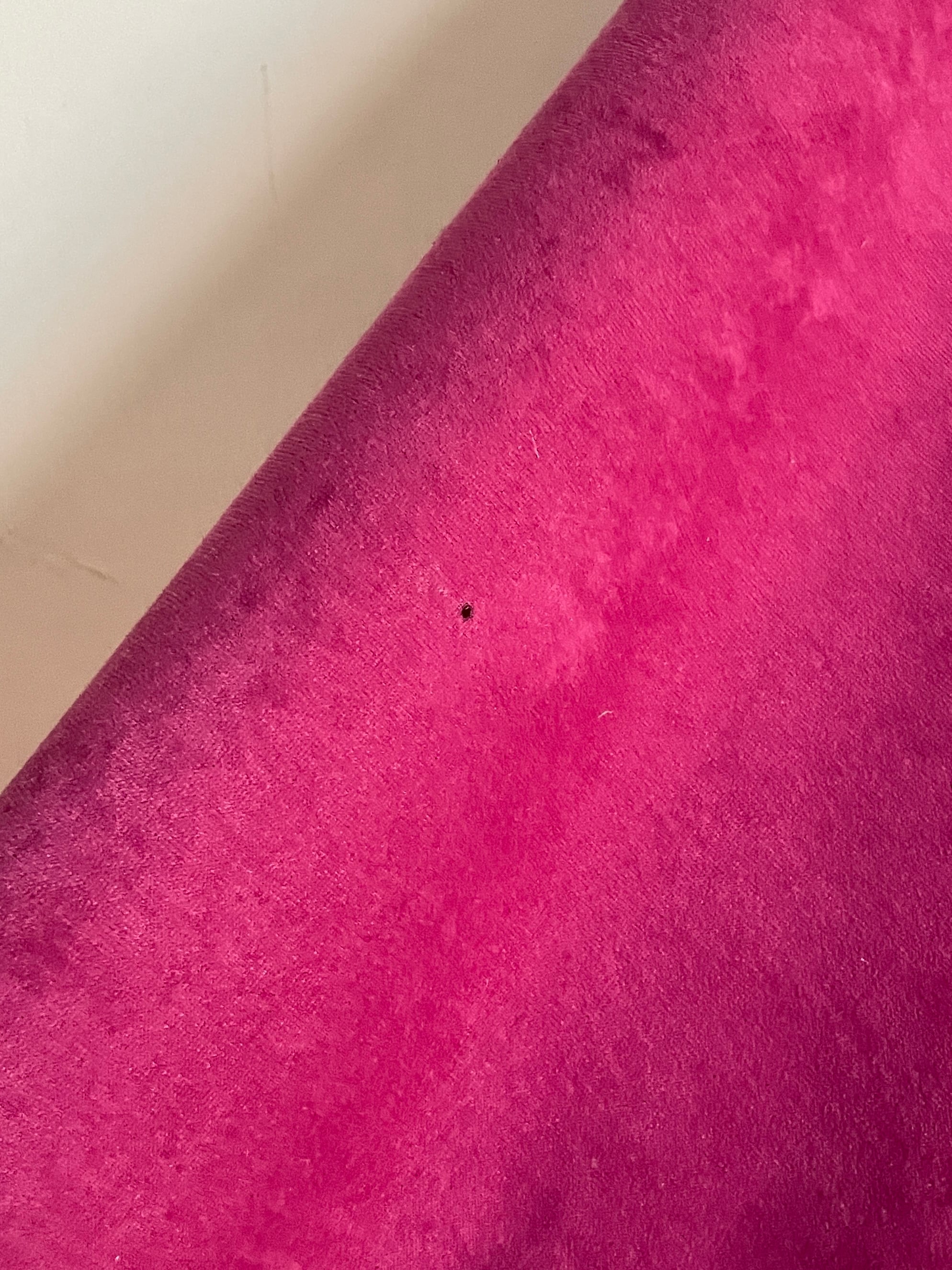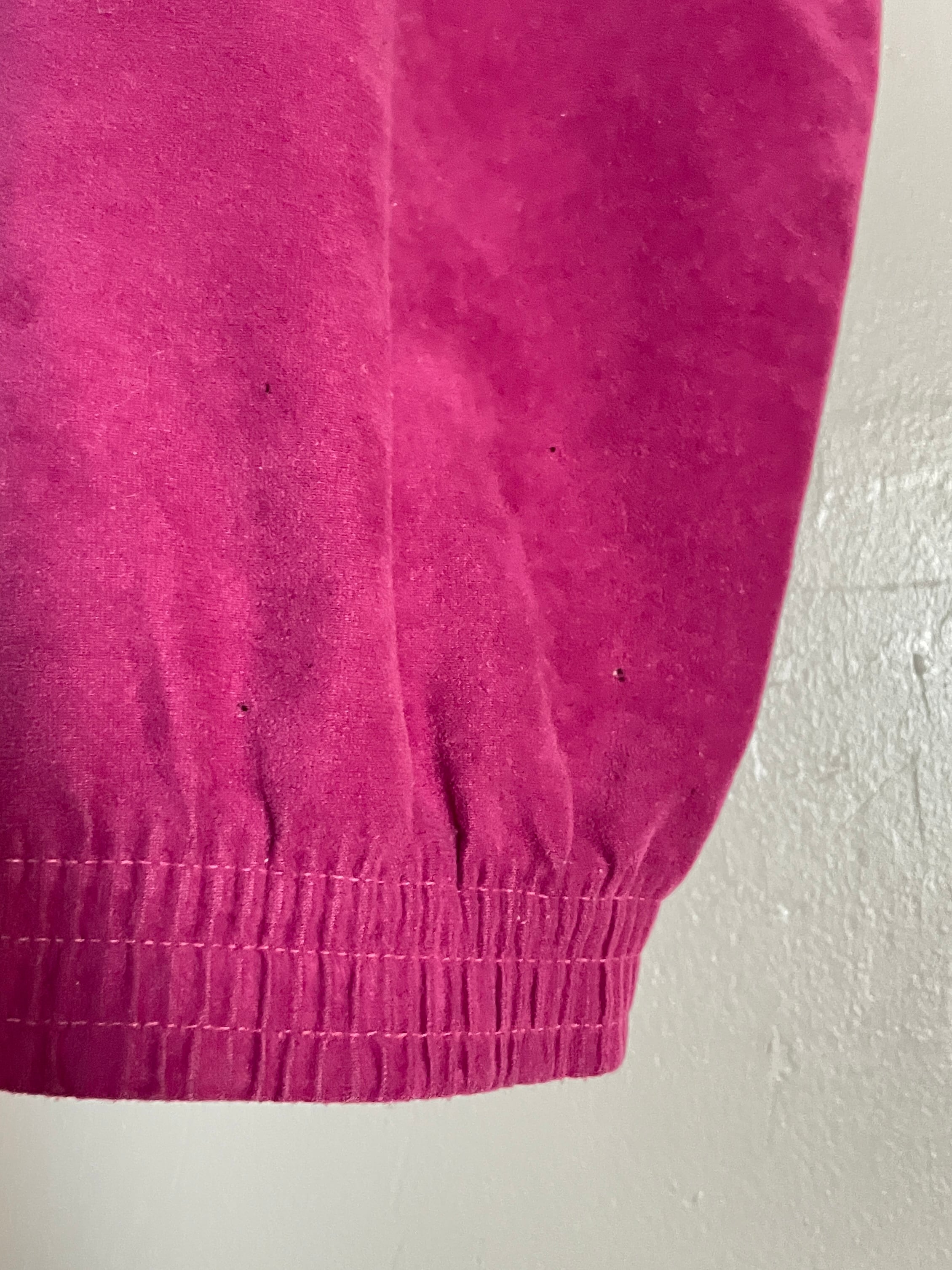 パープルカラーをメインに、斜めの切替えデザインがお洒落なプルオーバートップス。切替え線に合わせてジップポケットがついたユニークな作りになっています。素材は触り心地の良いピーチスキン、ネックが高めのデザインなためインナーとしても活躍してくれそうです。今の時期にピッタリの一枚。