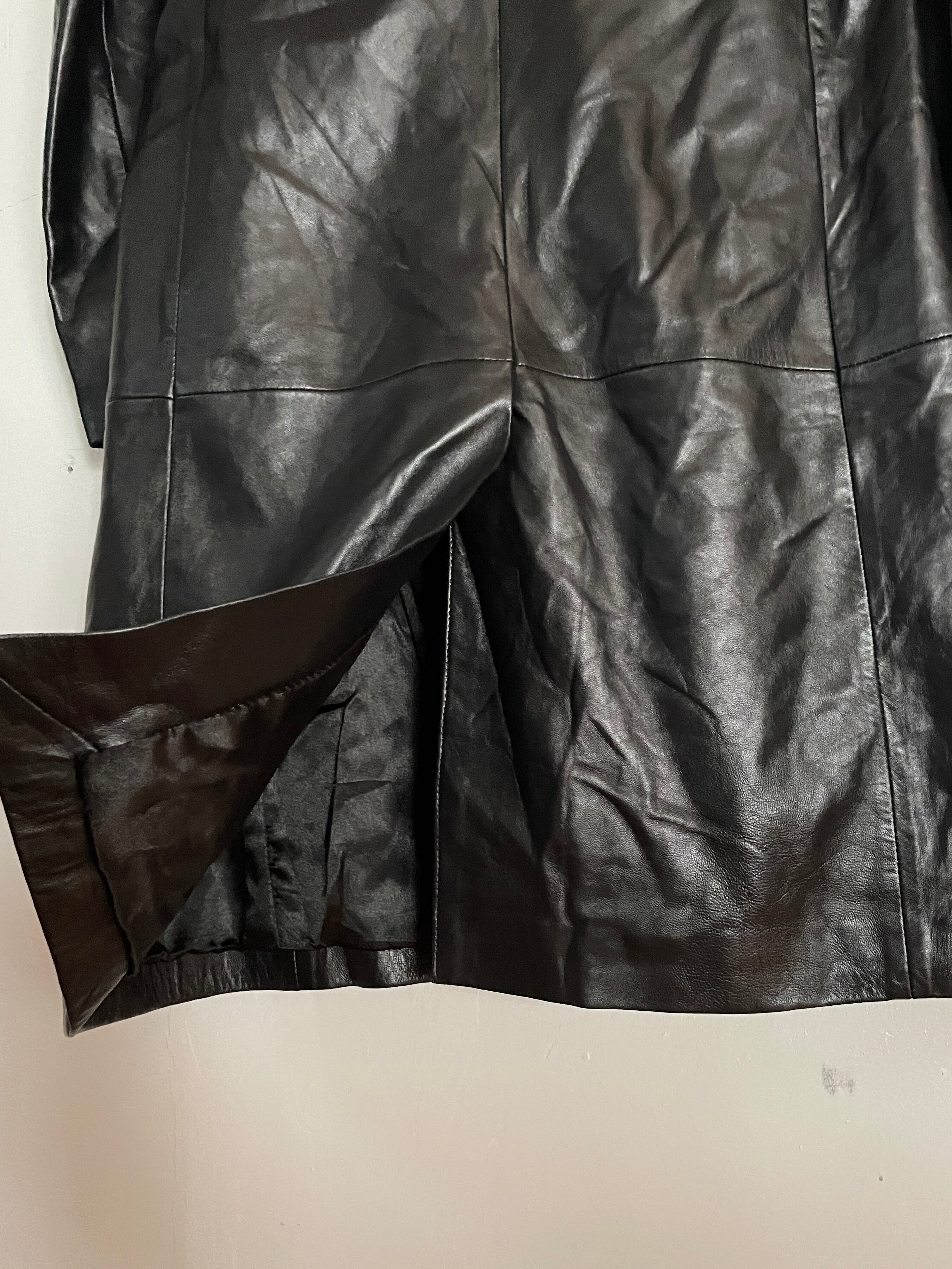 柔らかいブラックレザーが使われたテーラードコート。前開きは3つボタン、程よい大きさの襟でシンプルなデザイン、無駄を削ぎ落としたスタイリッシュな一着です。縫い目を使ったスラッシュポケット付き。全体的にややタイトな作りで本来はレディース仕様、細身の男性でも着れそうです。レザー自体は非常に柔らかく、後ろ裾にはベンツも入っているため着用しやすいです。ベンツあたりに汚れが見られます。