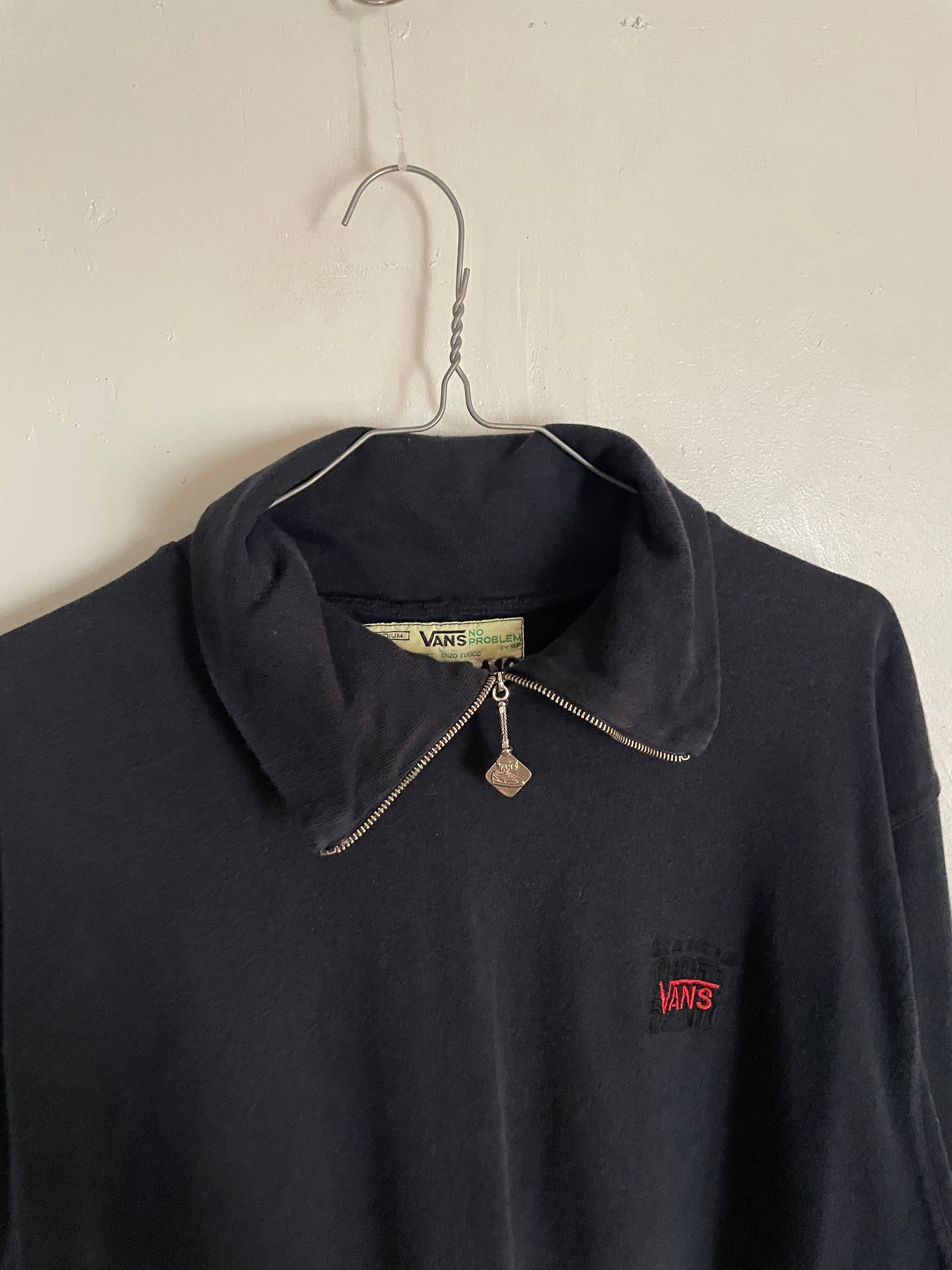 ブラックボディーに、ワンポイントでブランド刺繍が施された、バンズのダブルネックスウェット。別々でドッキングされたようなダブルネック仕様。ジップがアクセっぽくてお洒落です。ボディー自体はシンプルでかなり使いやすそうです。今の時期には一枚で、これからの季節にはインナーとしても使える一着です。