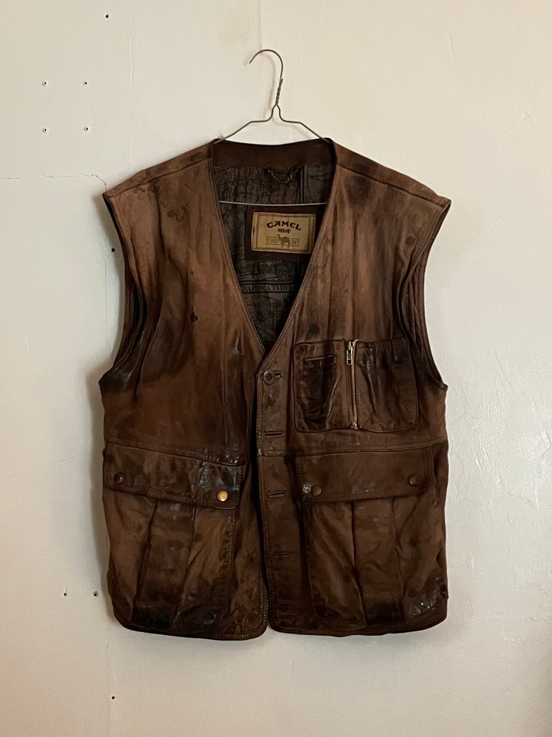 ラクダのモチーフで知られる「CAMEL」のレザーベスト。落ち着いた色のブラウンレザーでもっちりとした触り心地です。ポケットが前側に3つ、内側に2つ付いてます。ポケットの付き方や素材感、シルエット等絶妙なバランスで存在感があります。色褪せているところもまた渋さが出ていてかっこいい1着となってます。袖口が広めなので中に着込んでもゆったりと着られます。