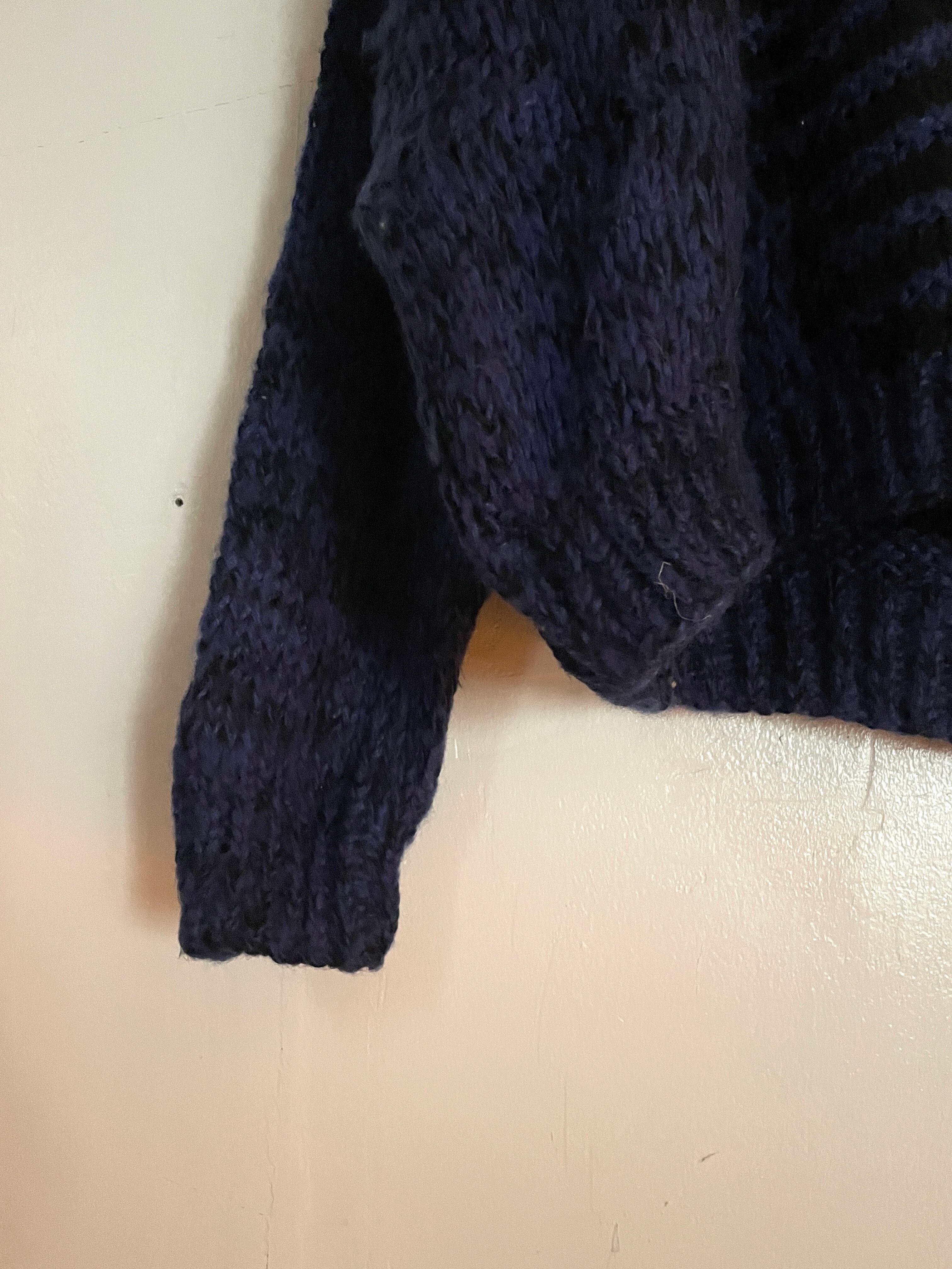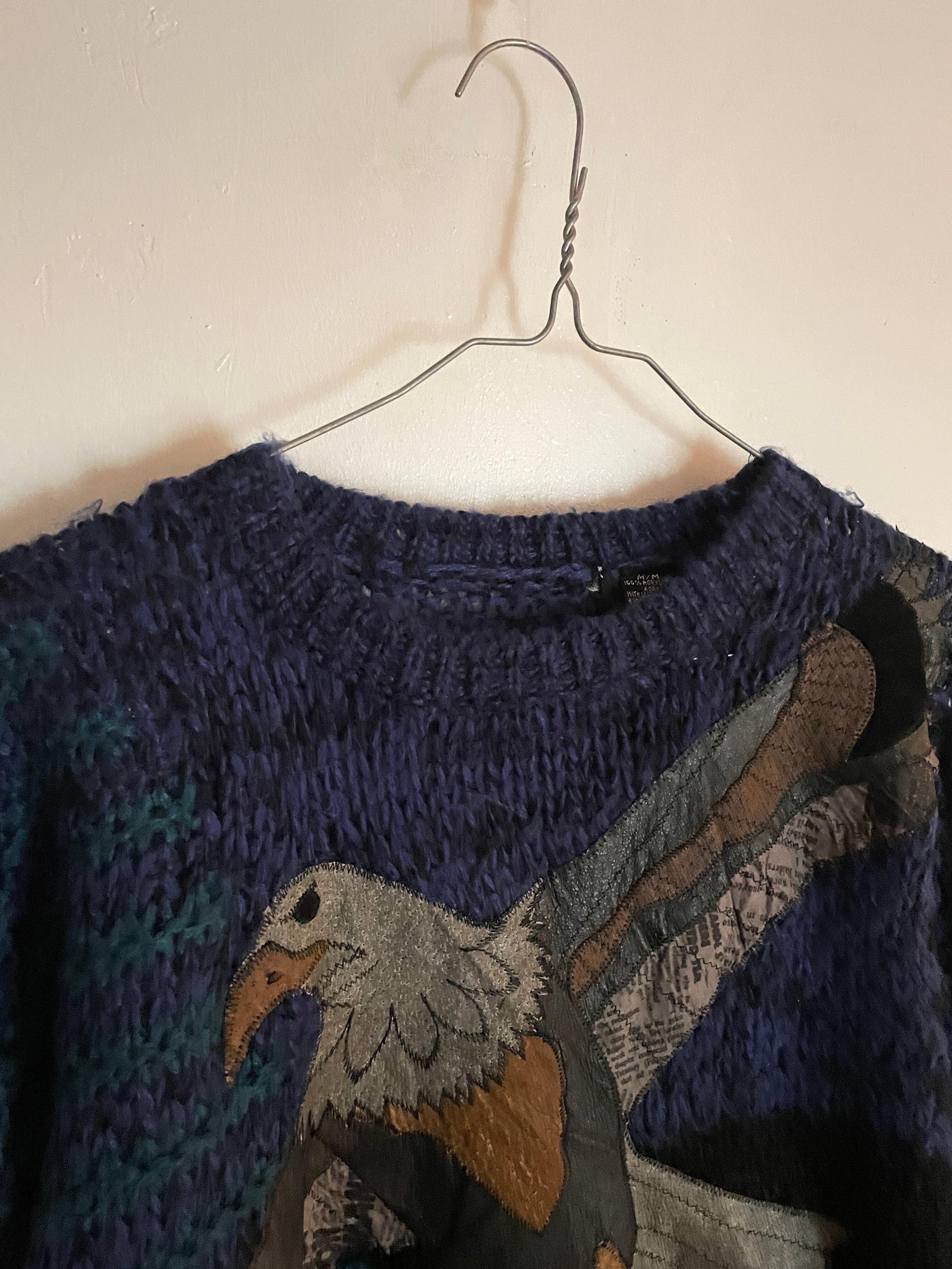 ワシの形をしたつぎはぎのパッチが大胆に付けられたニットセーター。暗めのいろんな色でざっくりと編まれたニットで、パッチ部分はレザーが使われているため立体感があります。またパッチには部分的に文字が入っていたりと遊び心のある一着。後ろが全くの無地というのもポイントです。ゆったりと着れるサイズ感です。