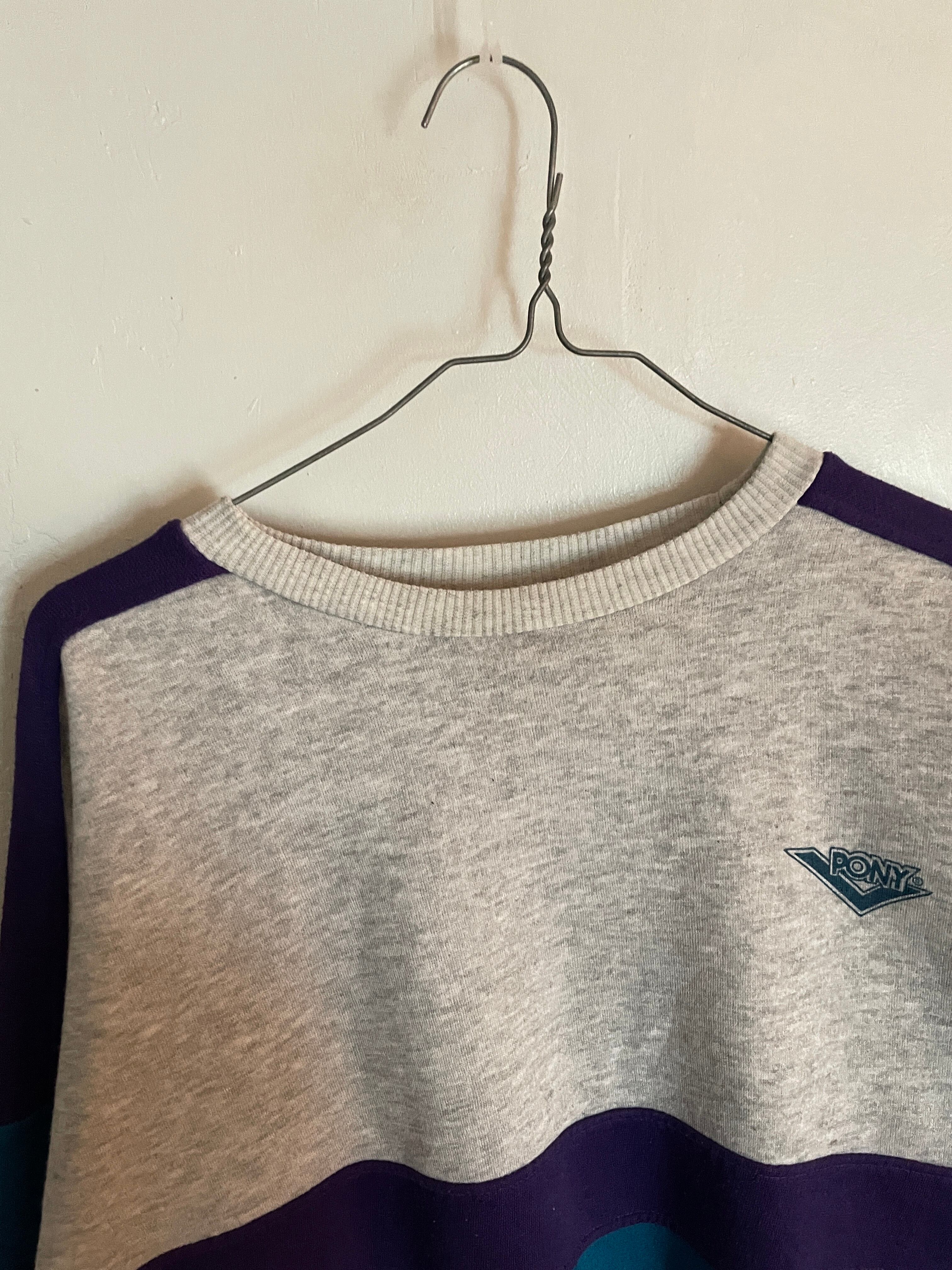グレーボディーをベースに、パープル、ブルーのラインデザインが施されたスウェット。フロント部分にはワンポイントでブランドロゴプリント。柔らかく軽めのかなり着やすい質感。リブ仕様で丈感もグッドです。今の時期にはもちろんこれからの季節インナーとしても活躍してくれる一着です。