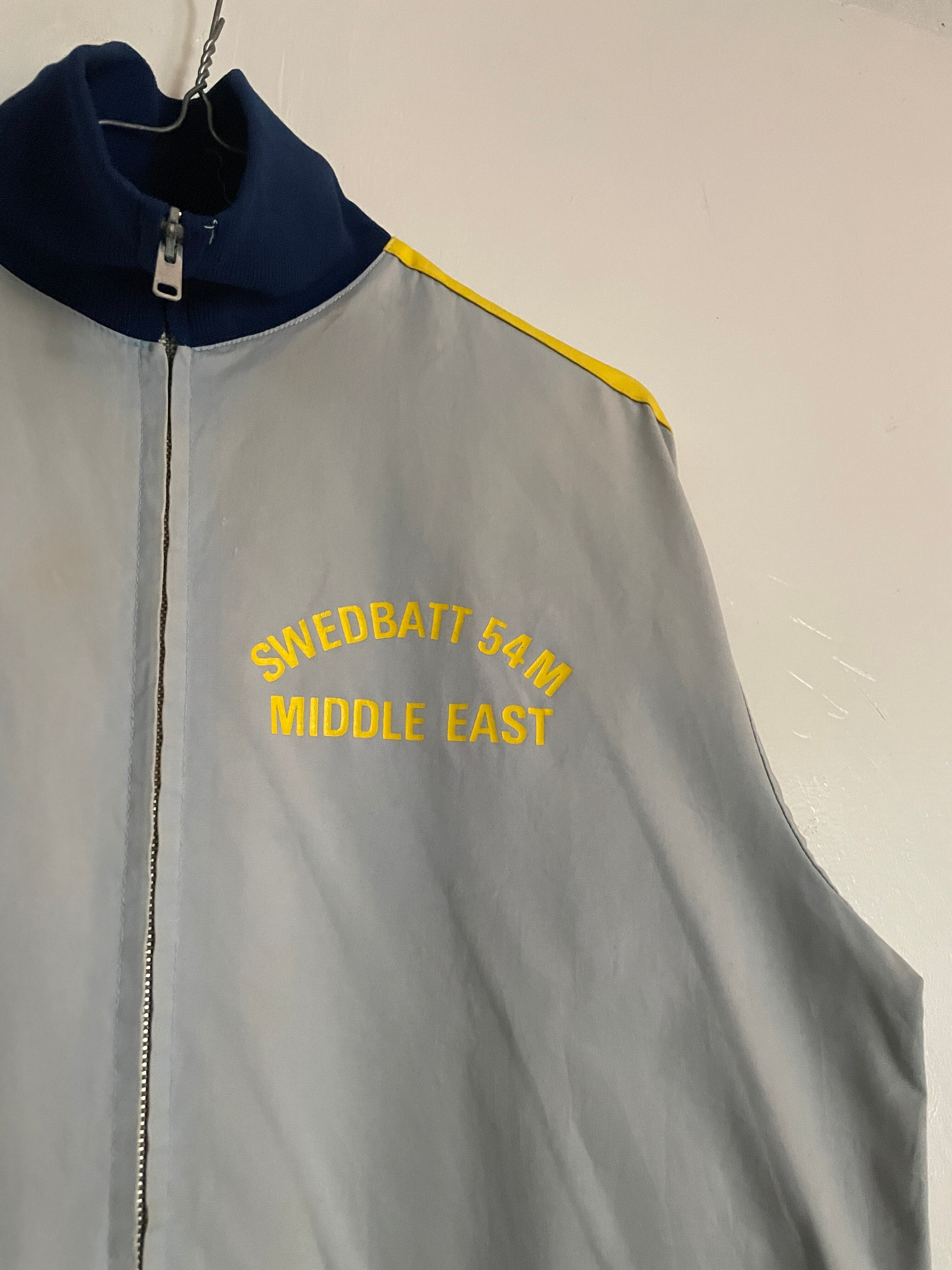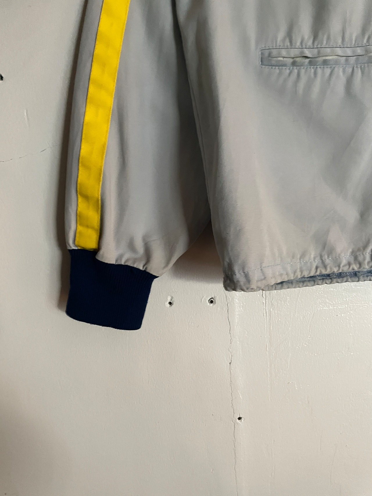トラックジャケットのようなシルエットの、ワークジャケット。ネック、袖口はリブ使用。ワンポイントのイエロープリントが良い差し色になっています。ネックから袖にかけてのラインデザインもグッドです。片方だけジップポケット付きで、裾にはドローコード付き。機能性にも優れた一着です。大き過ぎないサイズ感なので、男女共におすすめしたいアイテムです。