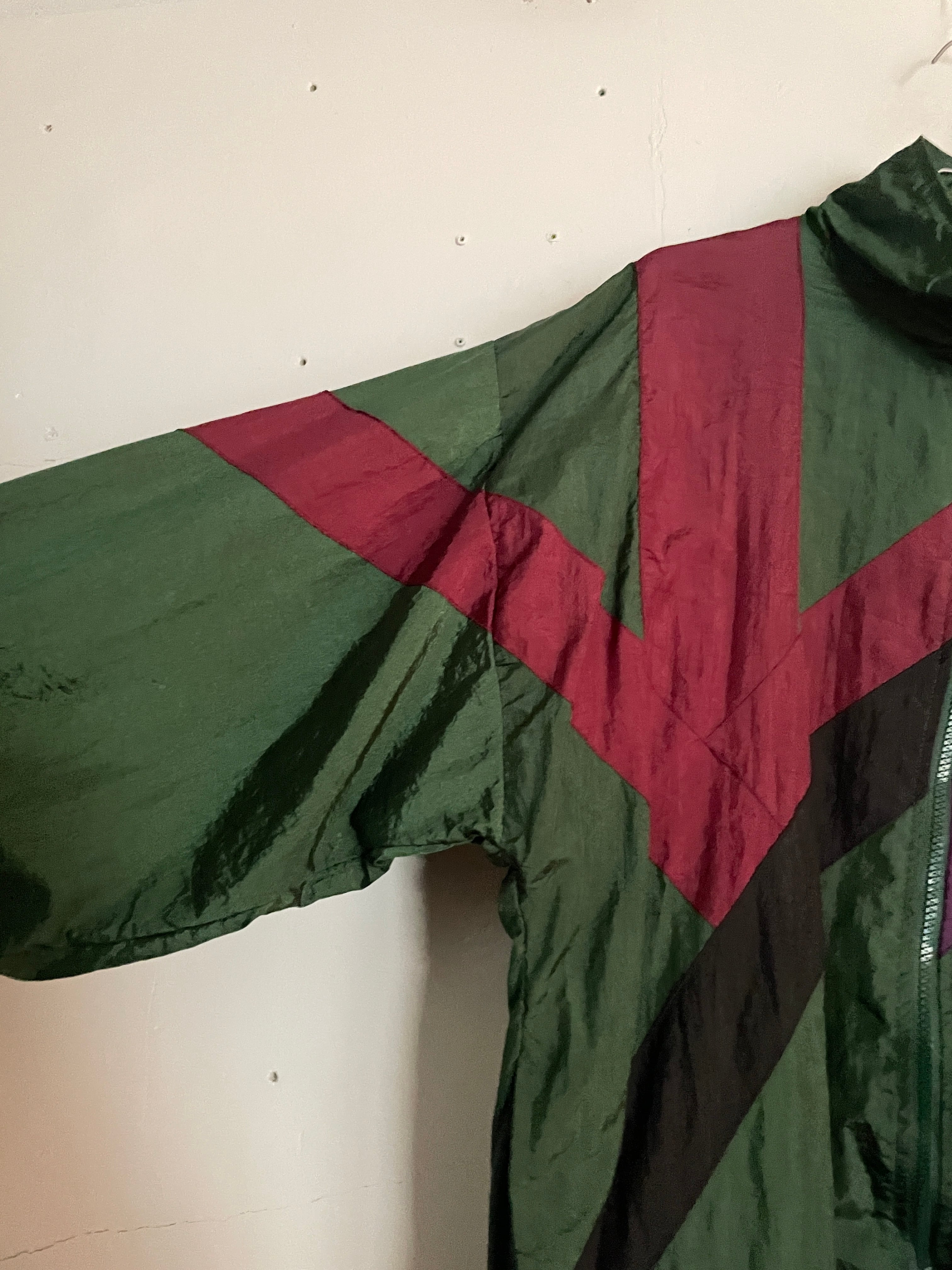 光沢のあるグリーンボディーをベースに、太めなラインデザインが施されたナイロンジャケット。矢印のような切替えがユニークです。ハイネックなのも魅力的。今の時期にはラフに羽織れる一着です。大き過ぎず程良いサイズ感なので使いやすいかと思います。バック部分に一部白い汚れが見られます。