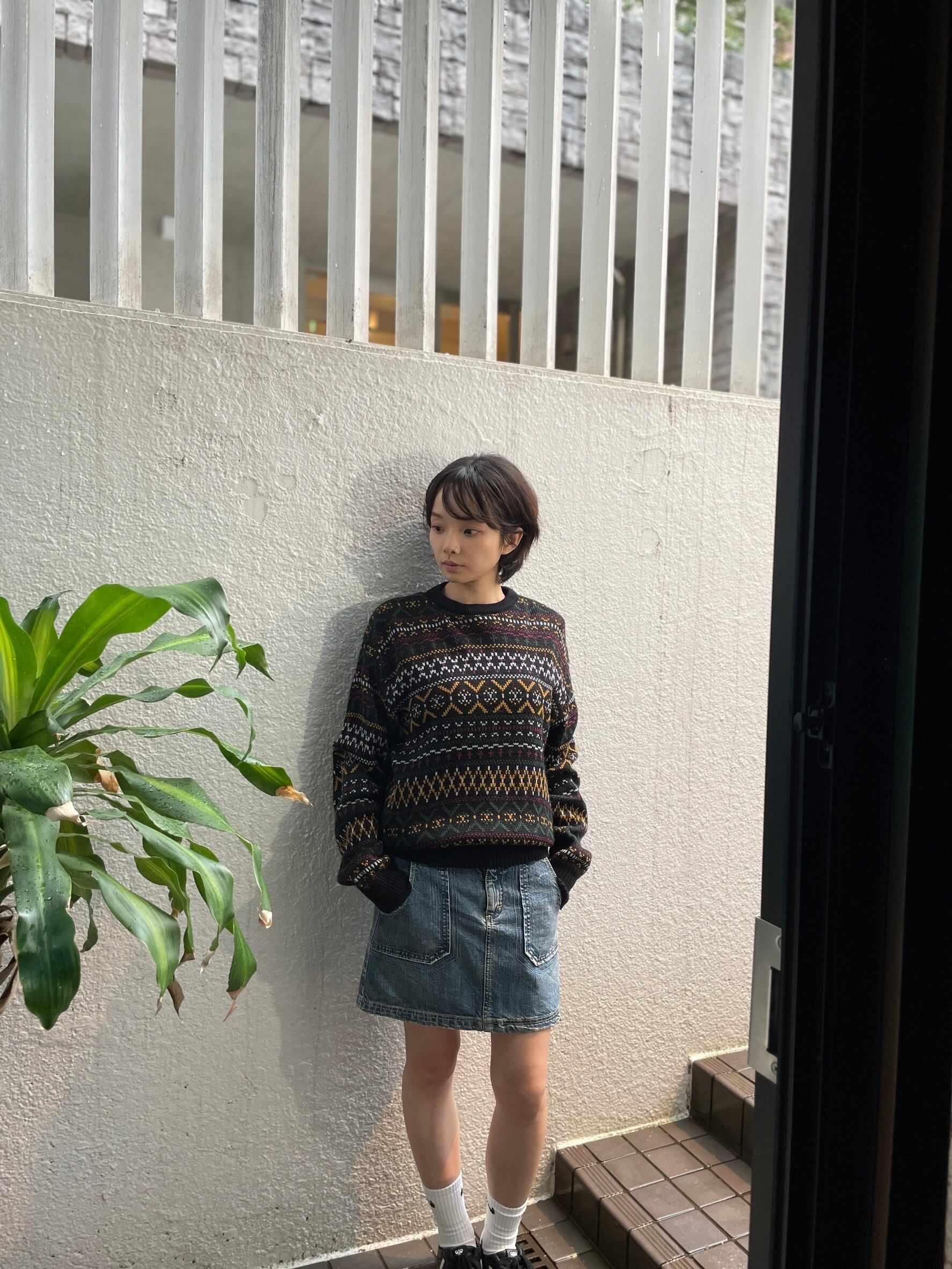 ブラックボディーをベースにお洒落な総柄デザインが施された、ニット。短丈めなシルエットに対して袖が長めと、今っぽいシルエットです。裾の締まりが良く収まりが絶妙に良いです。アクリルとウールの心地良い素材感。今の時期には主役になってくれて、冬場になればインナーしても活躍してくれる一着です。スコットランド製なのもポイント。