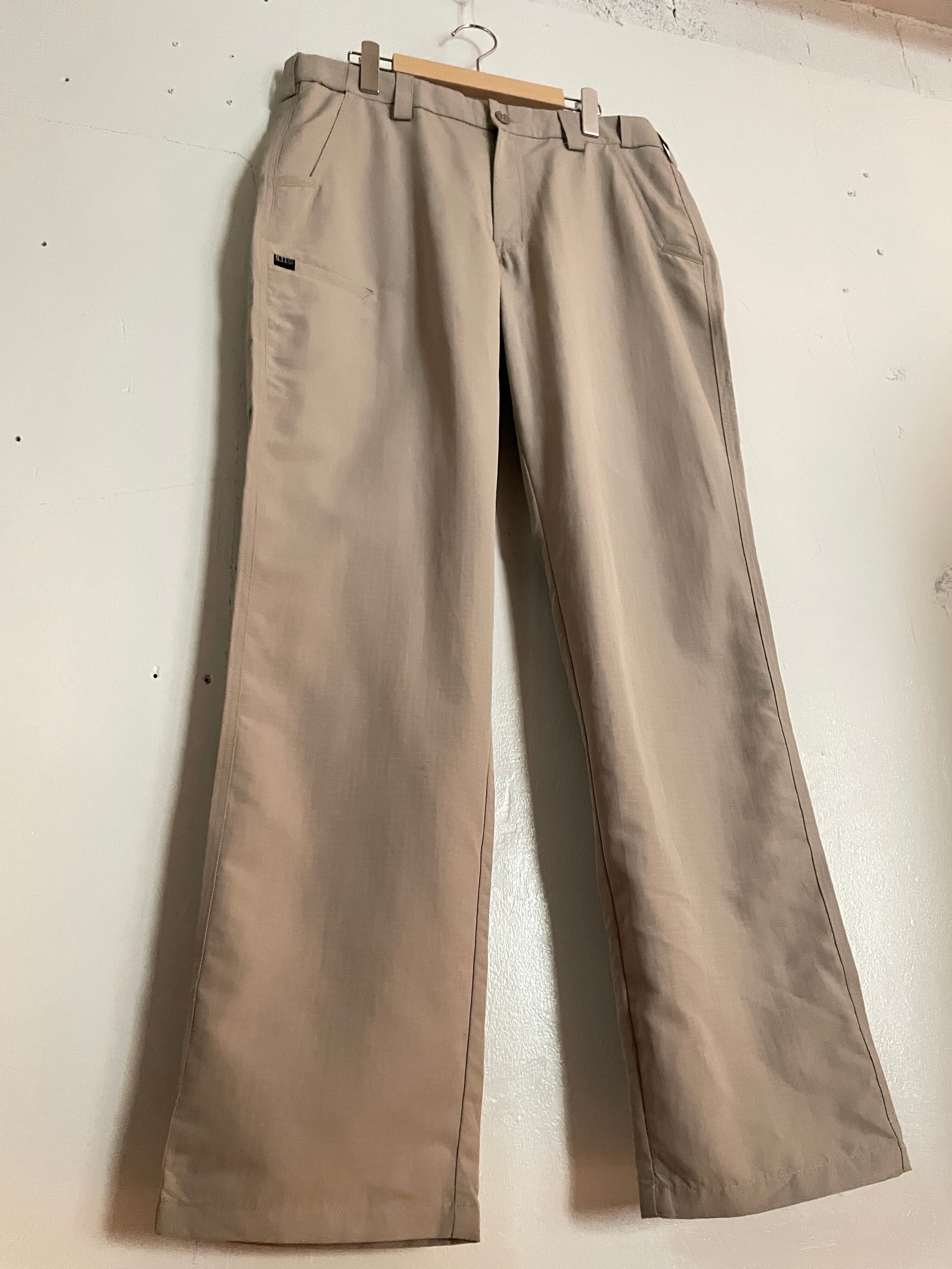 サラッとした、ナイロンパンツのような質感の、5.11タクティカルのポリワークパンツ。楽に履けて良い抜け感の出せるパンツかと思います。ワイドでルーズめなシルエット。ストリートな雰囲気もありつつ、カジュアルな雰囲気も感じられるアイテムです。