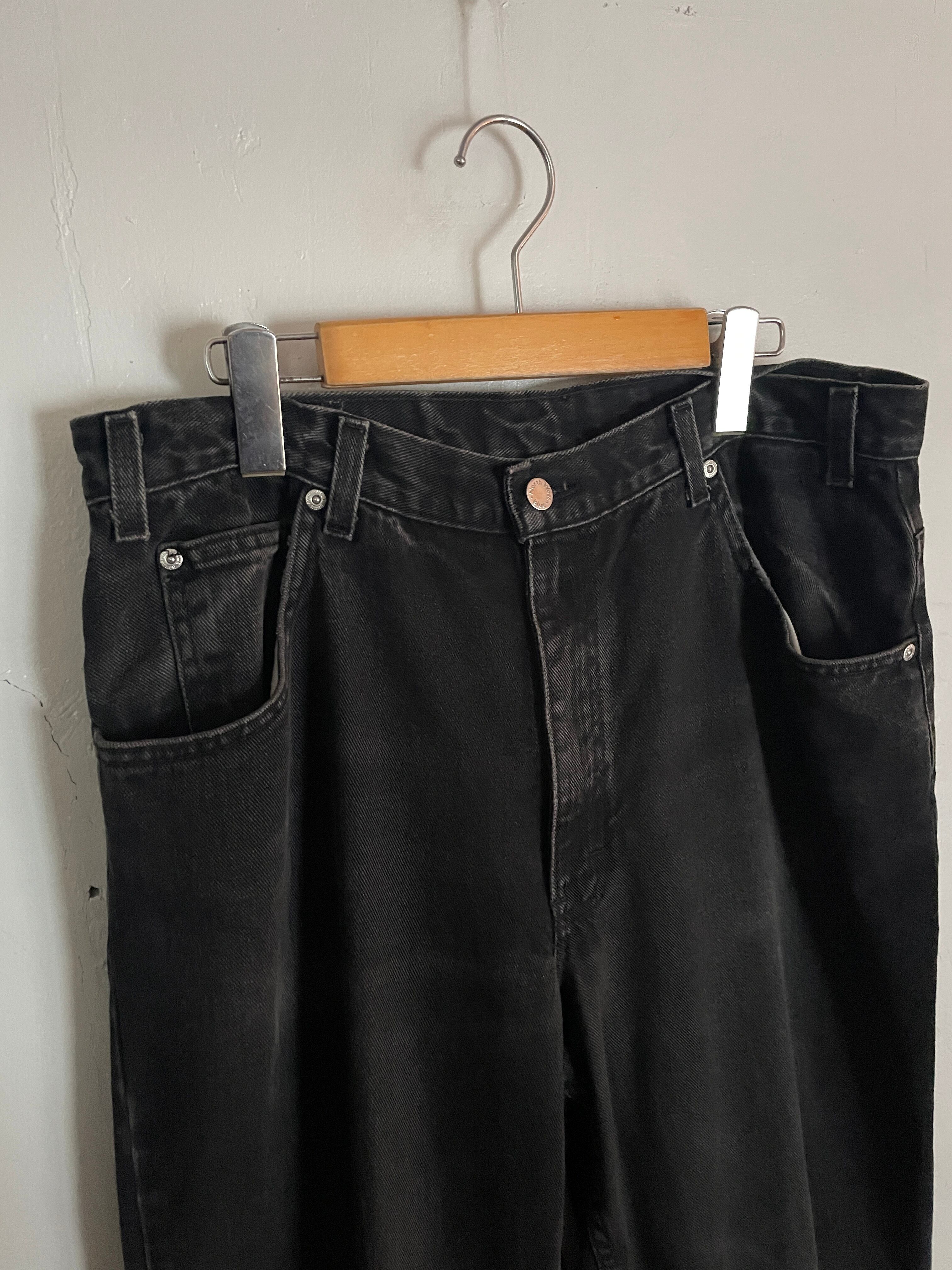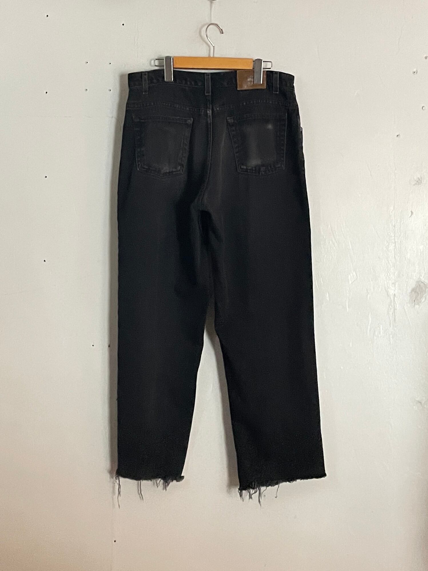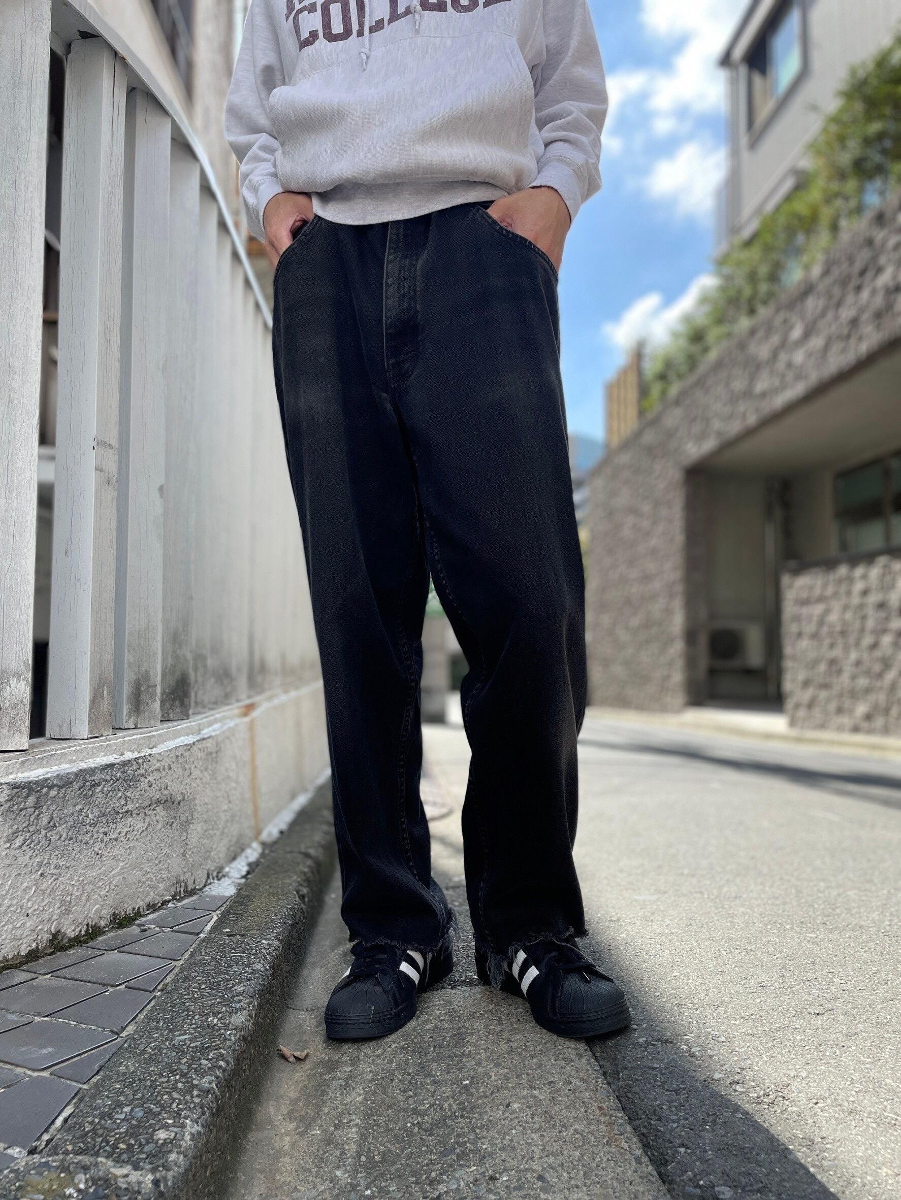 やや褪せたブラックカラーで、裾がカットオフされた、ワイドデニムパンツ。あえてほつれを残して、雑な感じが逆にグッド。ガツンとワイドでストレートシルエット。かなり重宝しそうなデニムパンツです。USA製なのもポイント高めです。