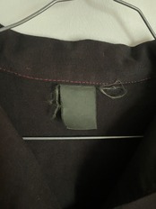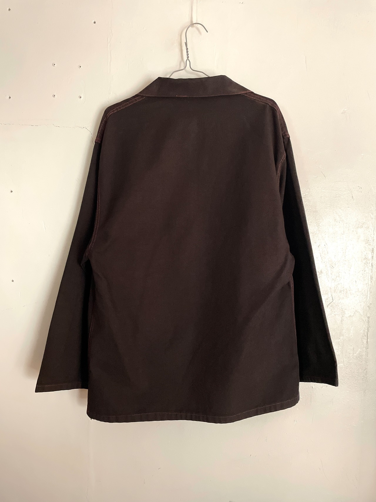 首元のスキッパーデザイン、黒ボディに赤のステッチが映えるフィッシャーマンスモック。内側に胸ポケットが付いているデザインですが、裏返して表に出して着ることも可能なリバーシブル仕様です。やや赤みがかった黒のボディ、ステッチが赤というところから、本来は赤のボディで黒にオーバーダイされている事が予想できます。似たようなデザインでフランス製のものがあるため、おそらくユーロアイテム。個性を出せるお洒落な一着です。