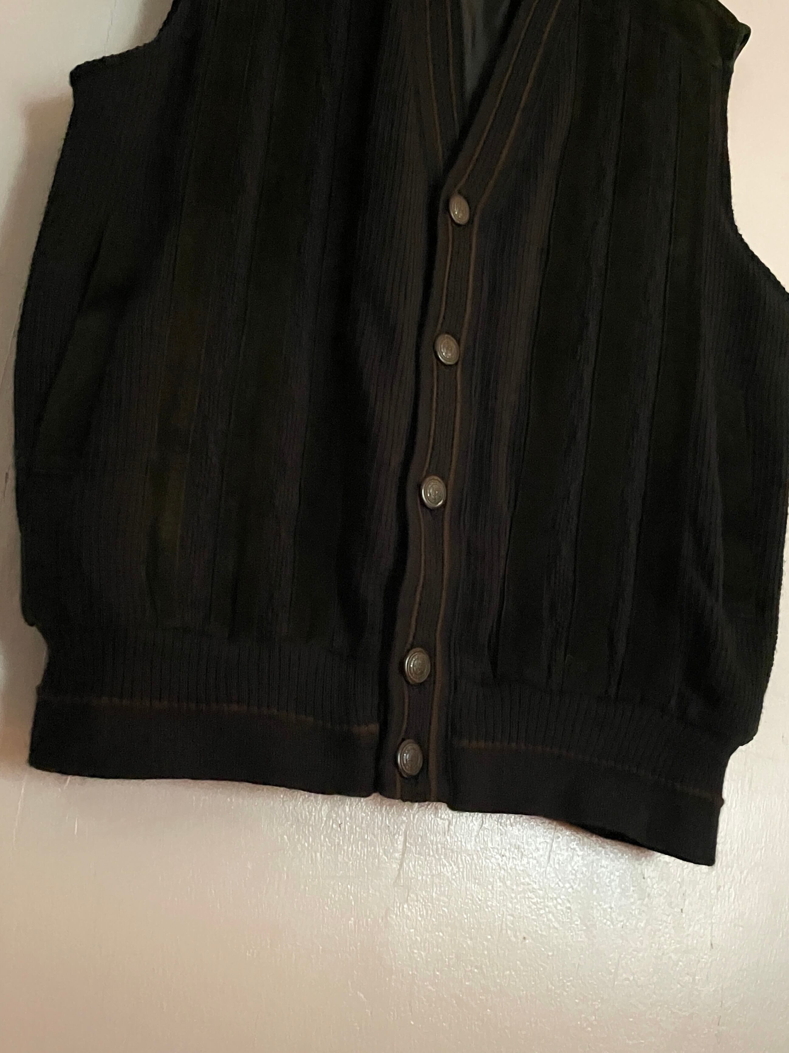 スエードレザーとニット素材の組み合わせで作られたベスト。全体的に暗めの色合いで、前開きと裾部分は、ライン入りのリブで切替えられています。裏地付きのため着心地もいいです。サイズも程よく、いろんなアイテムとも相性の良い便利なレイヤードアイテムです。
