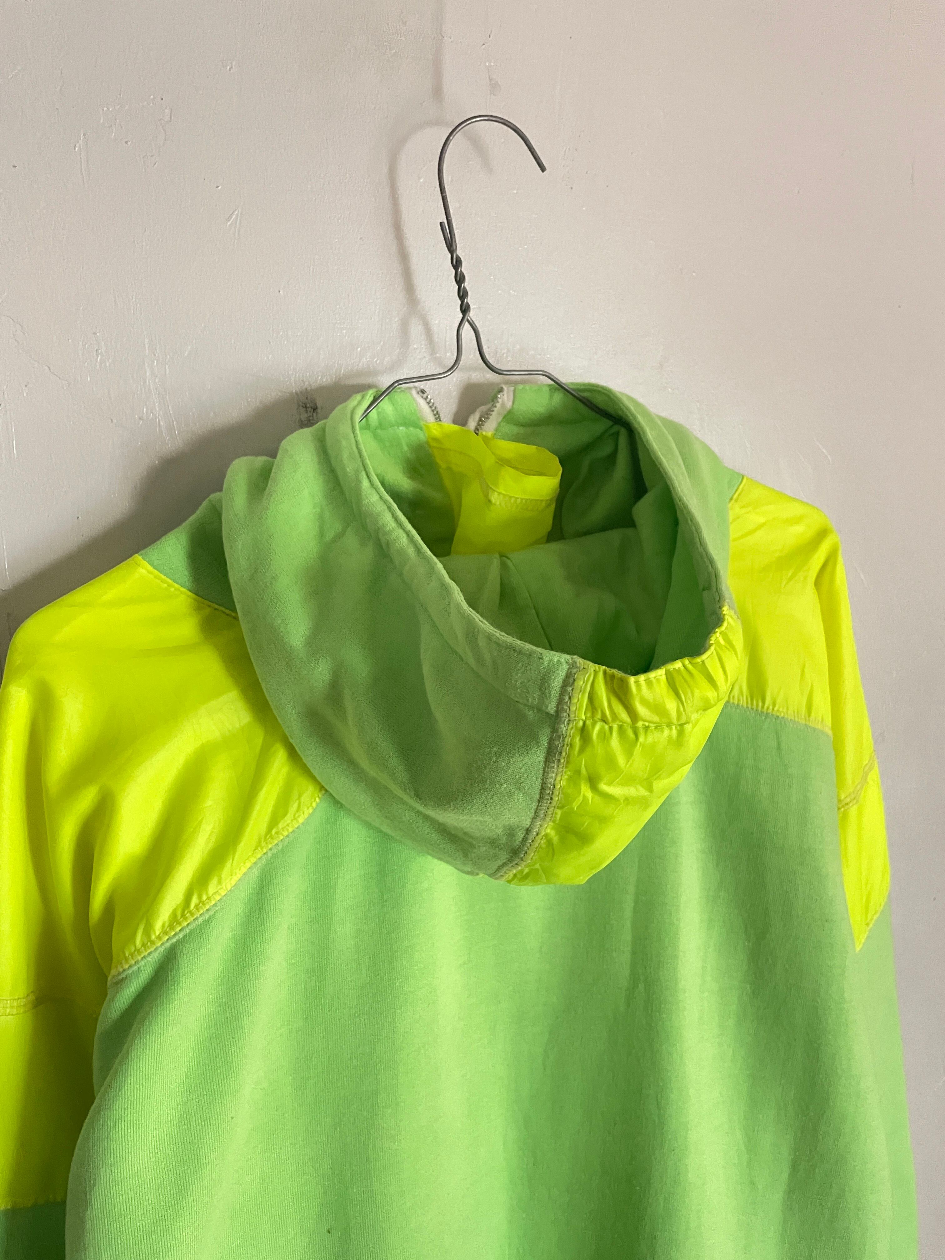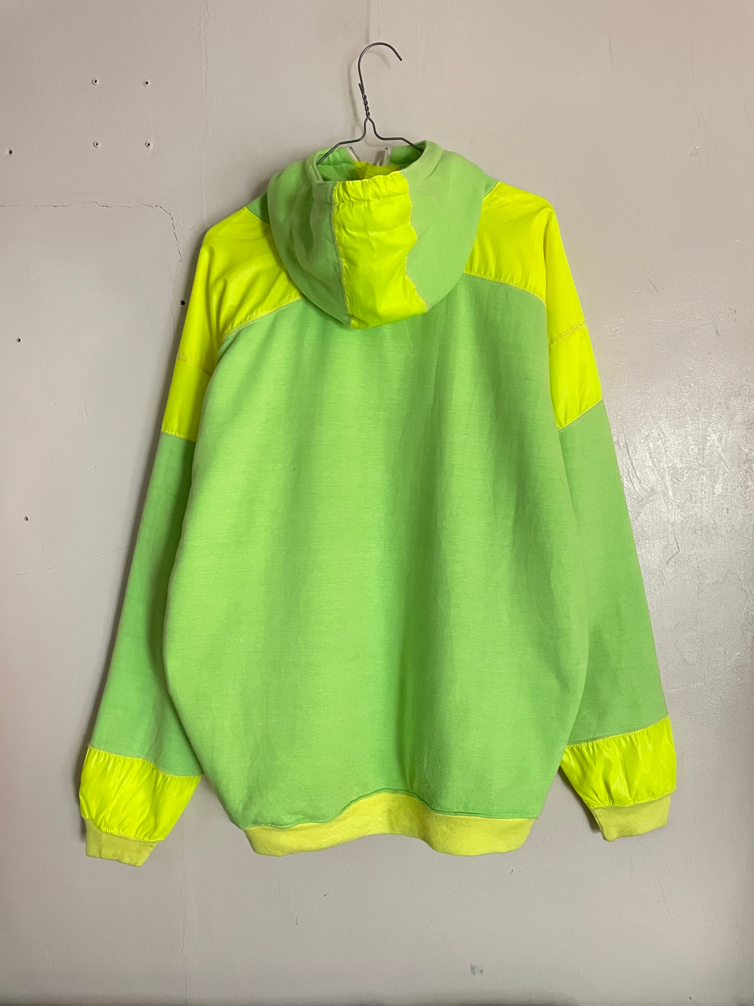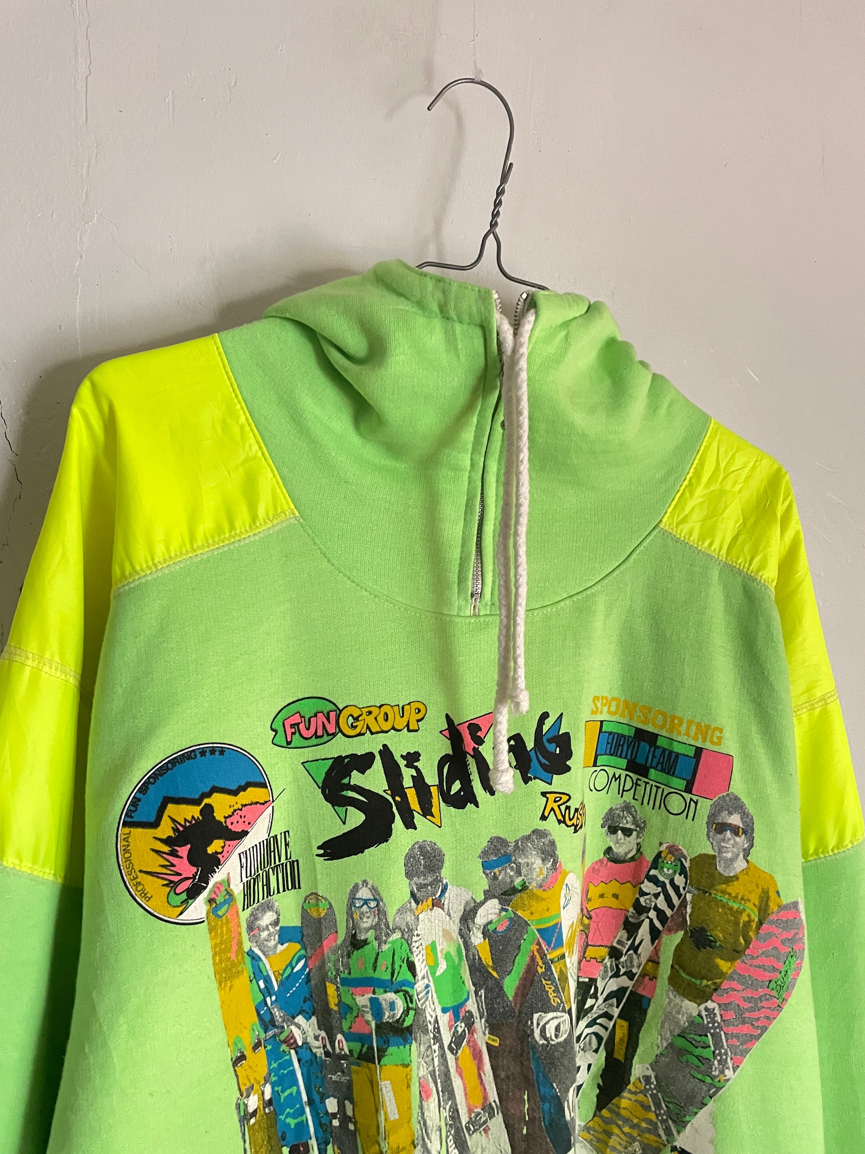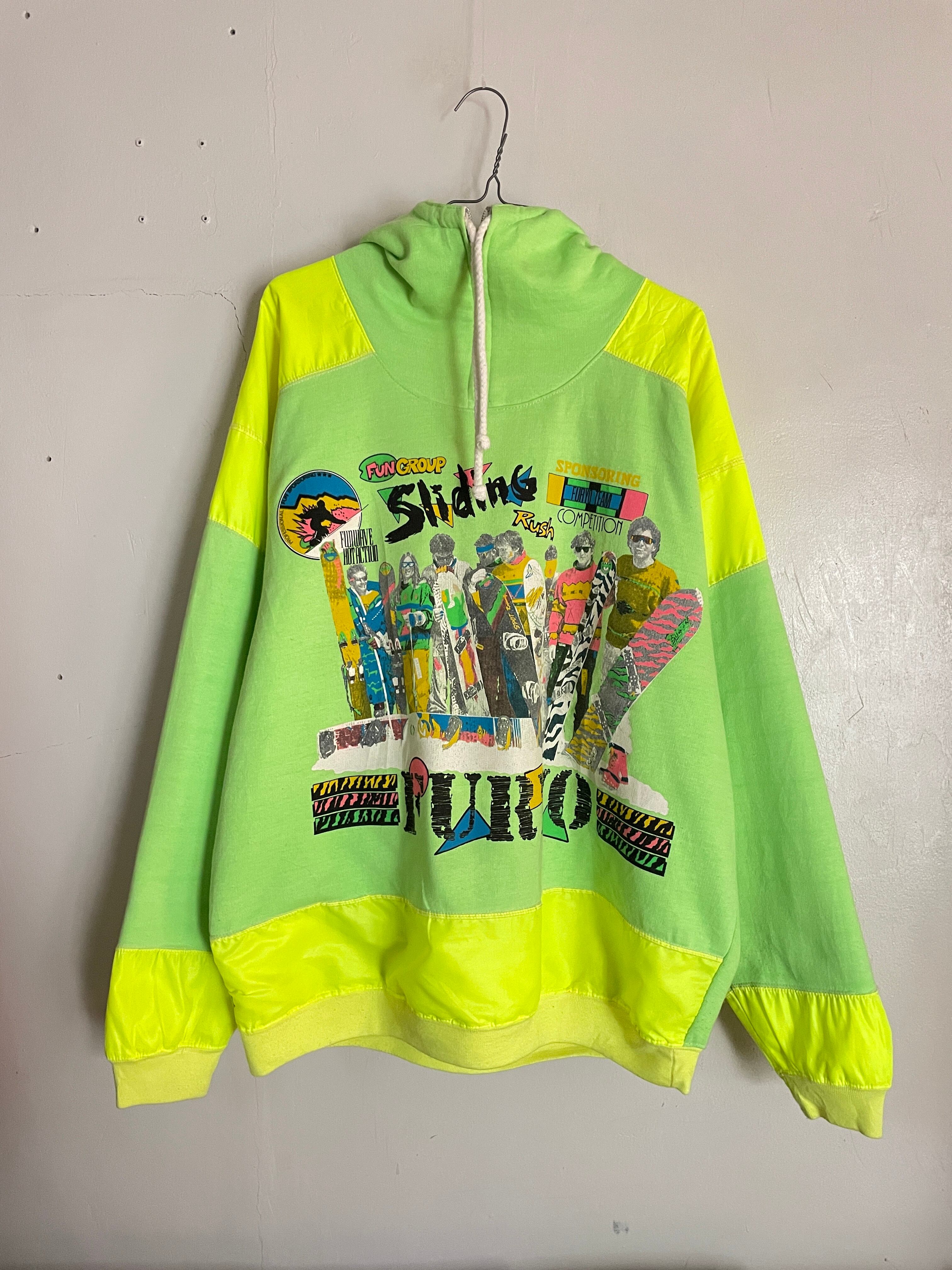 黄緑ボディにスノーボードを楽しむ男女がプリントされたハーフジップパーカー。肩部分と裾付近がナイロン素材で切り替えられているデザインです。ネックがやや高めの設計で、ジップを開けるとナイロン素材のマチが付いています。キルティングの裏地付きのため保温性は高め。インパクトのあるポップな印象の一枚。