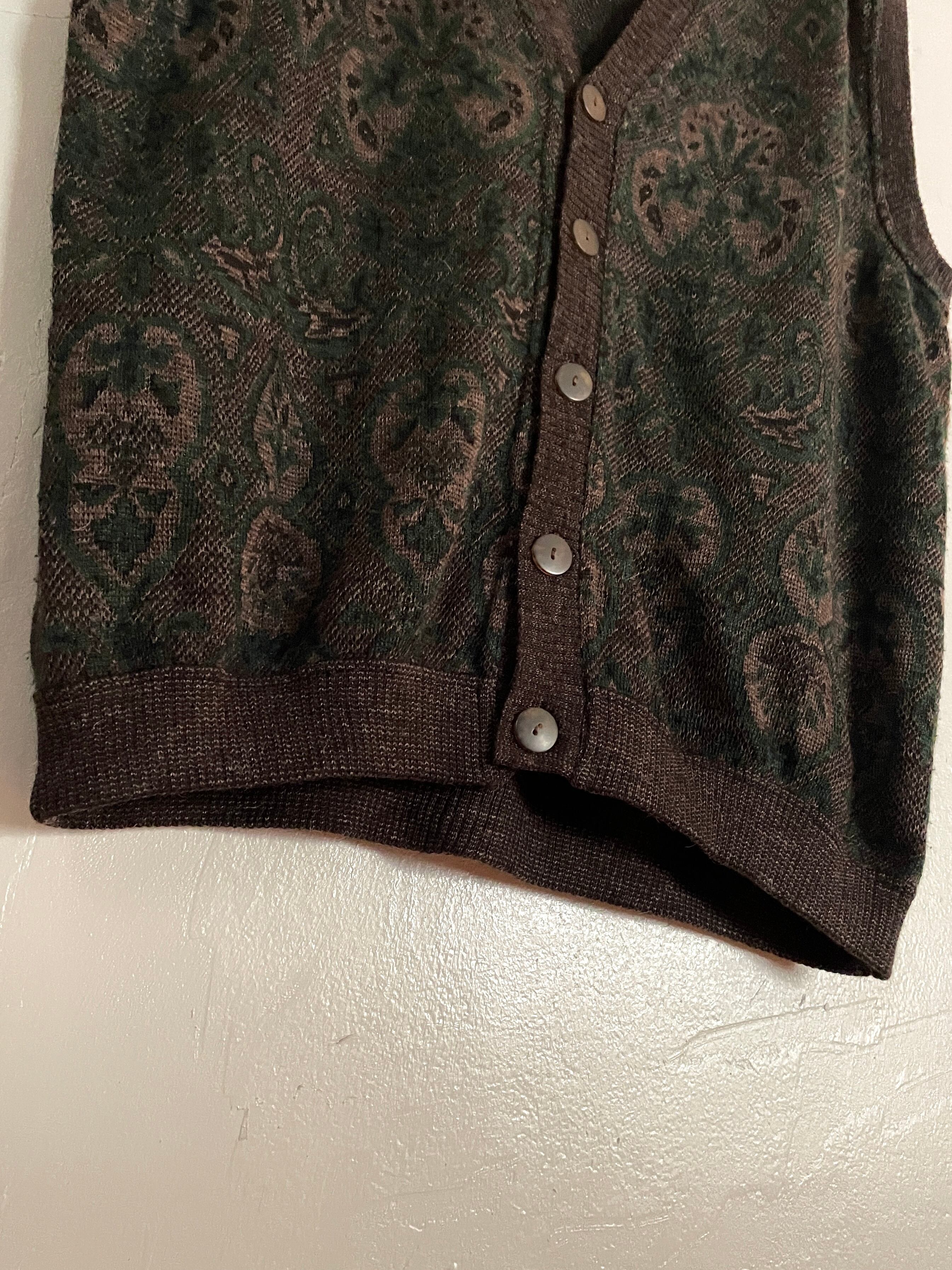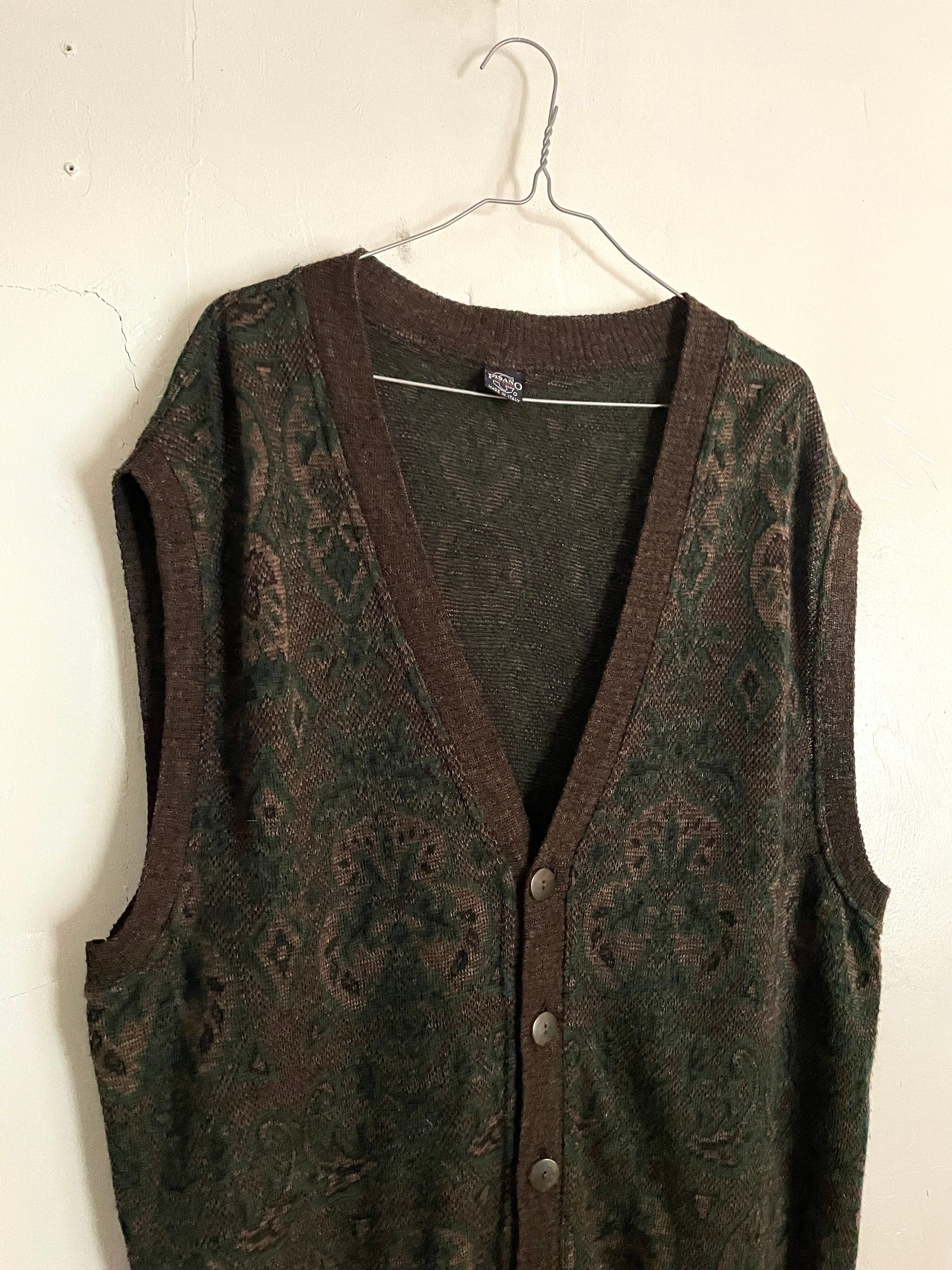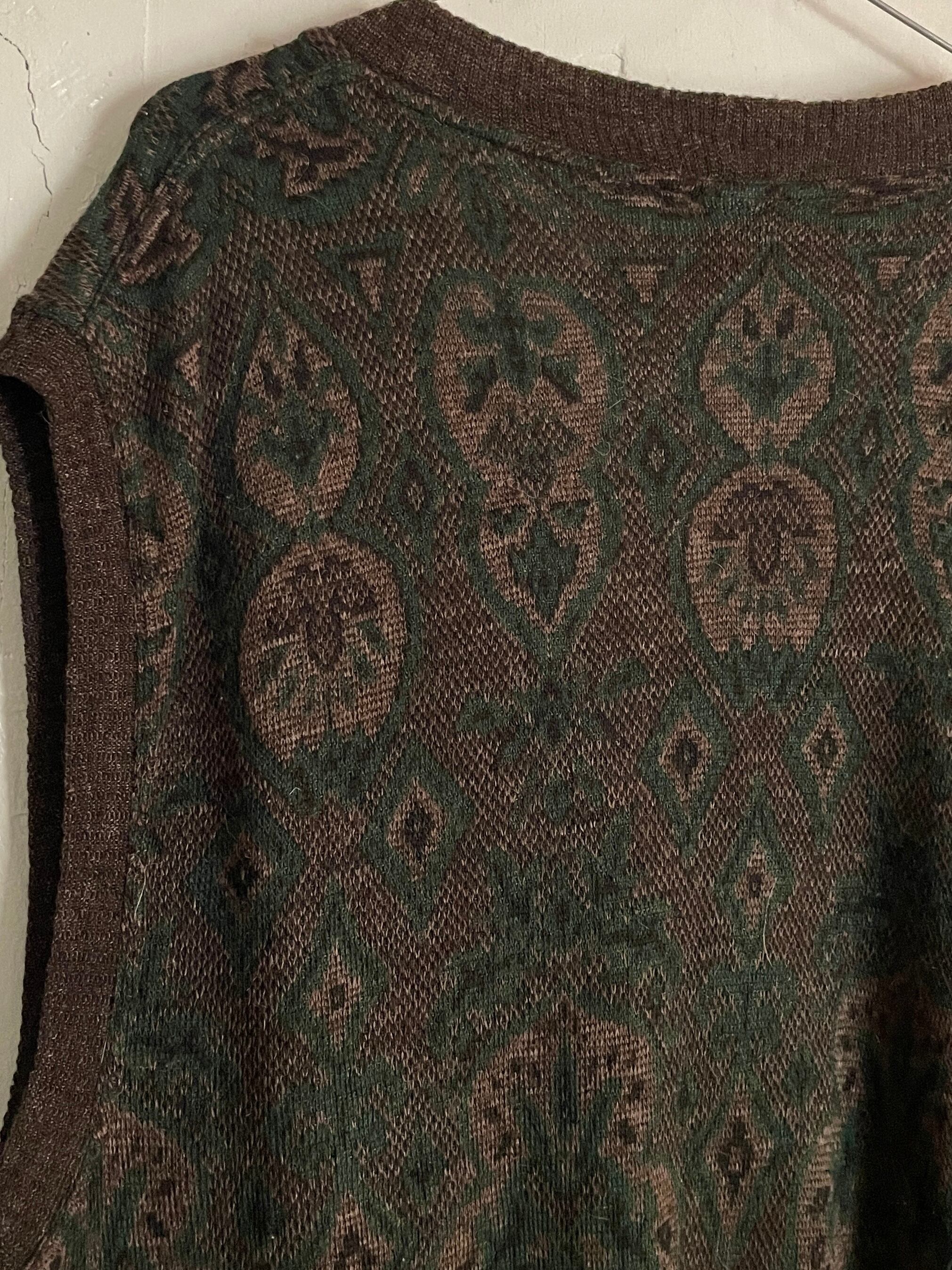 花のような何かの紋章のような、独特な柄が全体に広がるニットベスト。ダークブラウンをベースに、濃いグリーンが混ざったような落ち着いた色味です。またアクリル・ウールにアルパカがプラスされていることで若干の毛足が見られます。アームホールが広めでゆったりとしたサイズ感はレイヤードに最適だと思います。イタリア製。