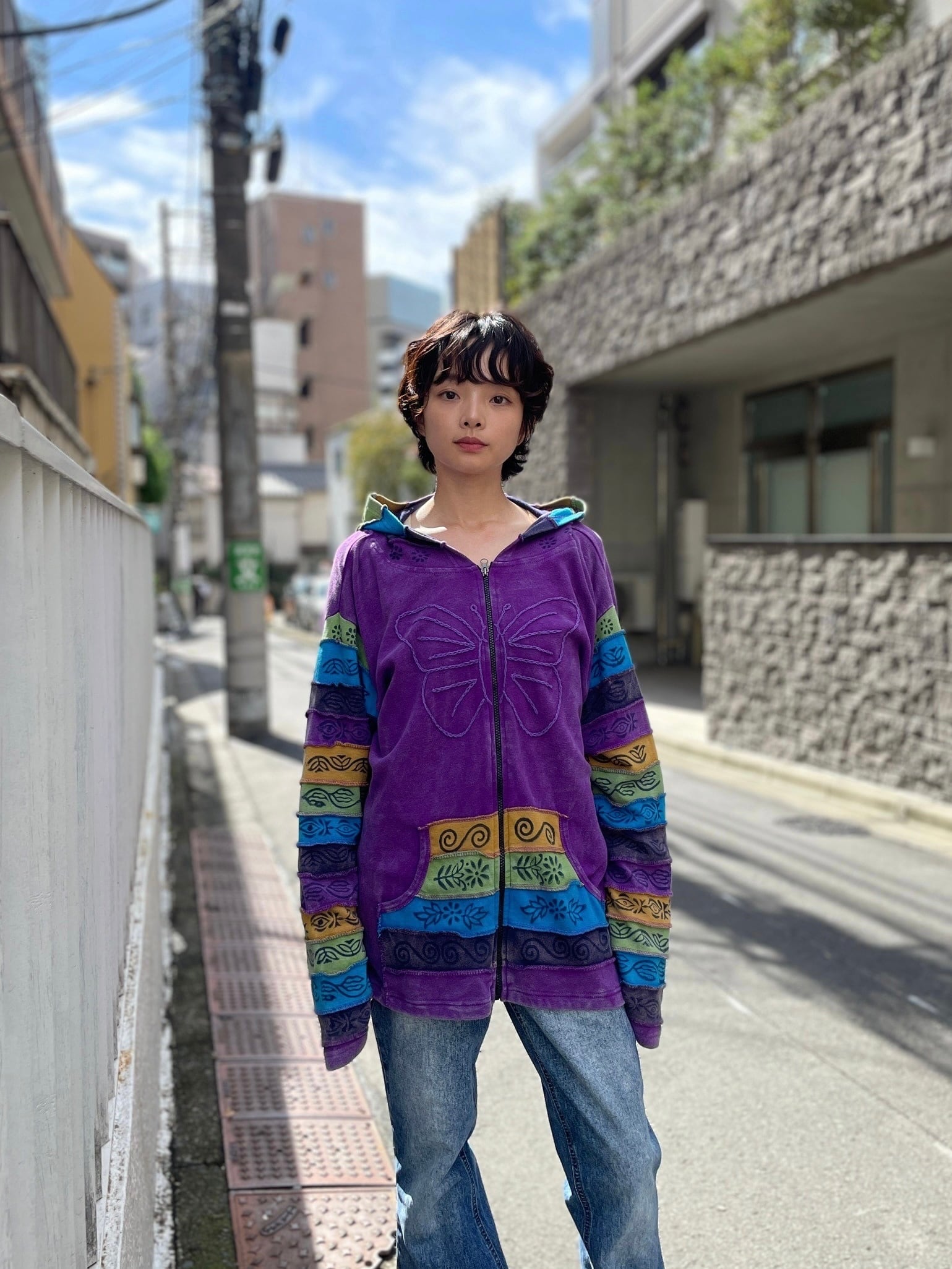 褪せ感のある紫のボディに蝶々の刺繍デザイン、何枚もの違った柄と色の素材が使われた、継ぎはぎの袖とポケット、フードが特徴的なフルジップパーカー。カラフルな色使いに独特の柄がエスニックな雰囲気の一枚です。使いやすいフルジップタイプで、大き過ぎず小さ過ぎない程良いサイズ感。男性、女性どちらにもおすすめの一着です。