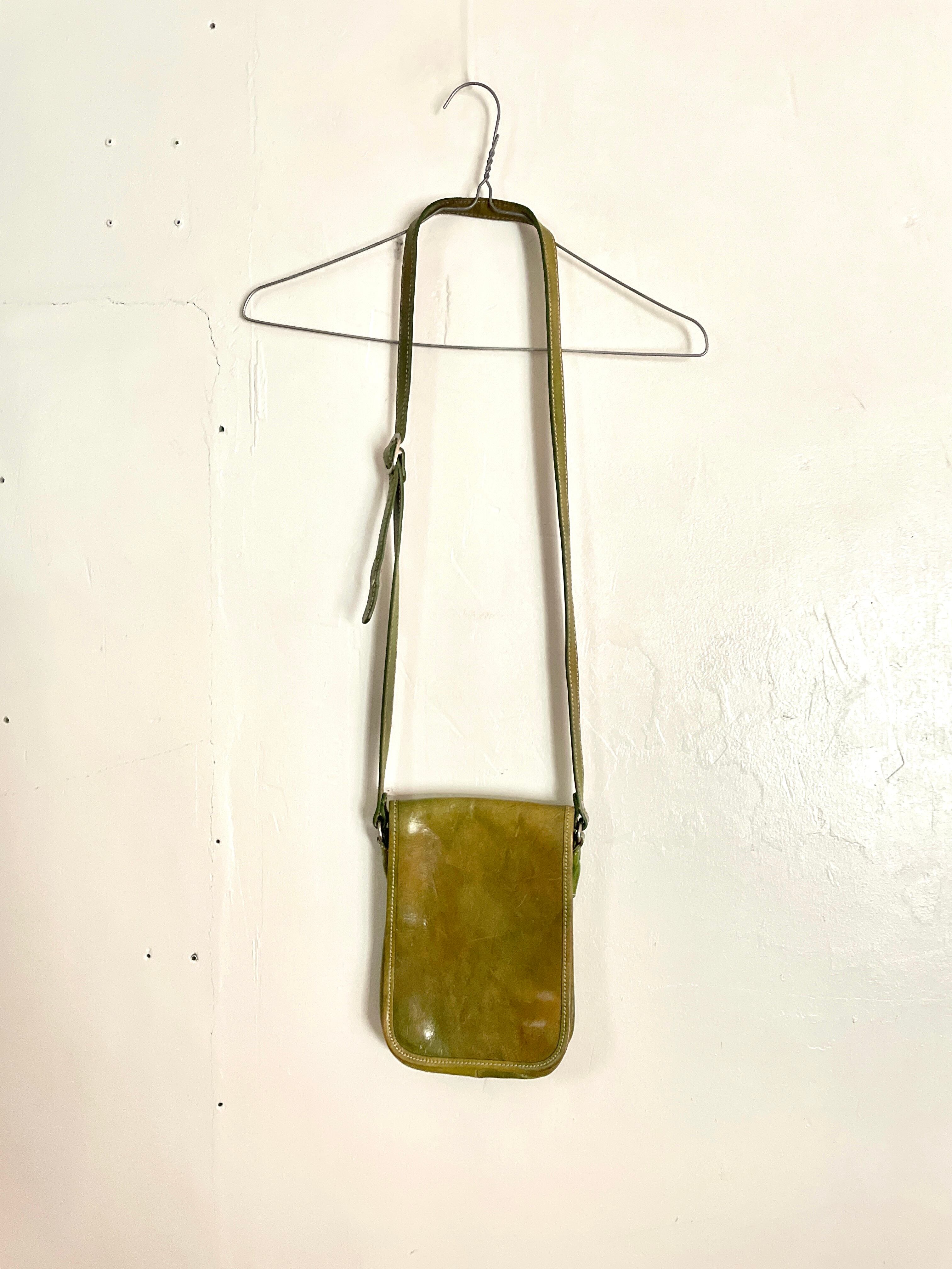 黄緑のようなカーキグリーンのような独特の色味で、やや小ぶりなサイズ感が可愛らしいレザーポーチ。縦長な形で中には仕切りのついた2つポケット、内側にジップポケットと、ペン差しもついています。後ろ側には大きめのジップポケット付き。肩紐もサイズ調整可能と、使いやすいデザインです。