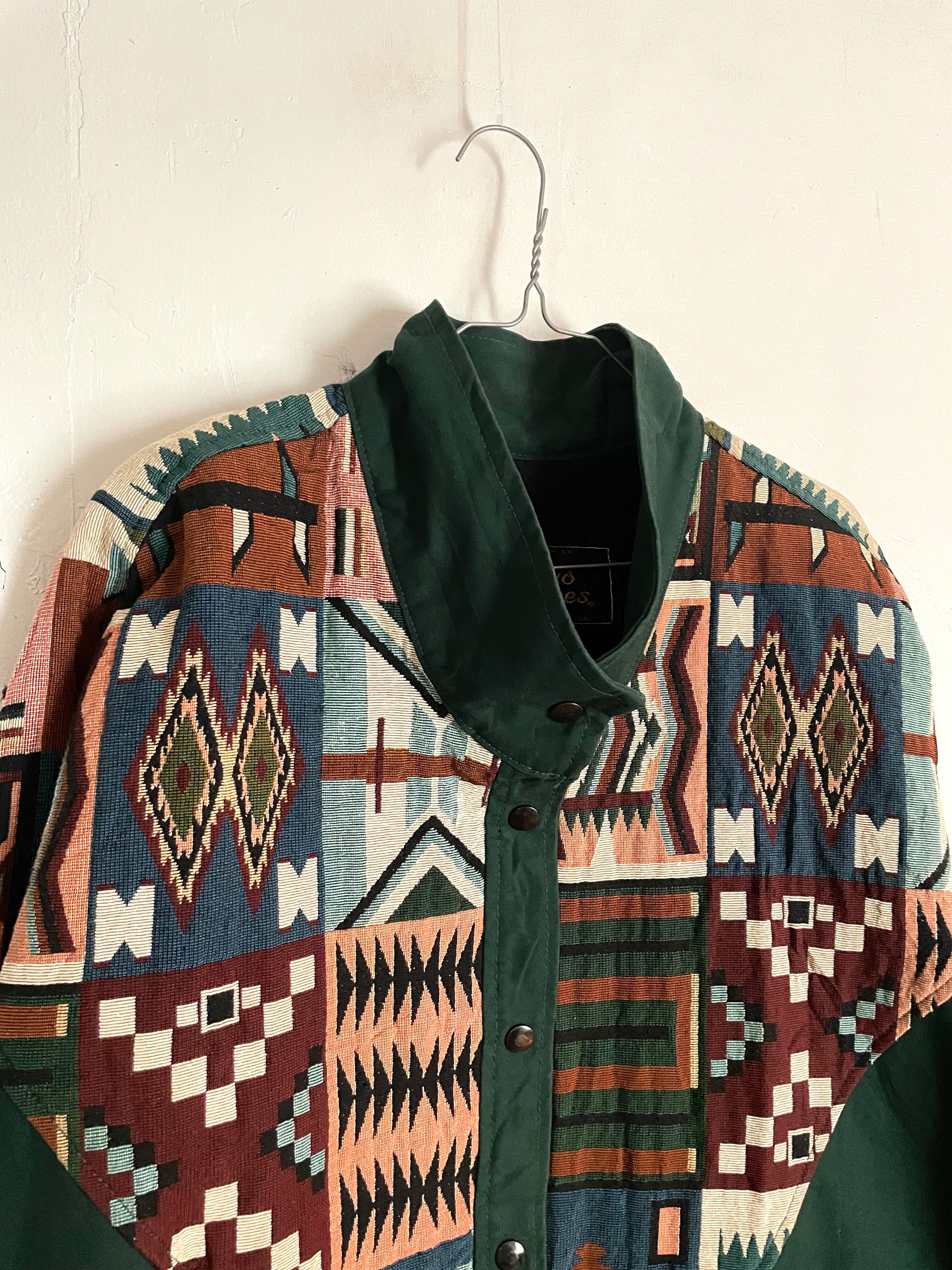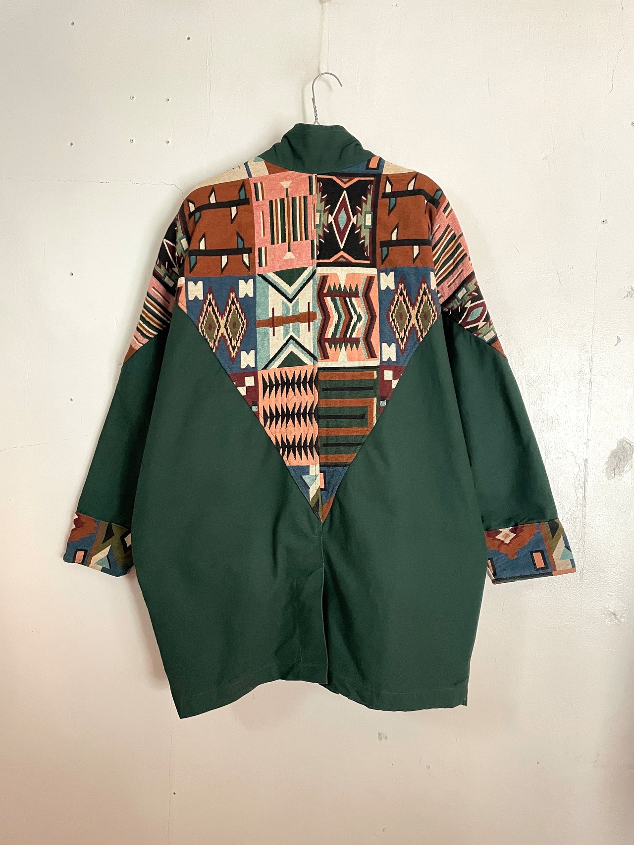 グリーンの無地素材に、ネイティブ調の柄切替えがお洒落なデザインジャケット。やや高めの襟に、ボディと袖が繋がったようなドルマンスリーブ仕様です。フリース素材のような裏地付き、前開きはスナップボタン、見た目よりも重くないのもポイントです。着丈長め、身幅広めで存在感大の、コーディネートのメインを張れる一着です。