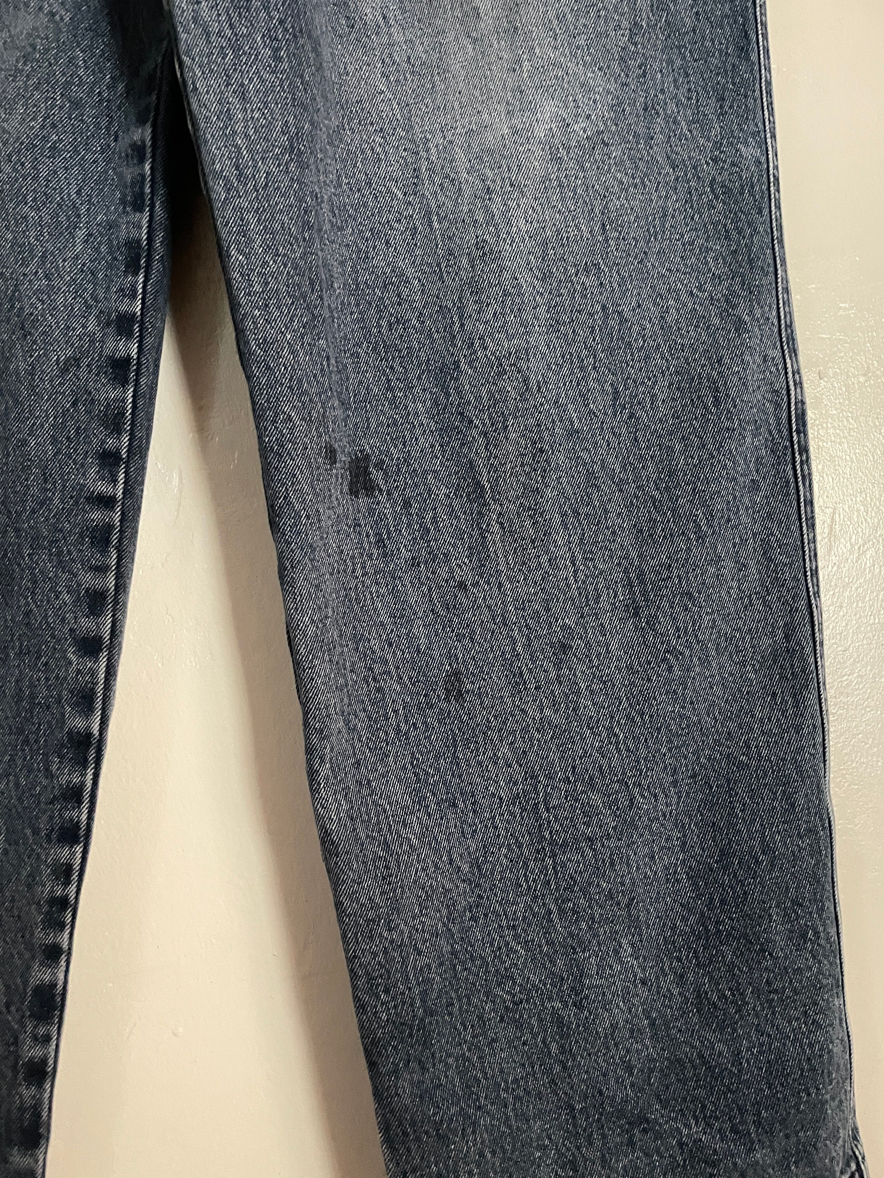 やや褪せたブルーカラーで、ガツンとワイドなシルエットが魅力的な、ワークデニムパンツ。ヒップホップな雰囲気が漂うディテール。所々に黒い汚れのようなものが見られますが、もはやデザインのように感じます。様々なアイテムとの相性の良い一本です。