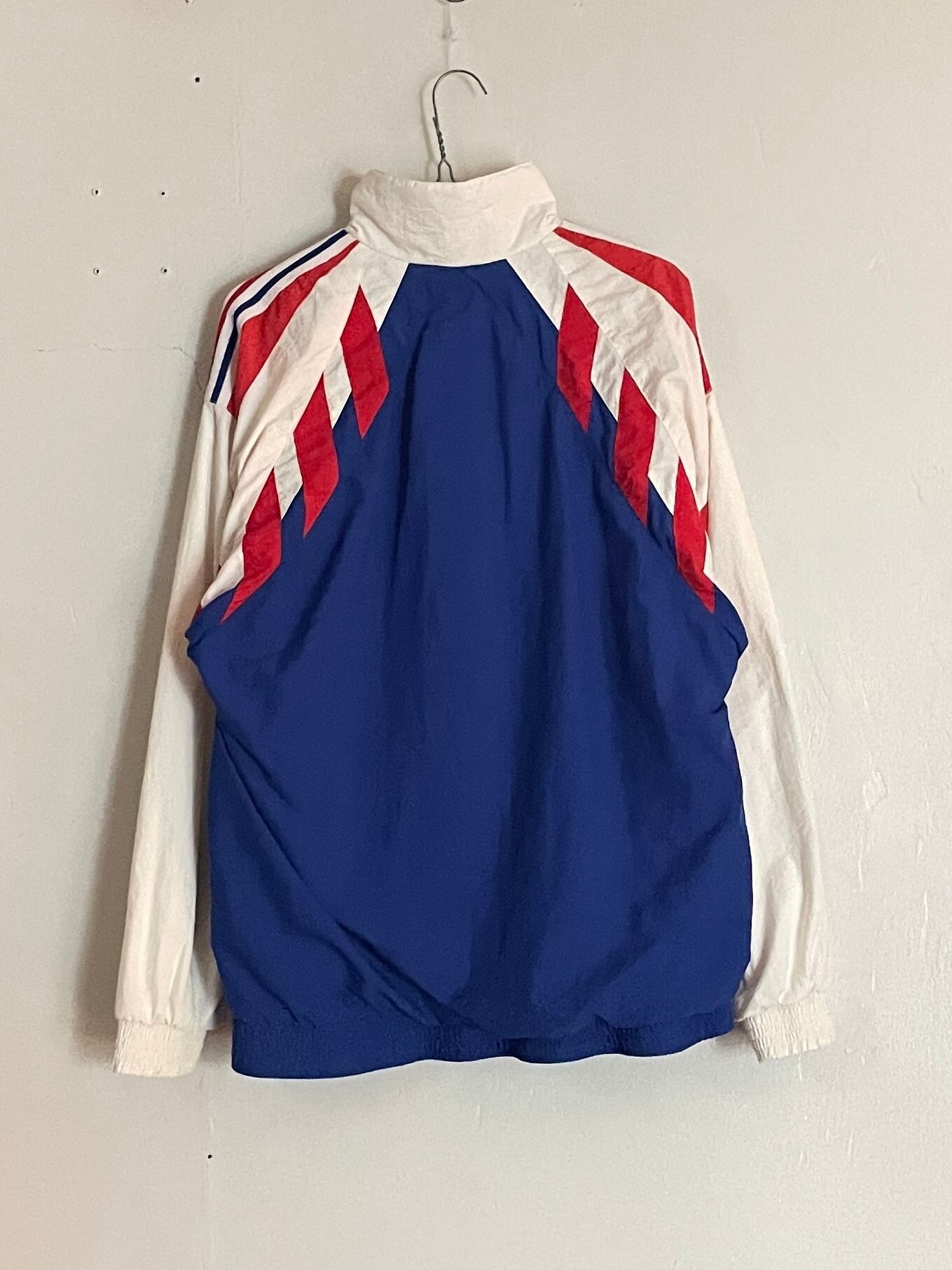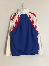 お洒落なマルチカラーボディーの、アディダスナイロンジャケット。サッカーフランス代表の象徴である雄のニワトリのワッペンが、施されています。金の刺繍がかっこいいです。肩、胸元のラインデザインがグッドです。銀タグな事から、80年代のアイテムかだという事がわかります。裏地はポリとコットンのフワッとした肌触り抜群の生地感。これからの季節ファッションの主役になってくれるアイテムです。