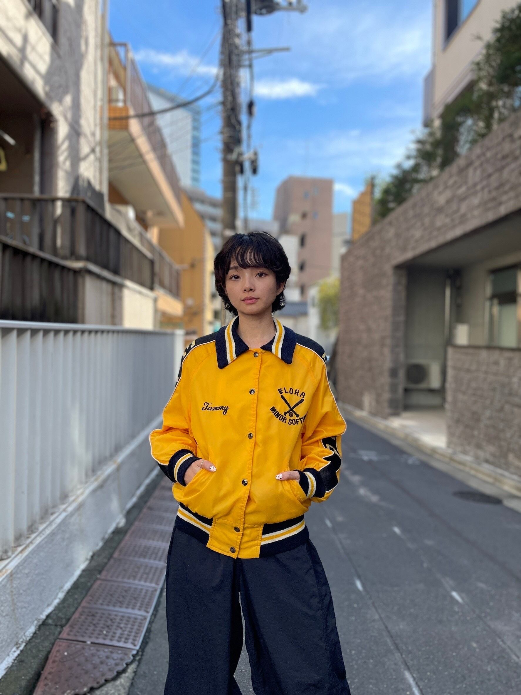 光沢のあるイエローボディーに、ブラックの刺繍やリブの切り替えなどが施された、スナップブルゾン。フロントにはカナダにある”エローラ”のソフトボールチームの刺繍。両袖部分のブラックにイエロー×ホワイトのエローラ刺繍もお洒落です。ネック、袖口、裾はリブ仕様になっています。短丈めなシルエットに対し、身幅はたっぷりとある、今っぽいサイズ感なってます。ナイロン素材なので、今の時期にはぴったりのアイテムです。左ポケットが破れています。