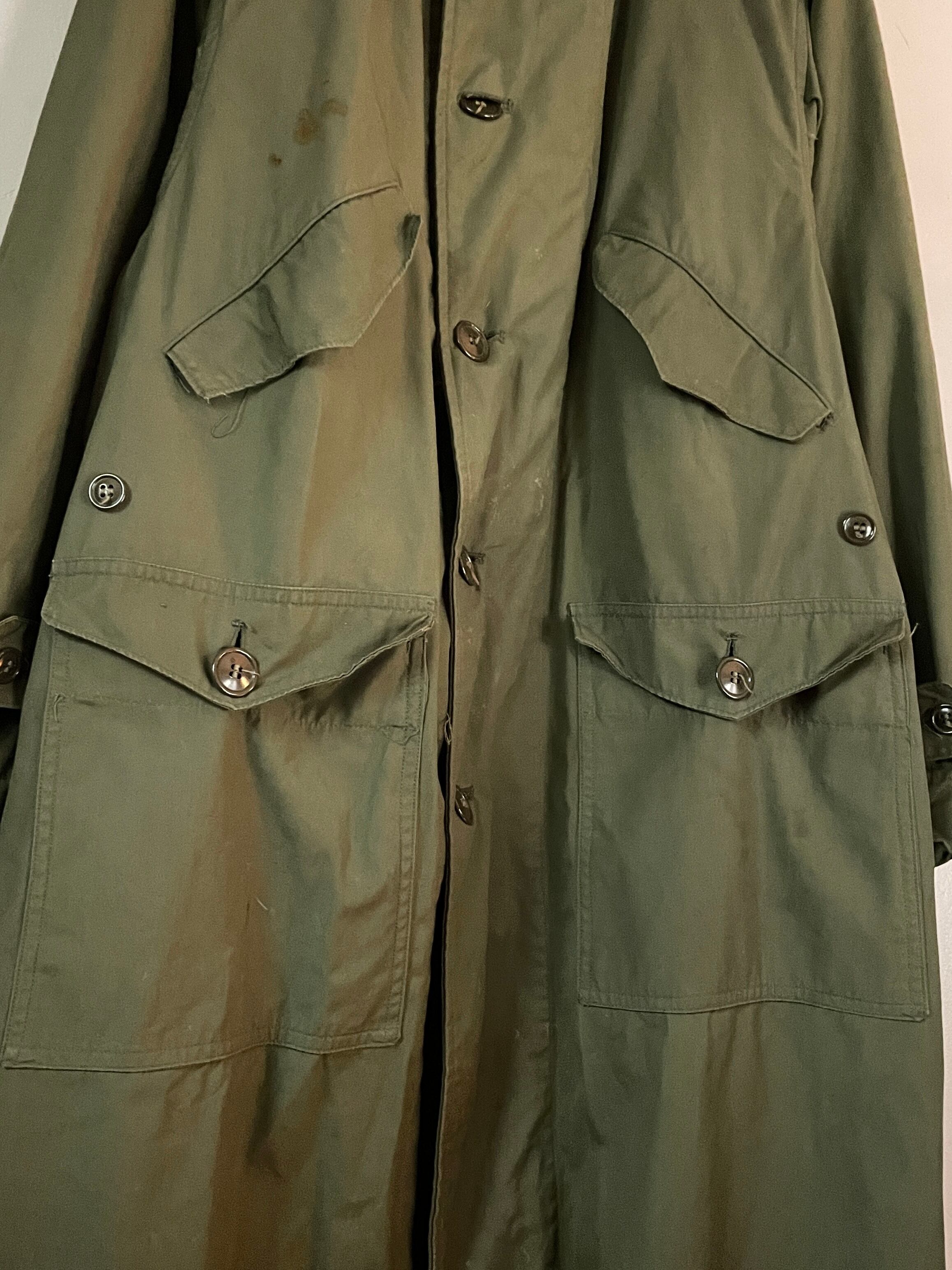 モッズコートの呼び名で知られるM-51やM-65の前身にあたる、M-47フィールドパーカー。ウエスト部分にベルトが付くU.S.Armyのものではなく、ボタンによるアジャスターが付いたUSMC(アメリカ海兵隊)のモデルです。特徴的な前ポケットのデザインで、フードが一体型になったディテール。本来ライナーが装備されているのですが、こちらは欠損しています。この年代のものにしては全体的なコンディションは良好、貴重なヴィンテージアイテムです。