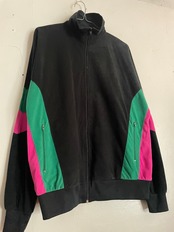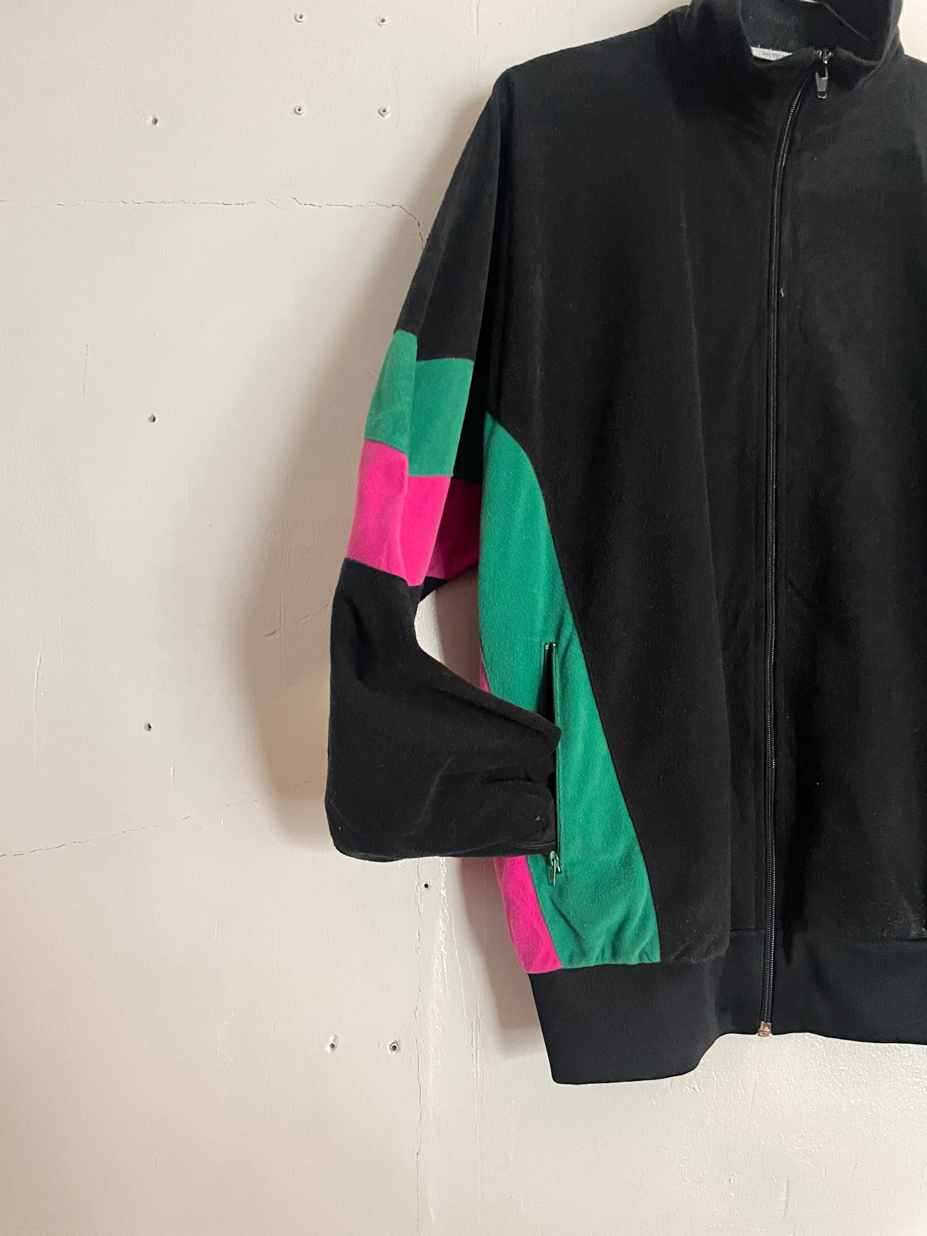 ブラックカラーに、明るいグリーン、ピンクのラインデザインが施された、ベロアトラックセットアップ。上下共にリブの締まりが良くシルエットがお洒落です。ジャケットの右袖部分にはさりげないジップ付き。パンツの裾にもジップ付きなので、フレアシルエットでも履く事が可能です。別使いも出来るのがセットアップの魅力です。べロアなのでラフに着られます。様々な使い方ができるお得感満載のアイテムです。