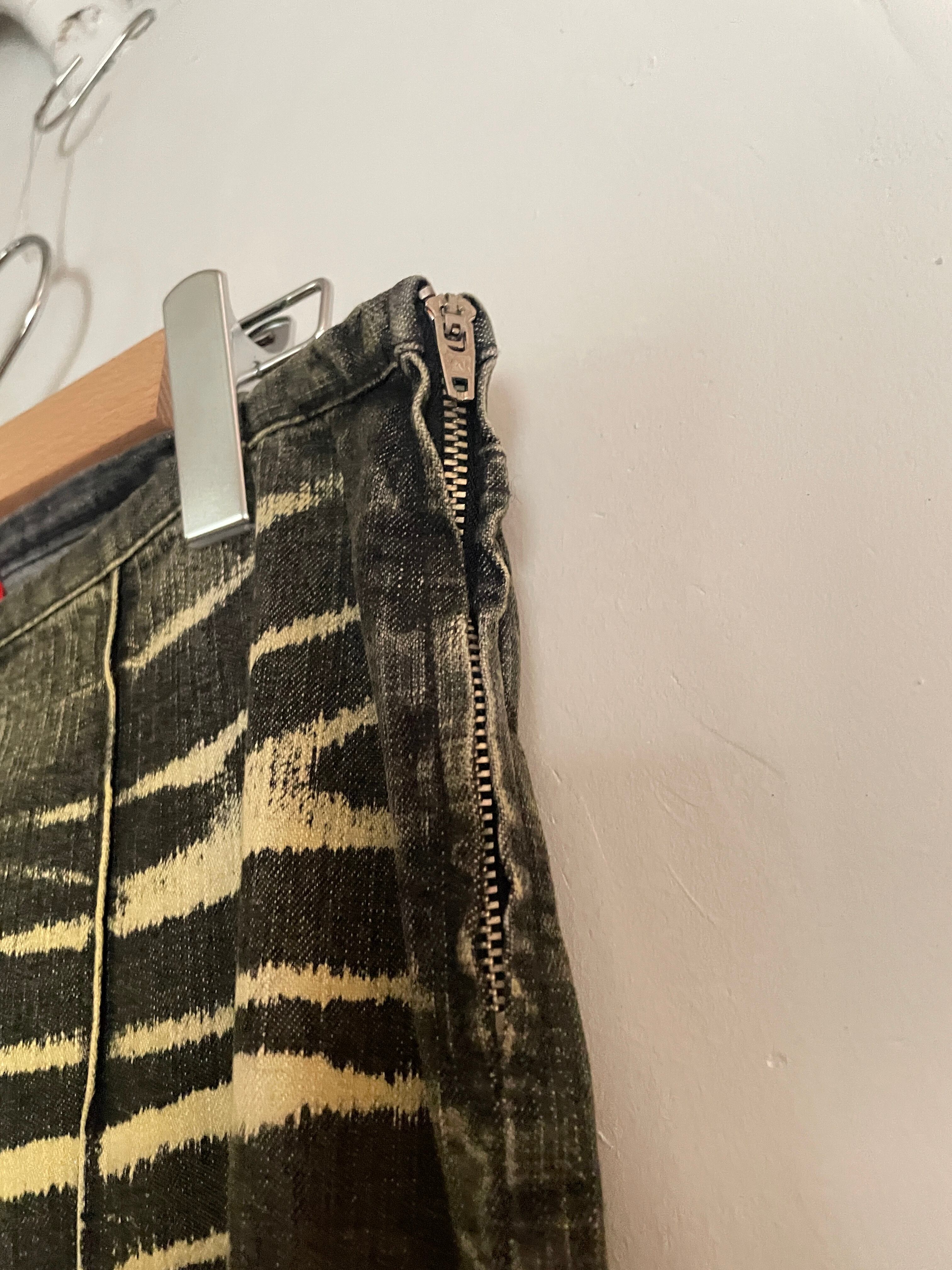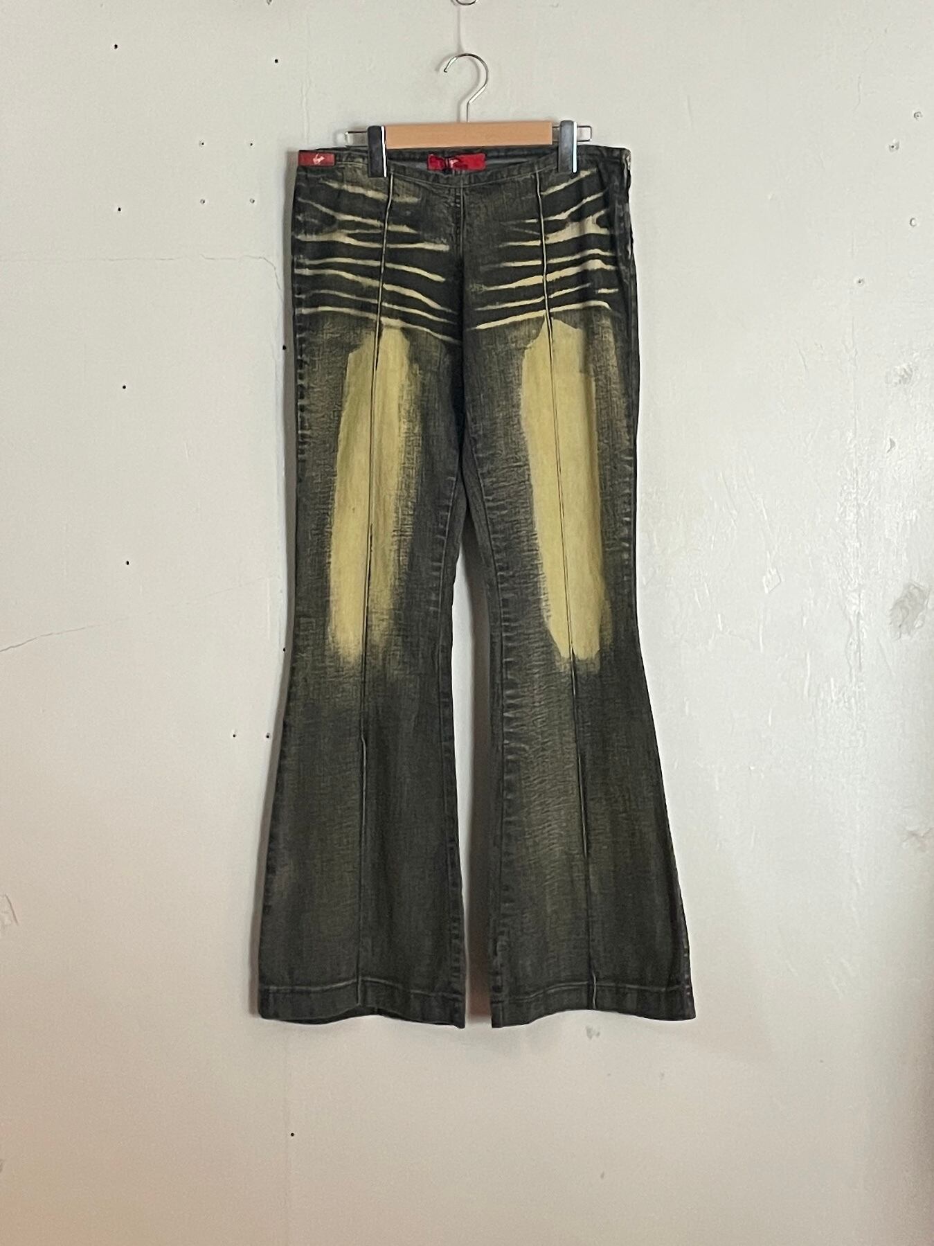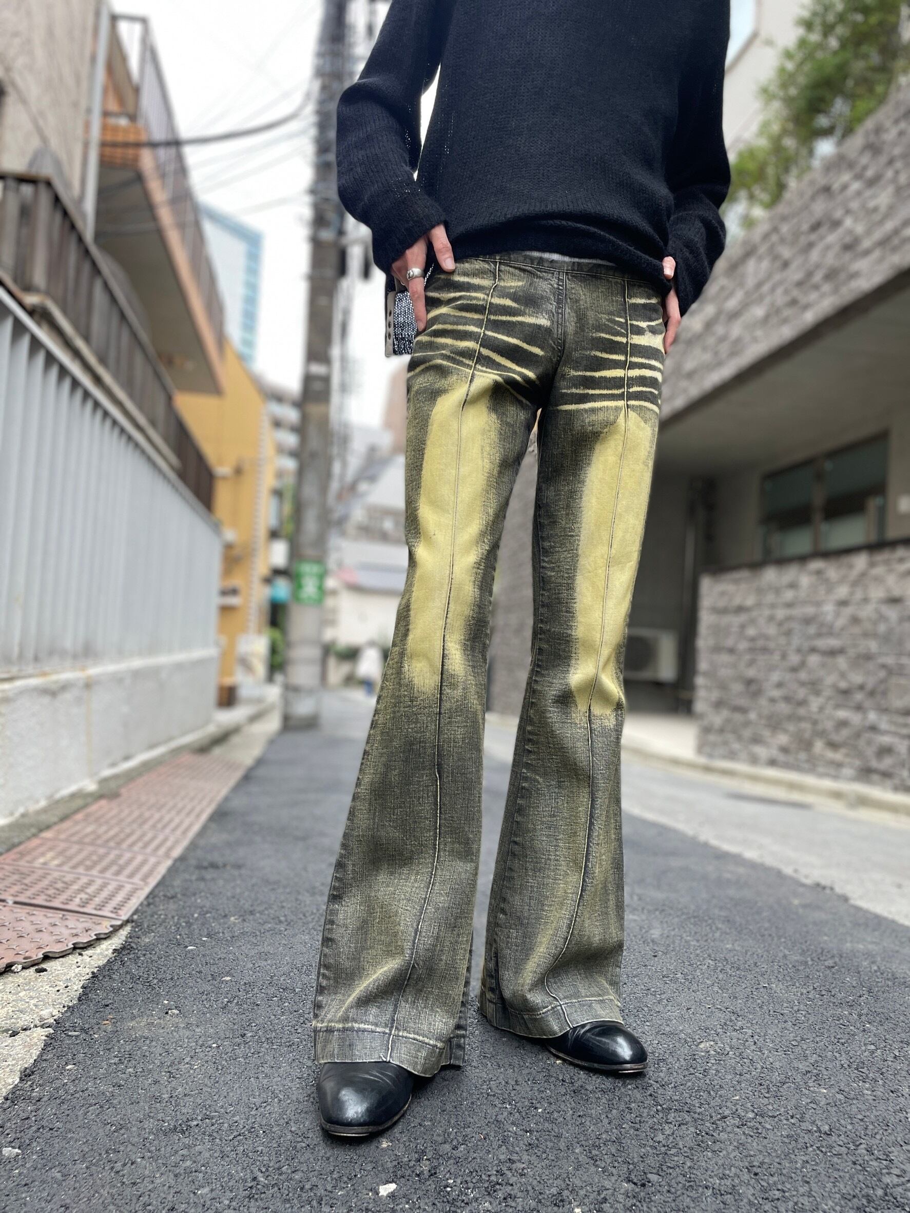 グレーカラーにウォッシュ加工が加えられた、フレアデニムパンツ。全体的にY2Kな雰囲気のあるディテールです。部分的にウォッシュ加工されているのがかっこいいです。なんといっても綺麗すぎるフレアシルエットが魅力的です。後ろ部分にはベルトループ付きで、ウエストにはサイドジップ付き。タグ付きで状態も良い、雰囲気抜群の一本です。