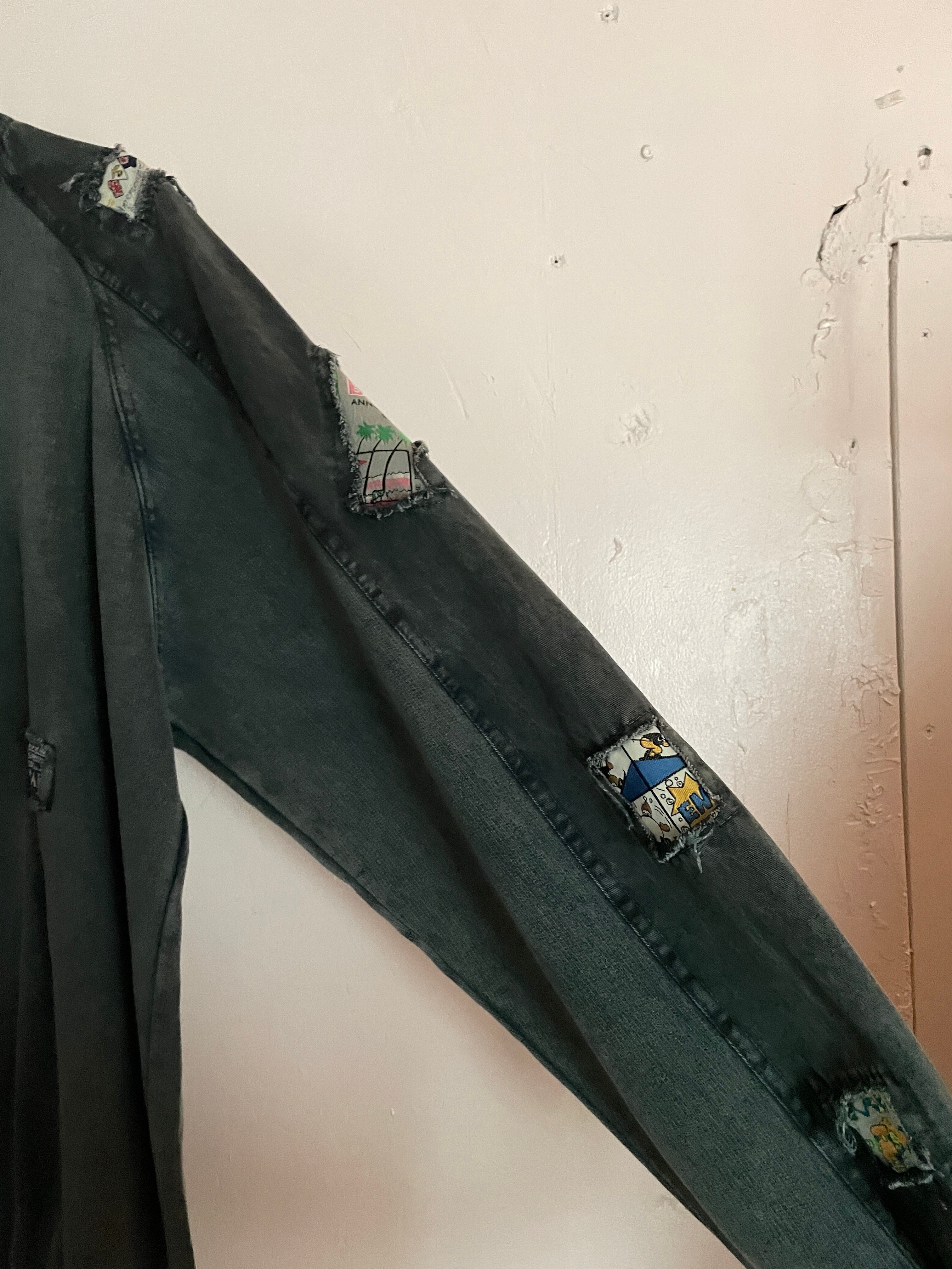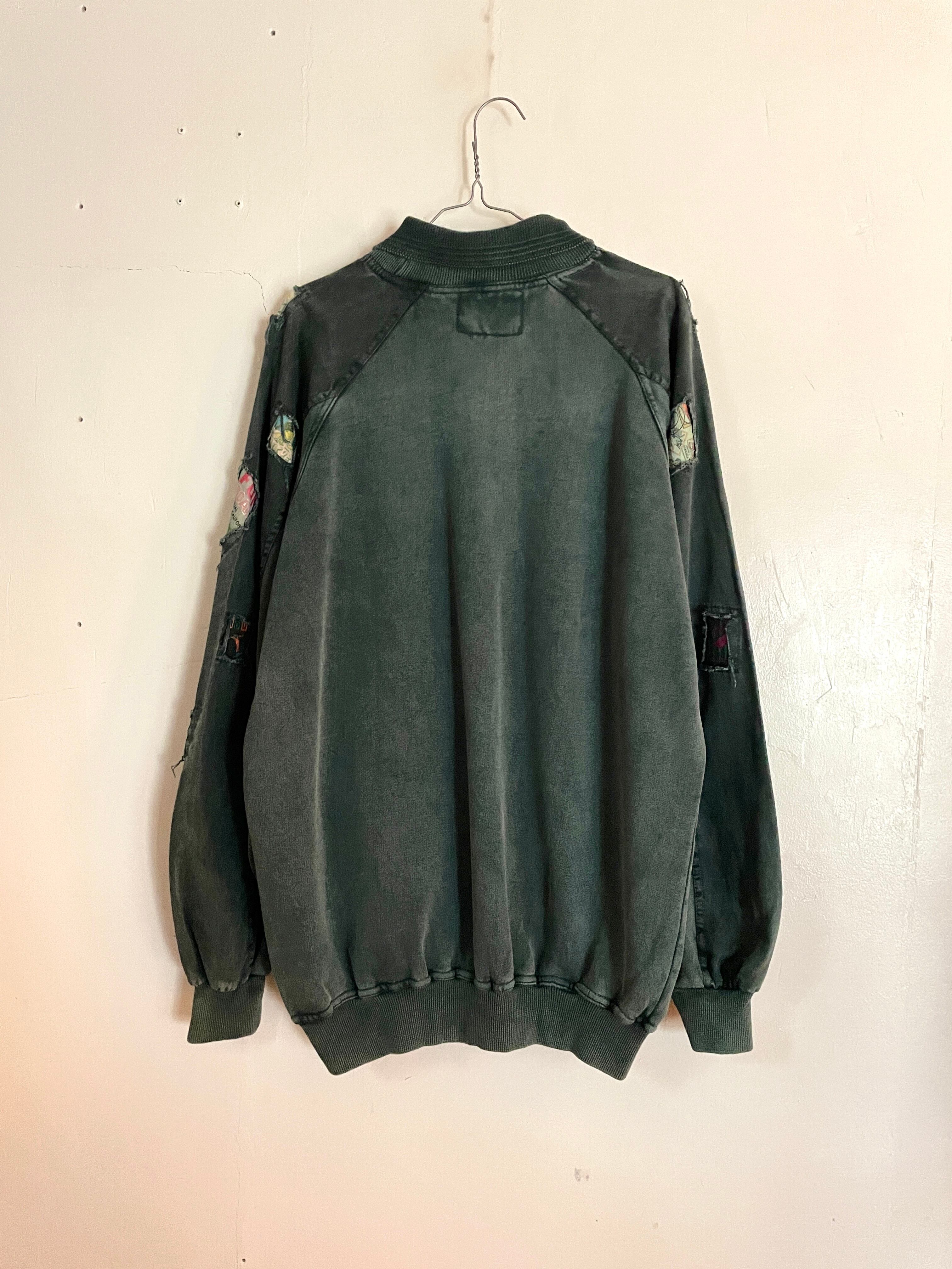 ややグレーがかったグリーンのような独特なカラーで、スウェット地と布帛素材で組み合わされた襟付きトップス。ボディ部分は一般的なスウェット素材が使われており、袖部分はシャツに使われるようなしっかりめの素材が使われています。所々柄の入った素材がはめ込まれていてポップな印象。センスのある、お洒落で面白い一枚です。