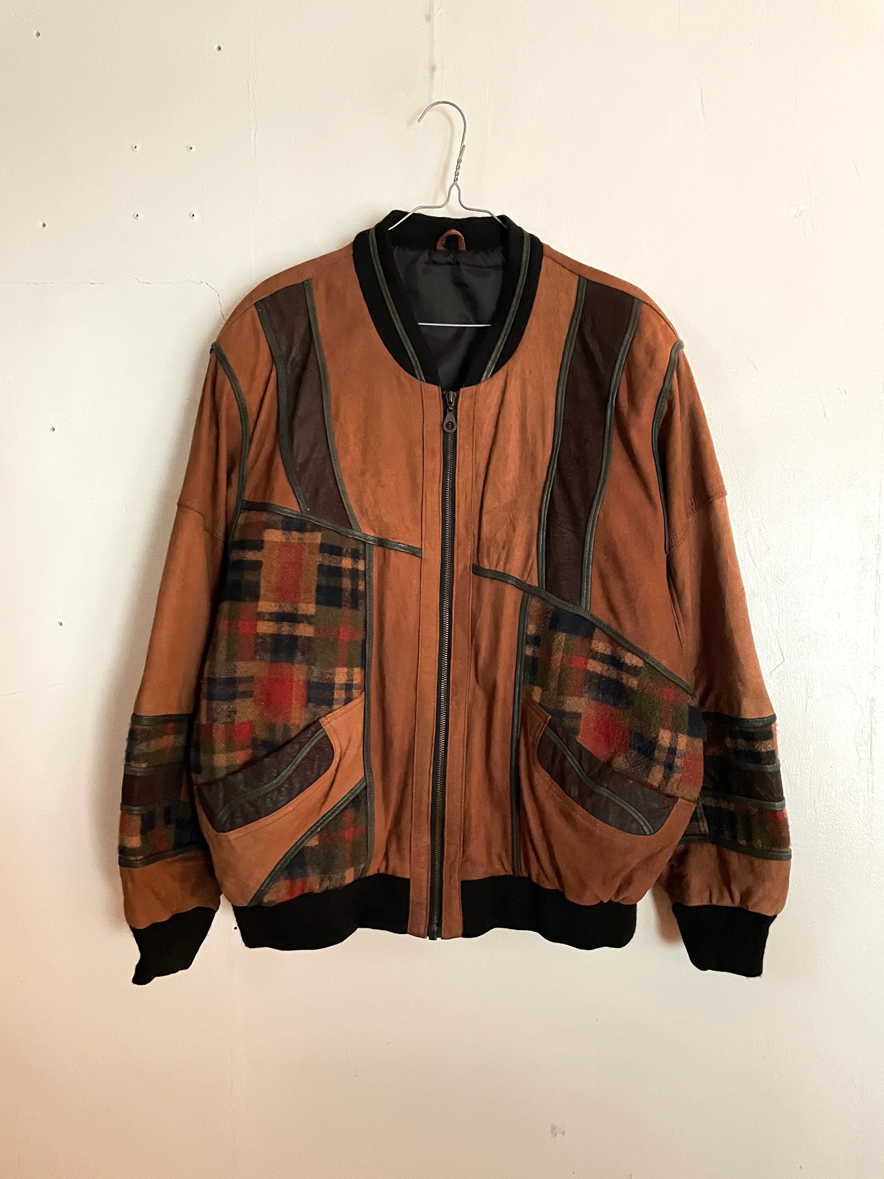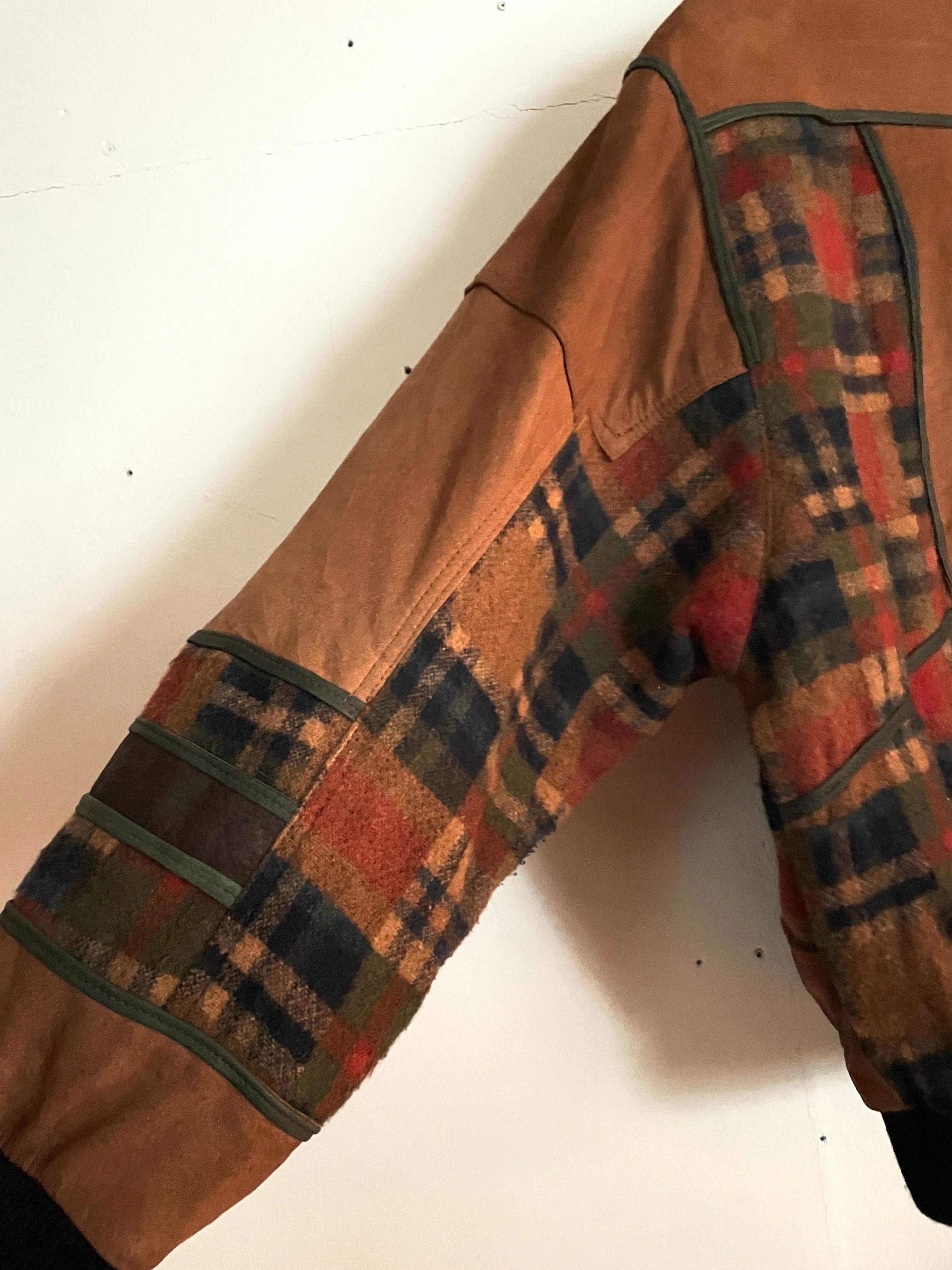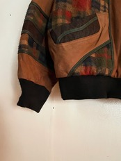 ブラウンのラムレザーに、チェック柄の素材が部分的に使われたデザインレザージャケット。ウール素材のような毛羽感のある暖かみのあるチェック素材です。レザー自体も部分的に切替えられ、切替え部分にはレザーでパイピングがされていたりと、非常に細かい作りです。一般的なレザージャケットとはちょっと違う、個性的な一着。