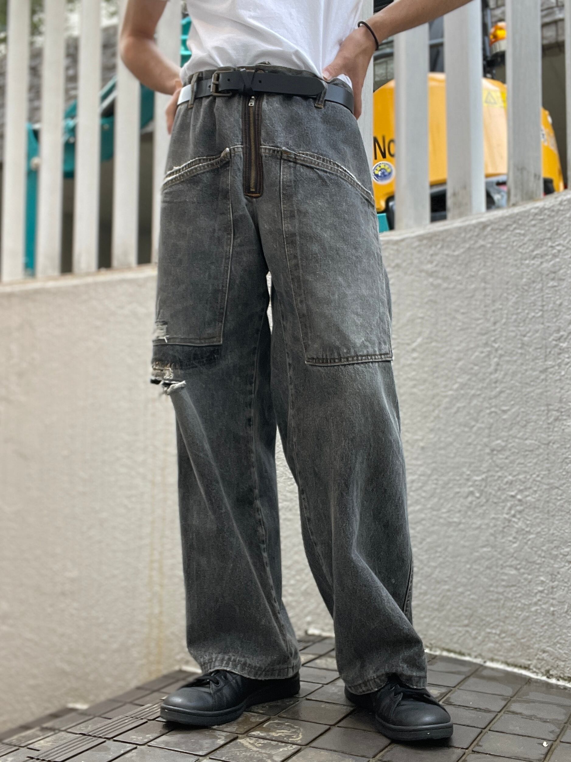 剥き出しのファスナーに大きな前ポケット、ジップ付きの特徴的なバックポケットに刺繍と大胆なデザインが目を惹く、アルマーニジーンズのデニムパンツ。ゆったりとしたシルエットで、いい感じのスレた色味、右膝あたりにダメージが見られます。リペアの為に右ポケットの下部分を少しずらしているようで、そこにできた色味の差も偶然の産物といった感じで面白いです。アルマーニジーンズを使ったオリジナルリメイクっぽい雰囲気も若干感じますが、人とは違う、個性的なデザインデニムパンツです。左バックポケットのジップトップが欠損しています。