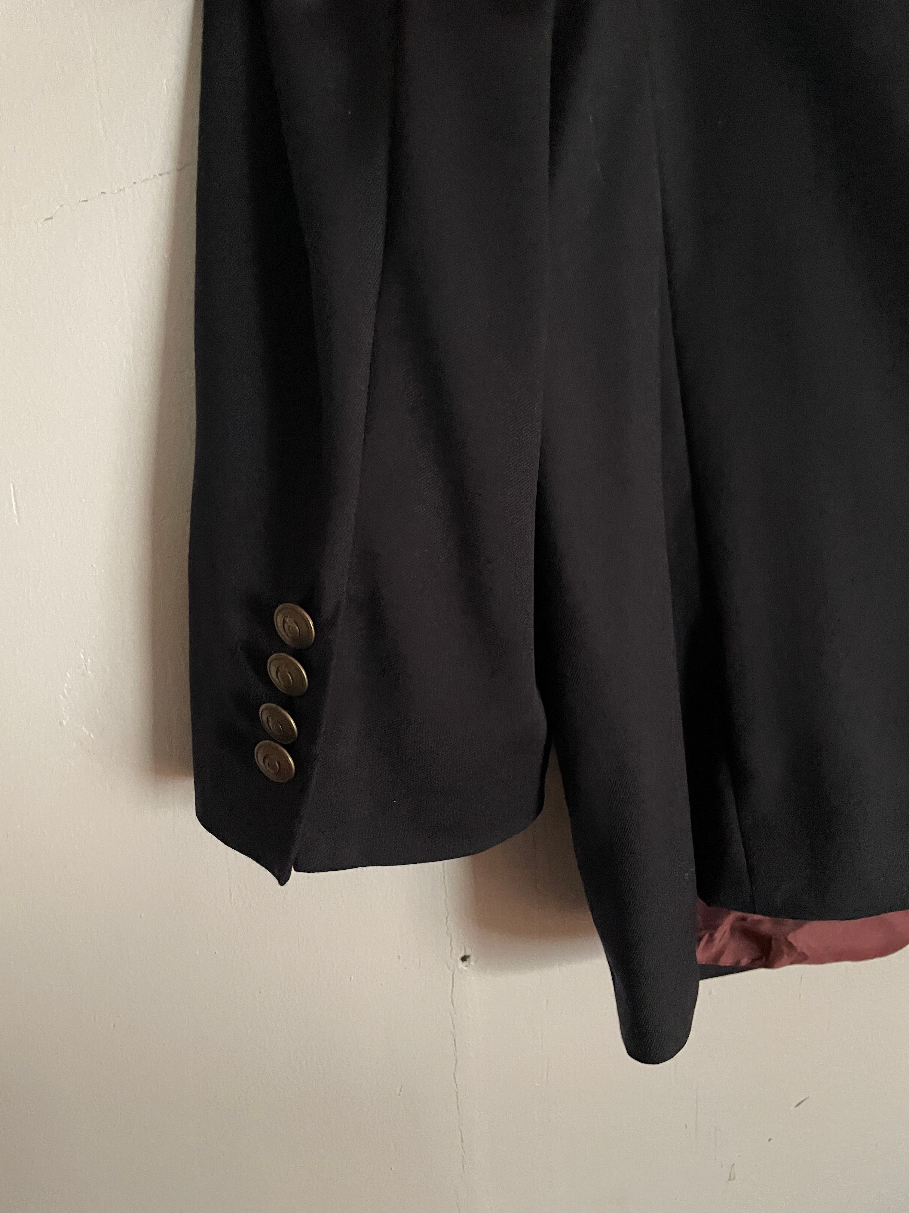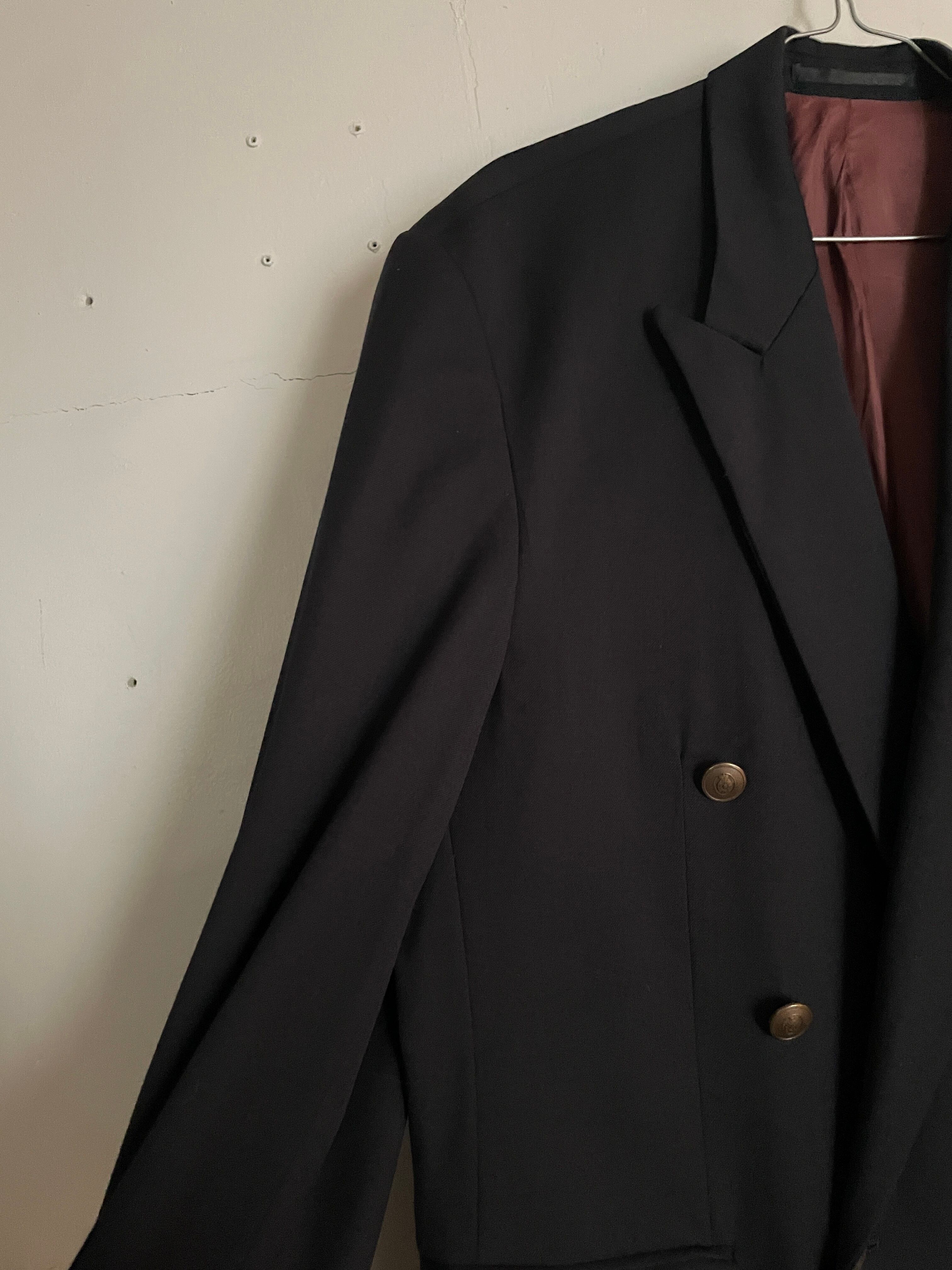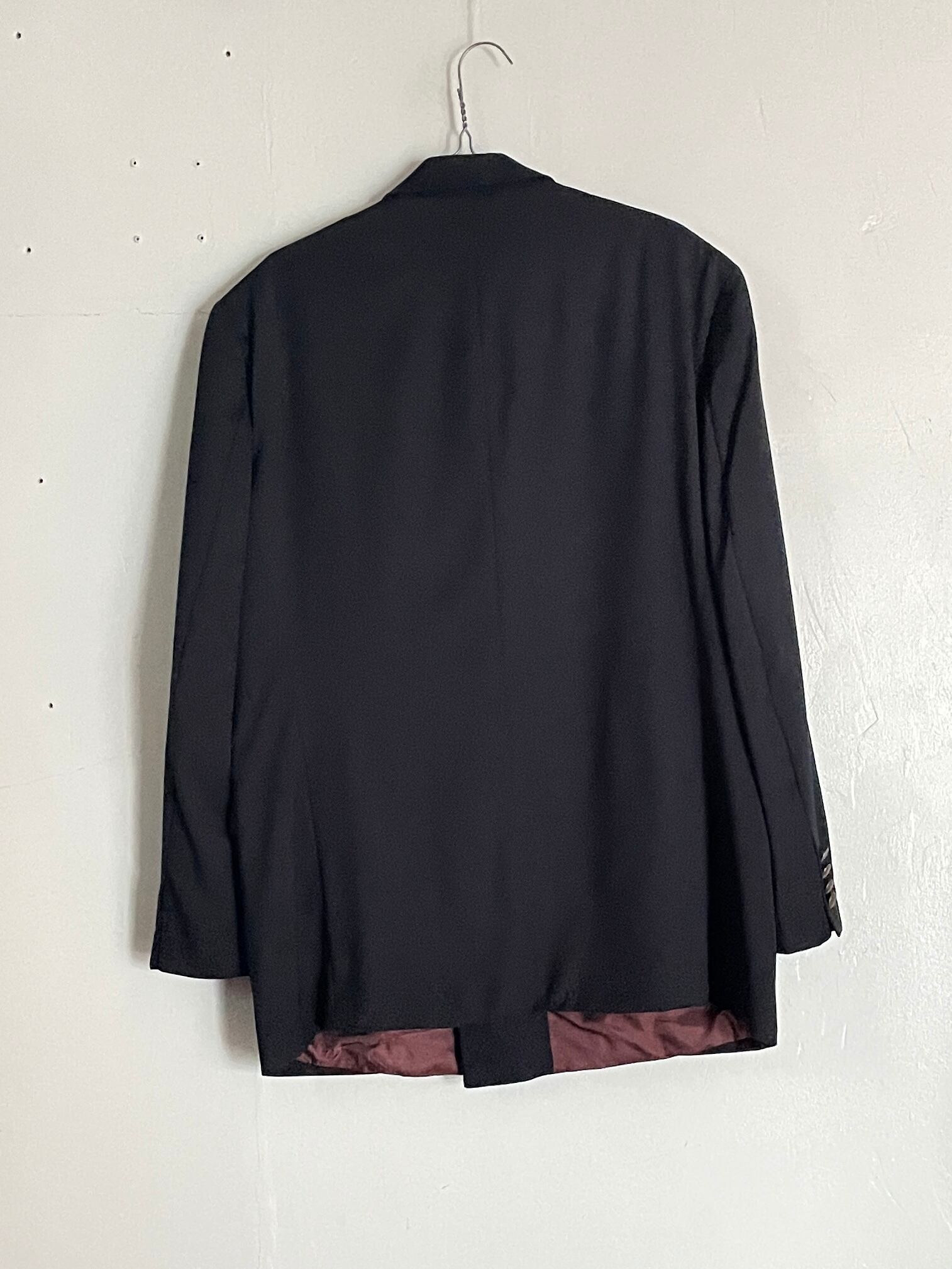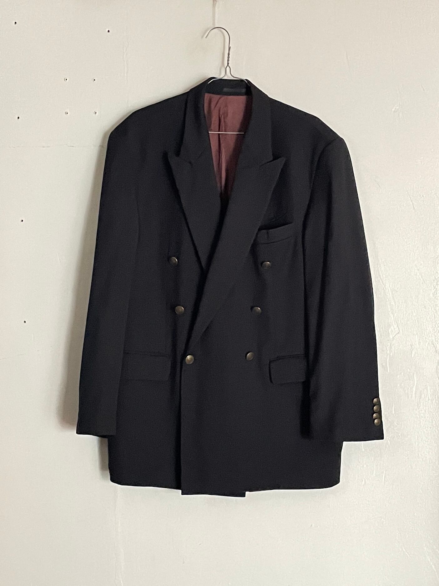 質の良いウール素材で、上品なブラックボディーのテーラードジャケット。ダブルタイプで文句無しでかっこいいディテール。裏地は色っぽさの感じられるワインレッドで、ポケットも豊富。ファッションによって様々な使い方のできる一着です。ゆったりと着られるサイズ感なので、これからの時期アウターとして活躍してくれます。