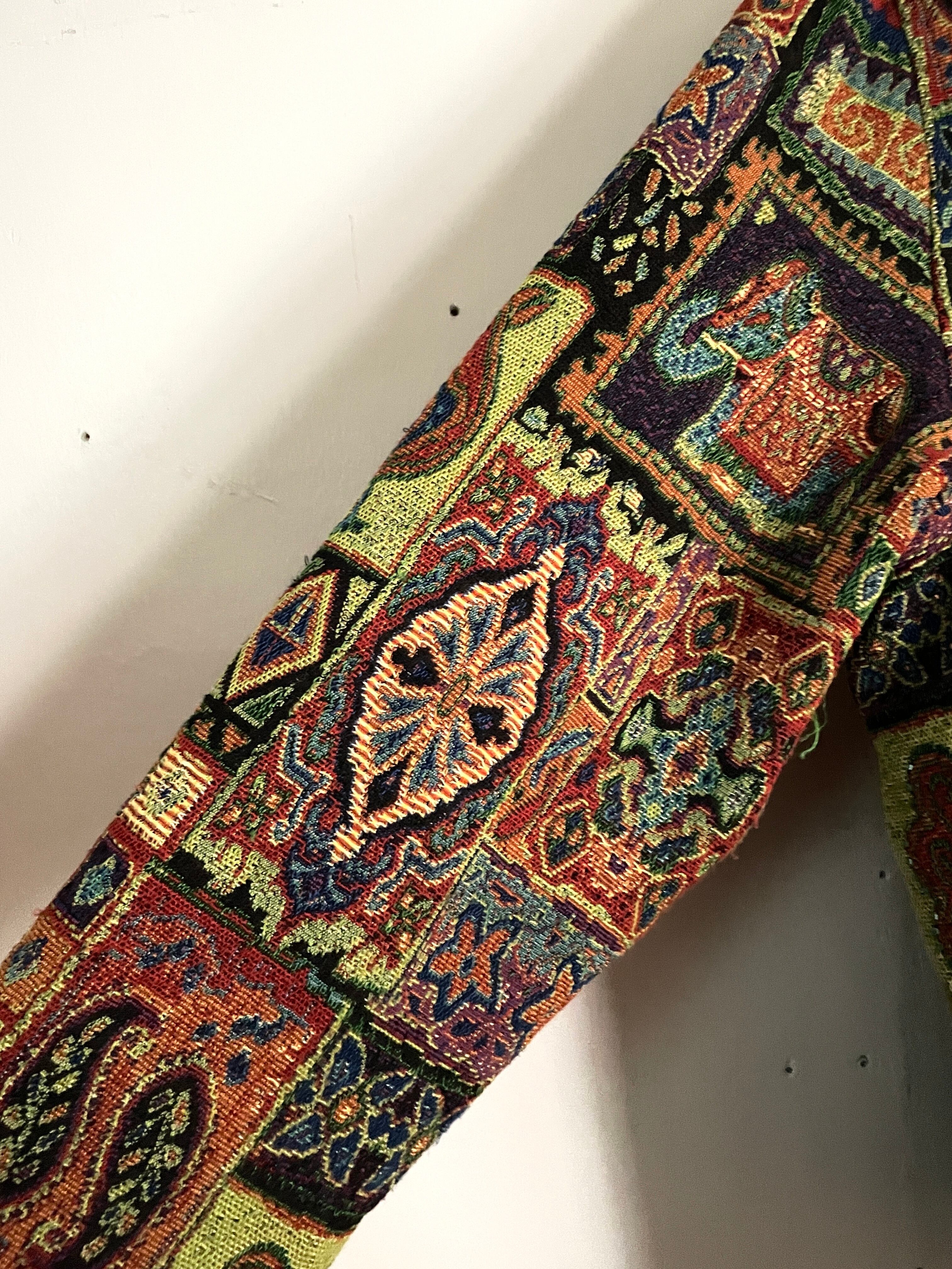 素材の織りによって様々な柄が表現されたデザインジャケット。部分的に柄の上に重ねてビーズが付けられている部分があります。特徴的なボタンで、両脇にはポケット付き。着丈はやや長めで、身幅の広いゆったりとしたシルエットです。コーディネートのメインを張れる、個性的な一着です。