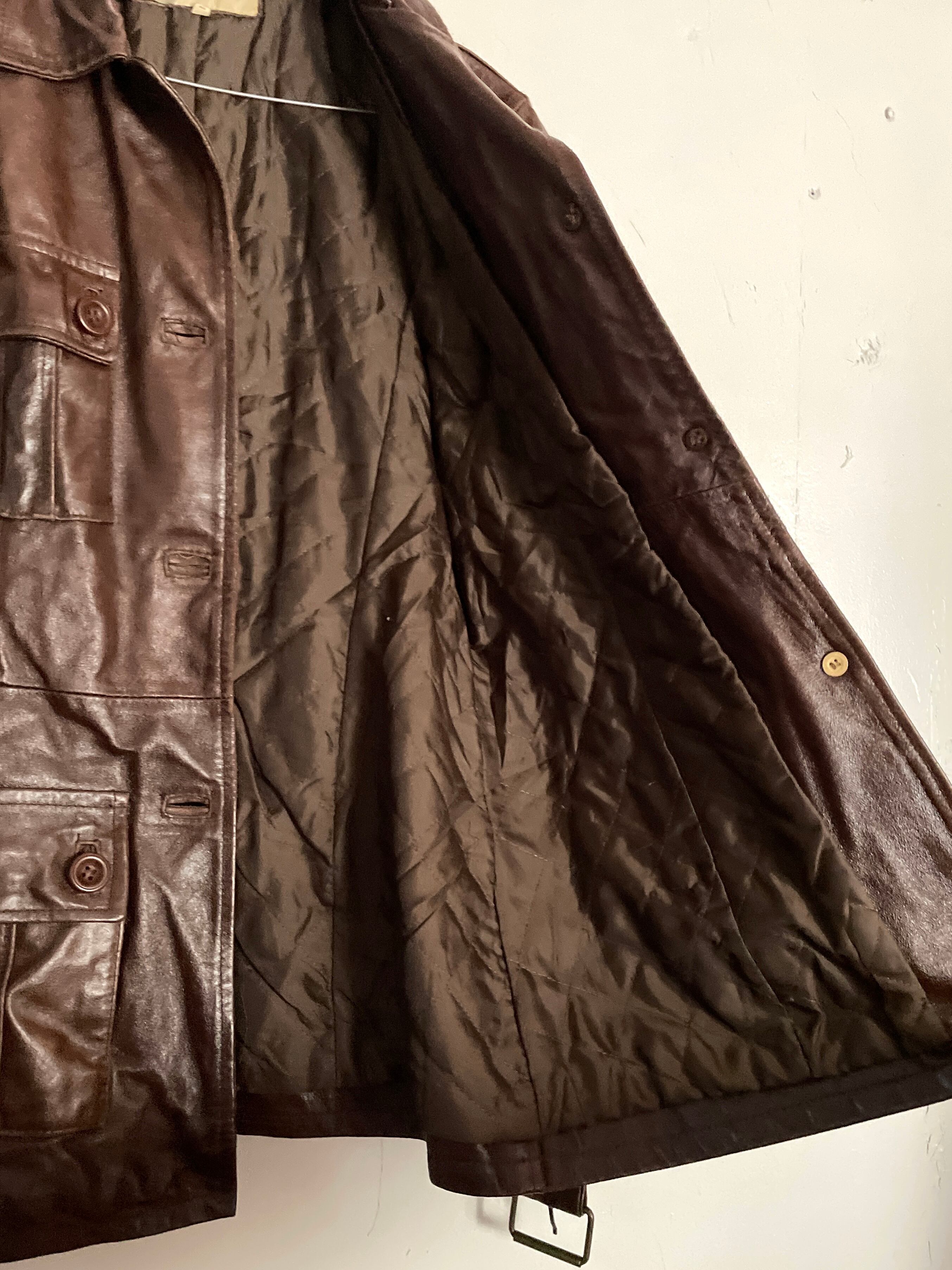 渋めのブラウンでフロントのフラップポケットが特徴的なレザージャケット。歴史ある英国ブランド、ベルスタッフの代名詞とも言える「トライアルマスター」に近いデザインです。両袖にはワッペン付き、左腕のユニオンジャックがアイテムのデザインとマッチしていてかっこいいです。ウエストベルトも装備、しっかりとしたレザーの存在感大の一着です。