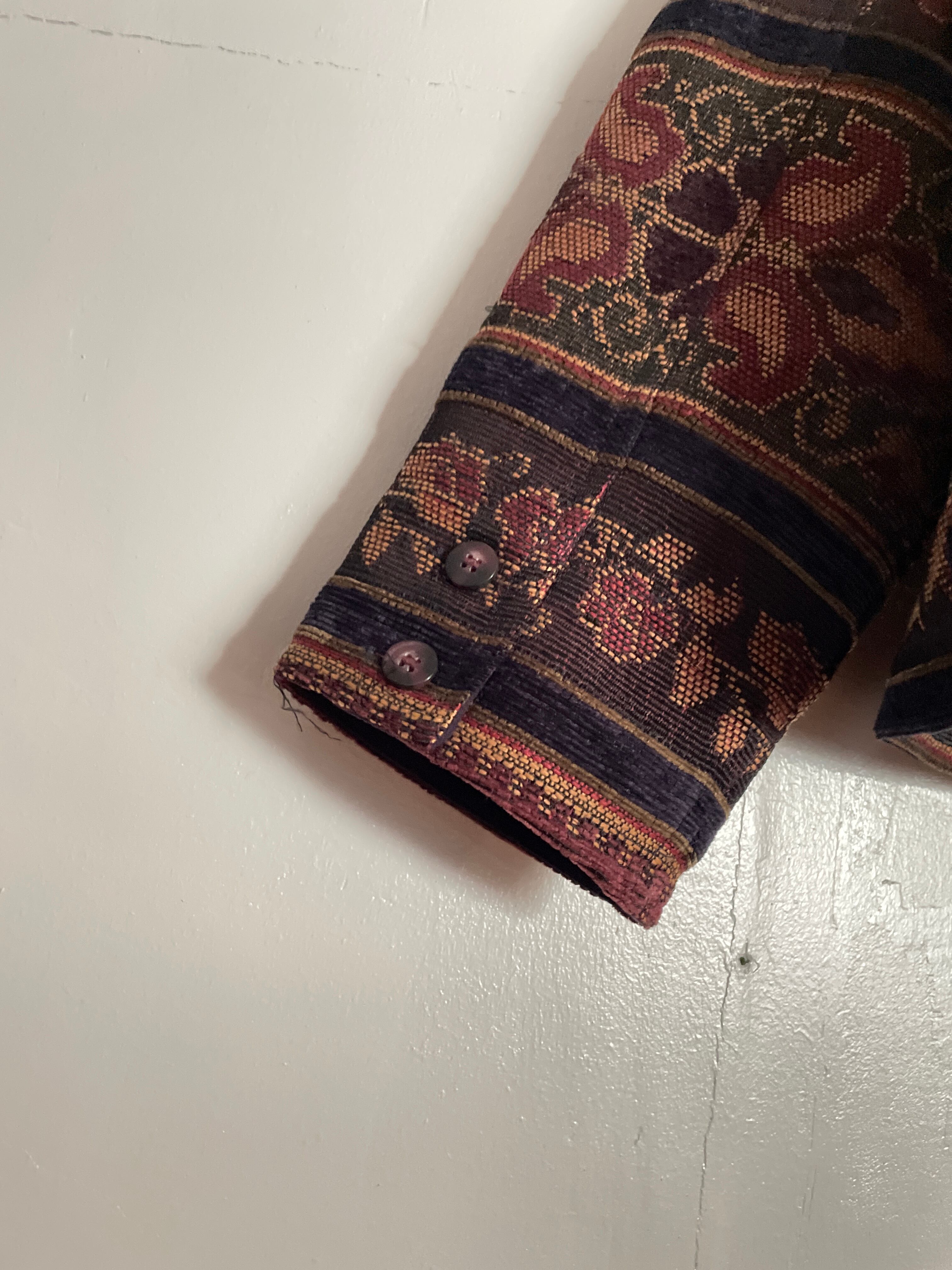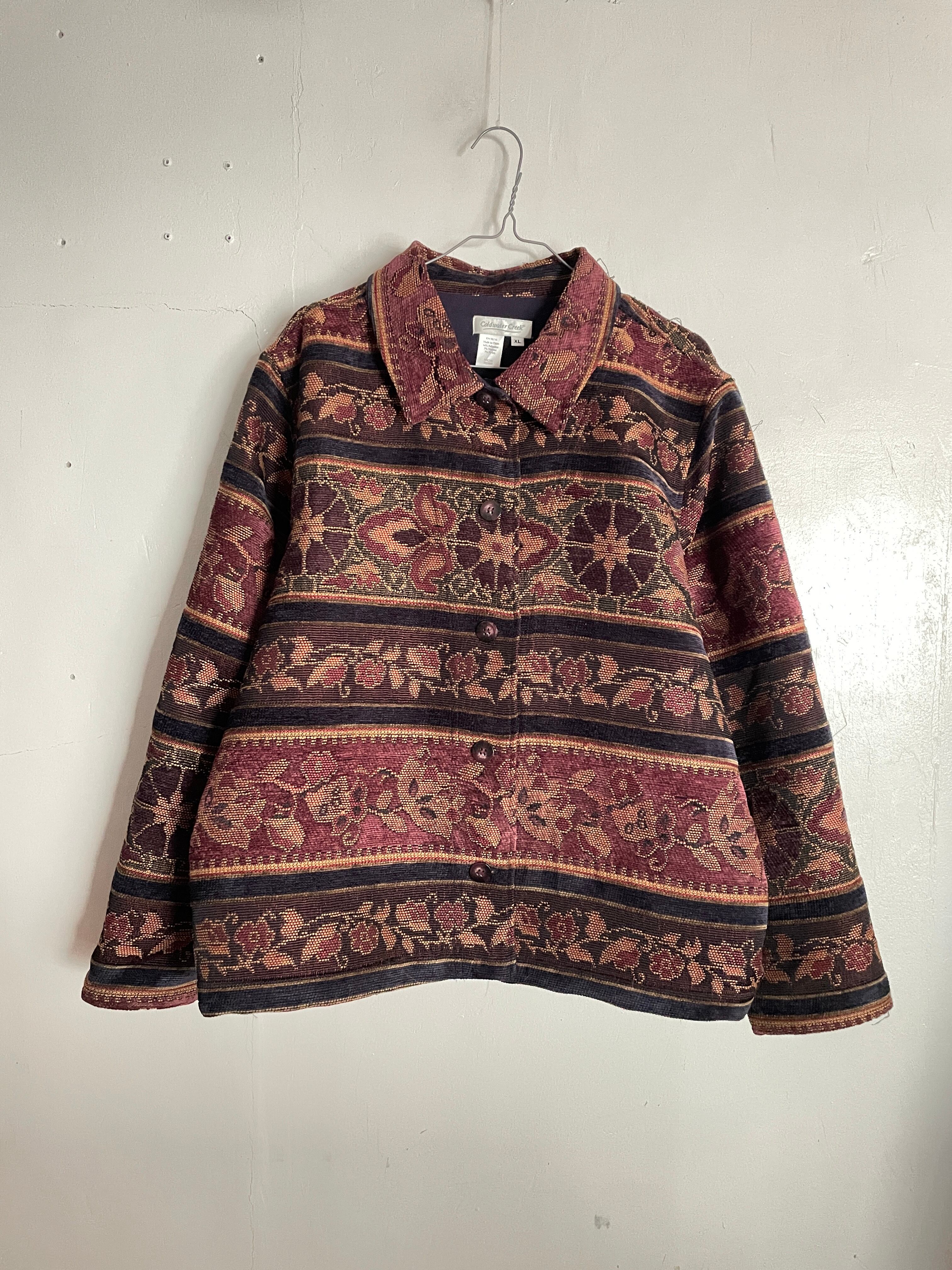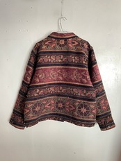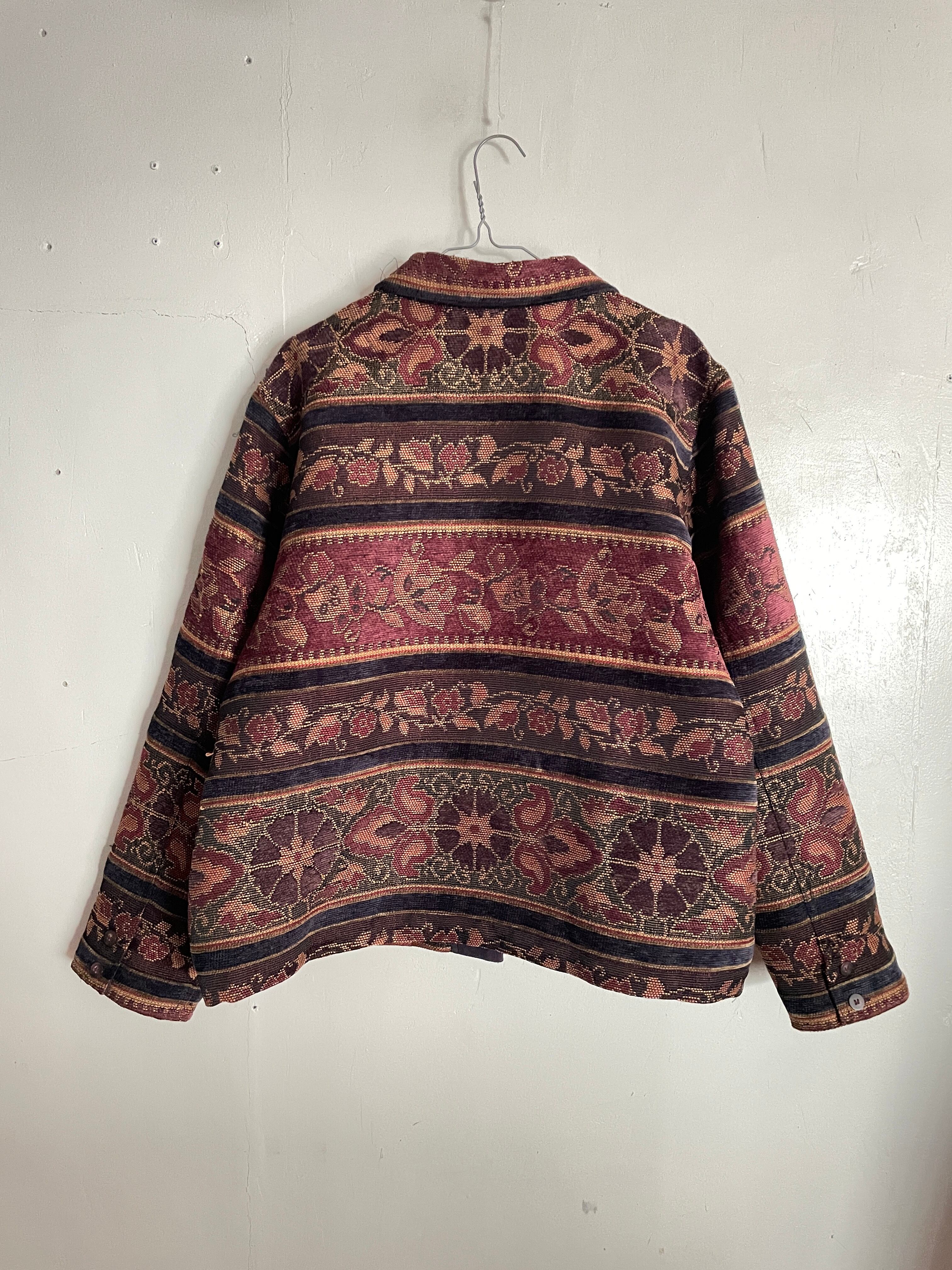 大きめの花柄が素材の織りによって表現されたゴブランジャケット。ブラウンや黒をうまく使った配色がお洒落です。やや短丈気味なシルエットもいい感じ。身幅がかなり広めに取られているので、中にもしっかり着込めます。見た目よりもずっと軽く、ストレスフリーで着れる個性的な1着。