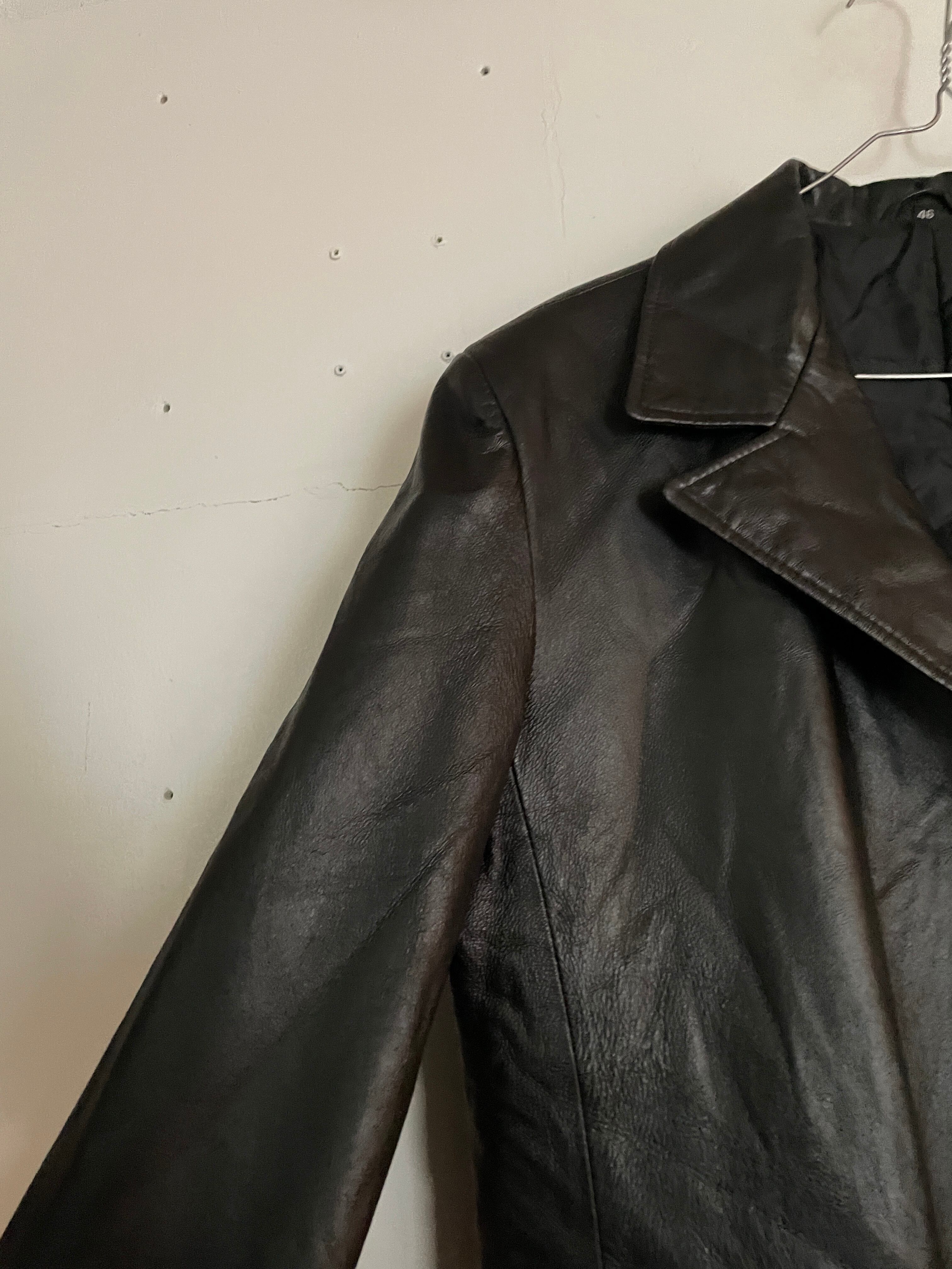 モチっとした高級感のある、レザーコート。レザーならではの良い重量感。タイトめで、シルエットが絶妙に綺麗なのが魅力的です。様々なボトムスとの相性が良さそうです。ボタンが多めだったり、大振りな襟など、細かな部分がお洒落な1着です。裏地はサラッとしたポリ素材なので、着やすさにも長けたアイテムです。