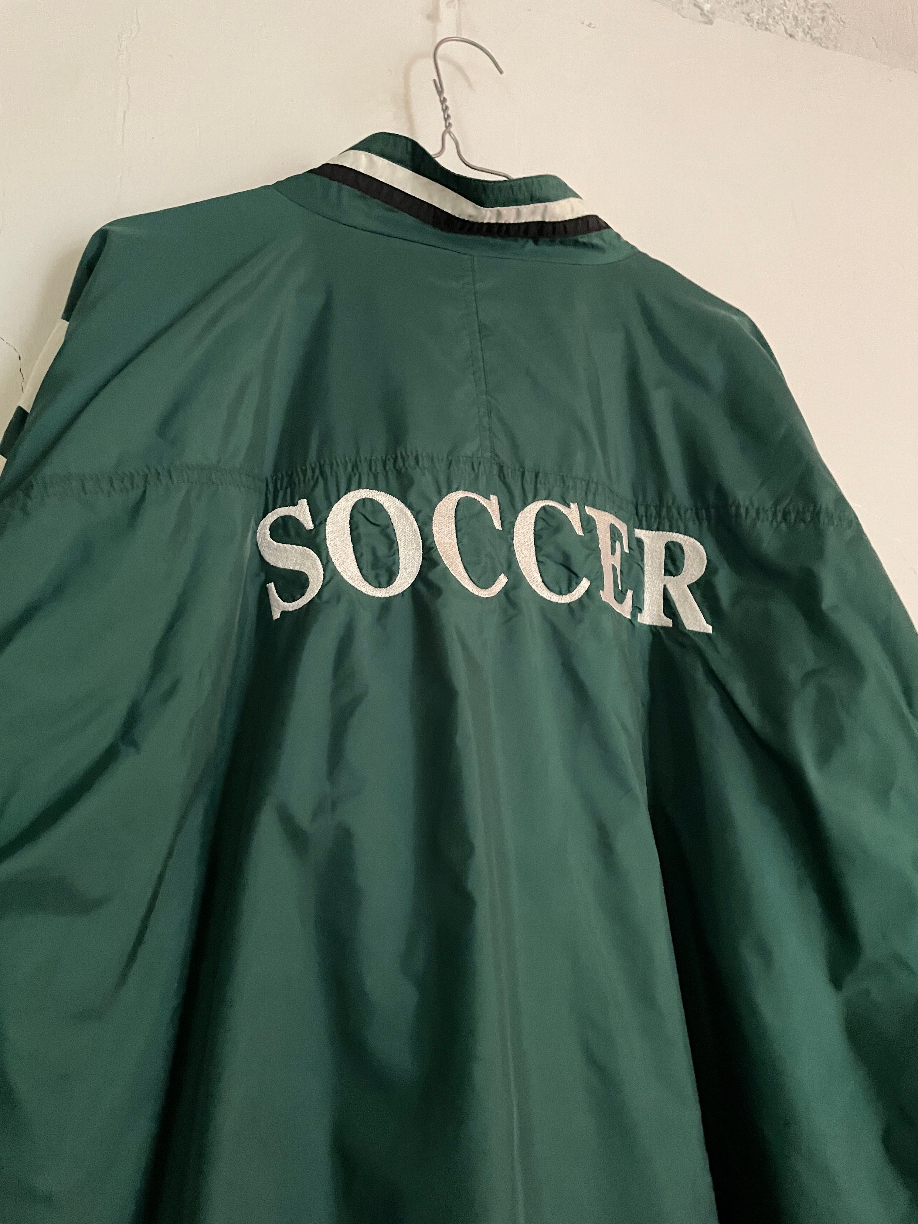 3カラーの配色がお洒落な、アディダスナイロンジャケット。グリーン、ブラックボディーをベースに、ホワイトラインデザインと、スポーティ過ぎないデザインがグッドです。フロント、袖にはさりげないワンポイント刺繍。バックには”SOCCER"の刺繍。ゆったりと着られるサイズかんで、男女共におすすめできるアイテムです。