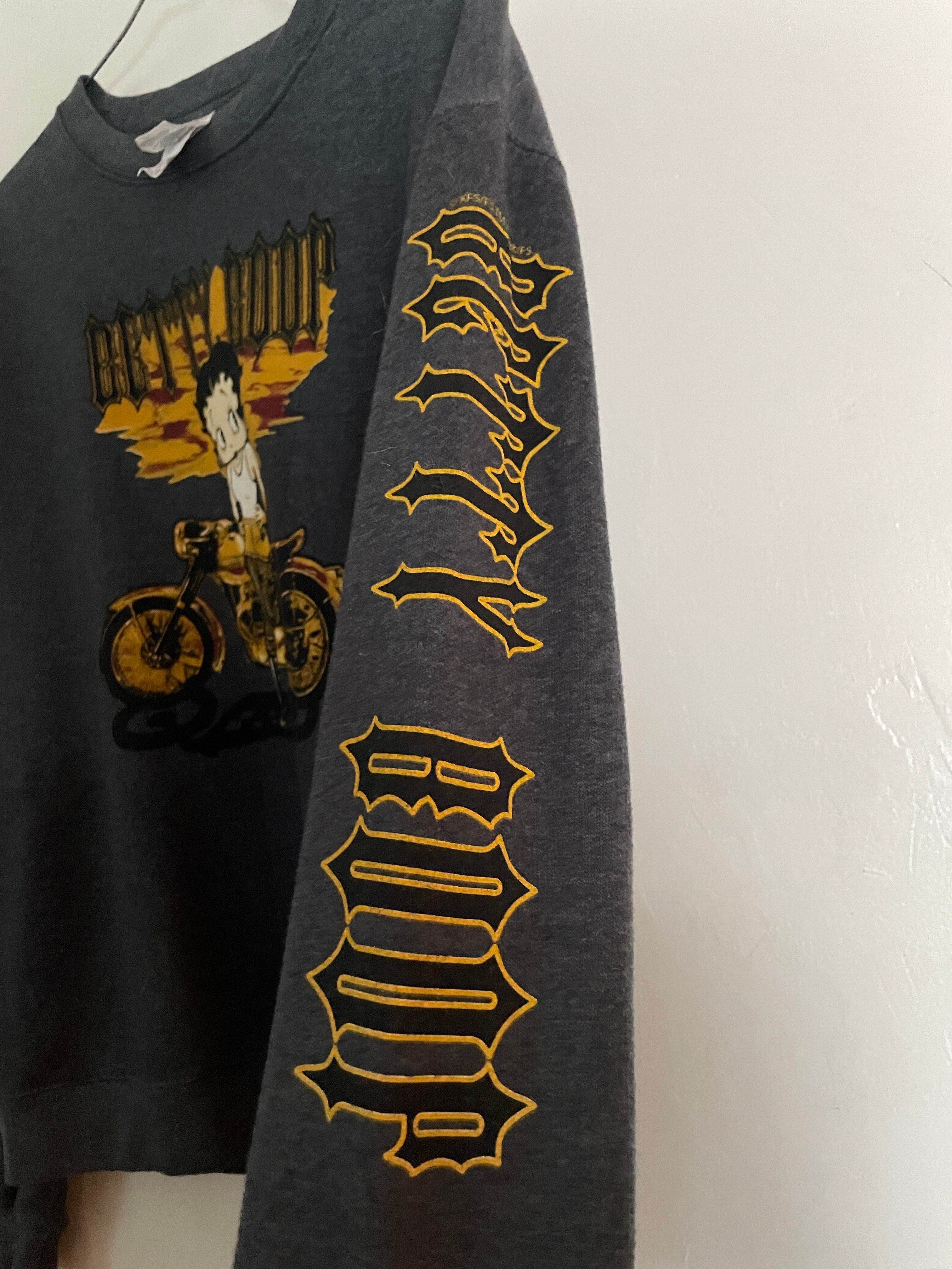 ダークグレーボディーに、夕焼けをバックに、かっこいいバイクに寄りかかったベティ・ブープがプリントされたスウェット。ベティのファッションと夕焼けの色味を合わせているのが可愛らしいです。左袖にはベティのネームプリント入り。タイトめなサイズ感で、Y2Kな雰囲気を感じられるディテールです。一枚でも、インナーとしても活躍してくれる1着です。